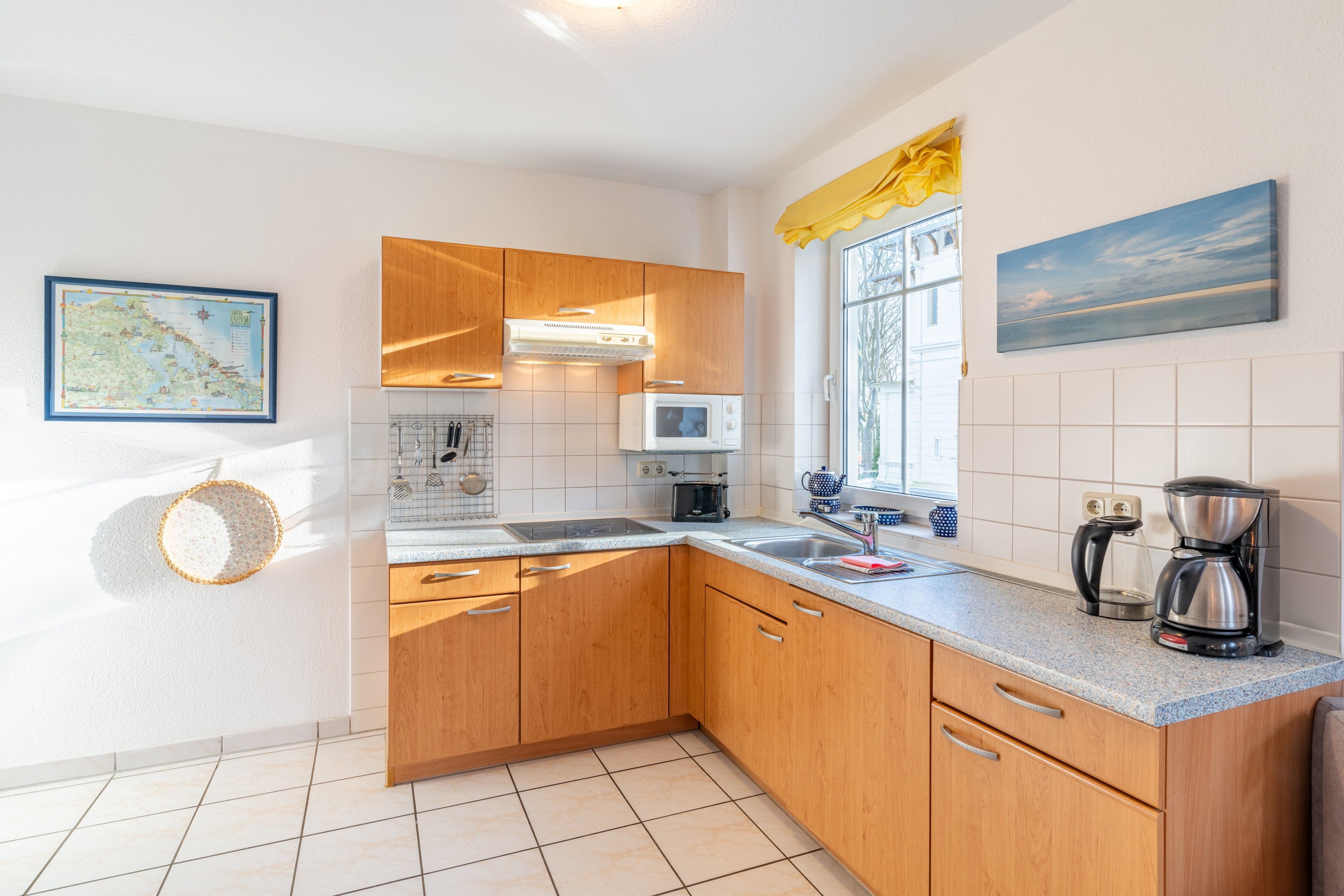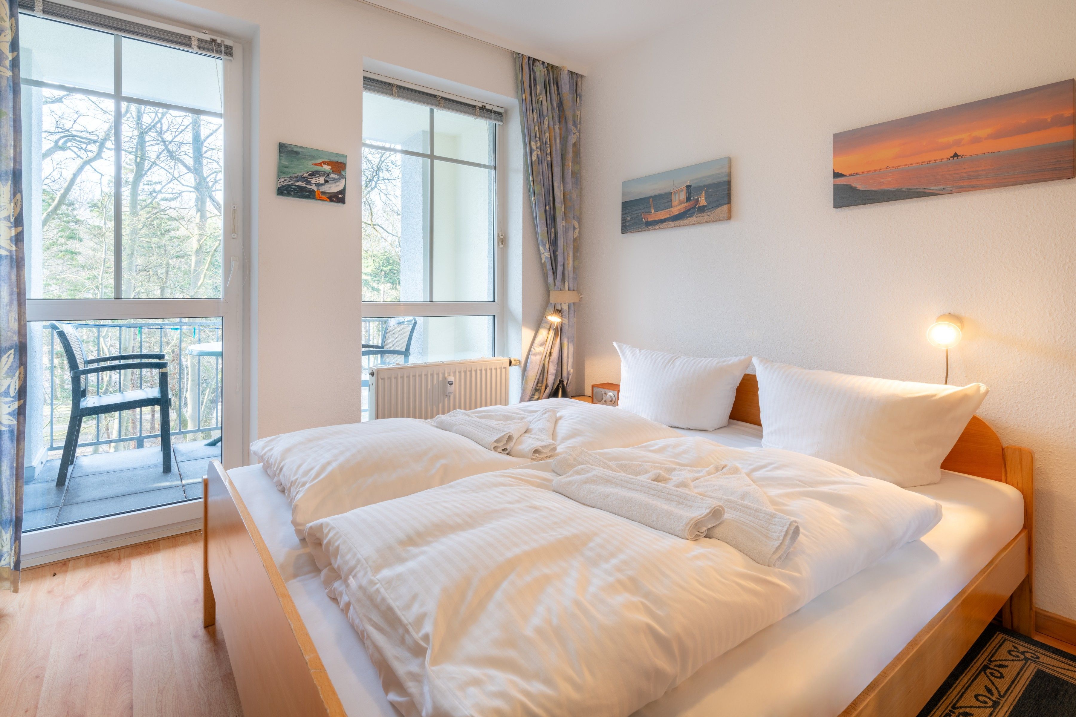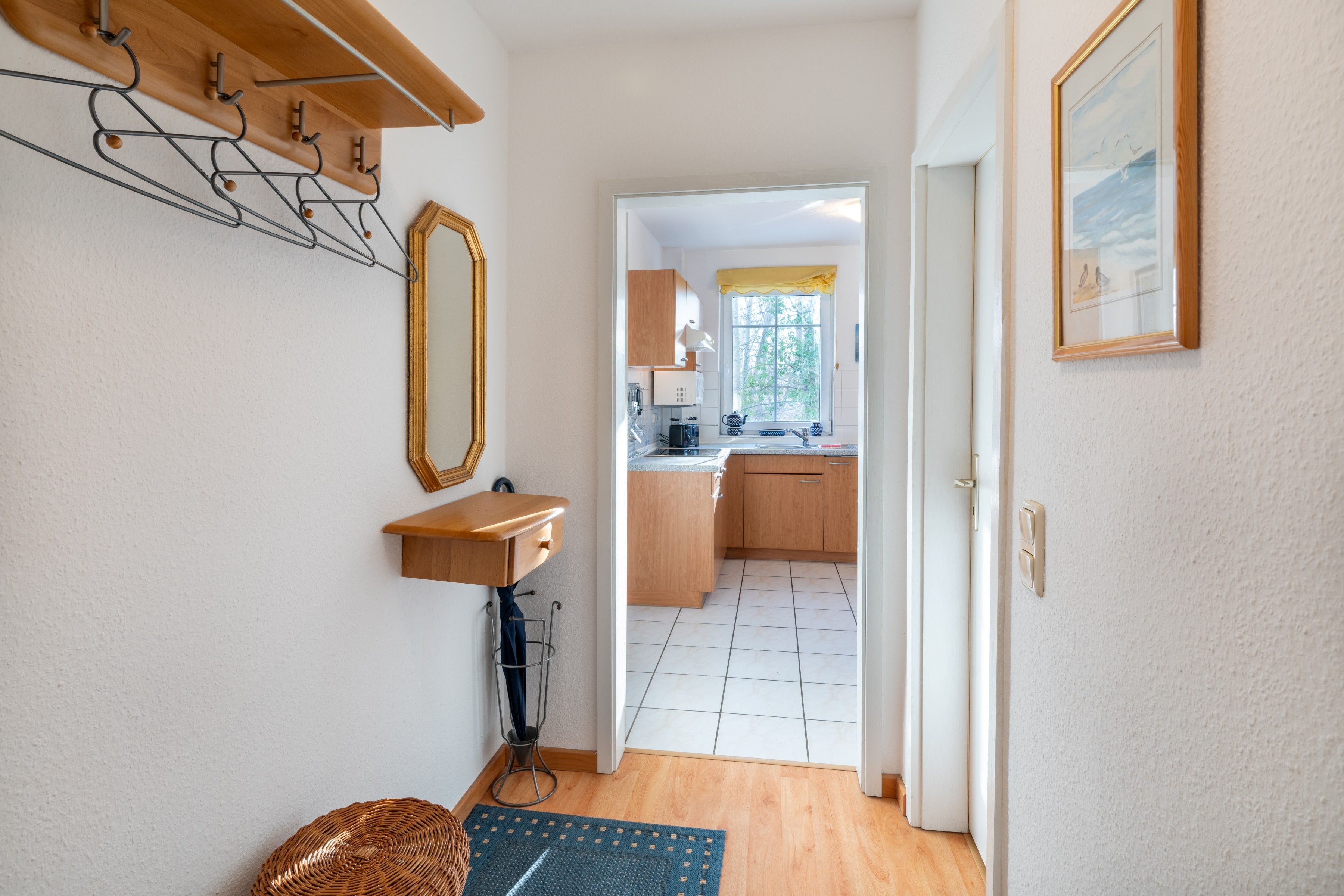 Die individuelle Ferienwohnung befindet sich im 1. Obergeschoss und verfügt über ein Schlafzimmer mit Doppelbett, ein Wohn-/Schlafraum mit einer Doppelbettcouch (Schlafmöglichkeit für eine weitere Person), sowie Kabel-TV und Radio DVD-Player mit einigen CDs und DVDs zu ihrer Verfügung. Für Leseratten gibt es eine kleine Bibliothek und auch jede Menge Spiele. Die offene Wohnküche ist eingerichtet mit einem 4-Platten-Ceran-Herd (ohne Backofen), Mikrowelle und Kühlschrank. Das Bad ist mit einer Badewanne mit Duschwand ausgestattet. Der Westbalkon liegt zur Parkseite und lädt mit Tisch und Stühlen zum Essen ein.