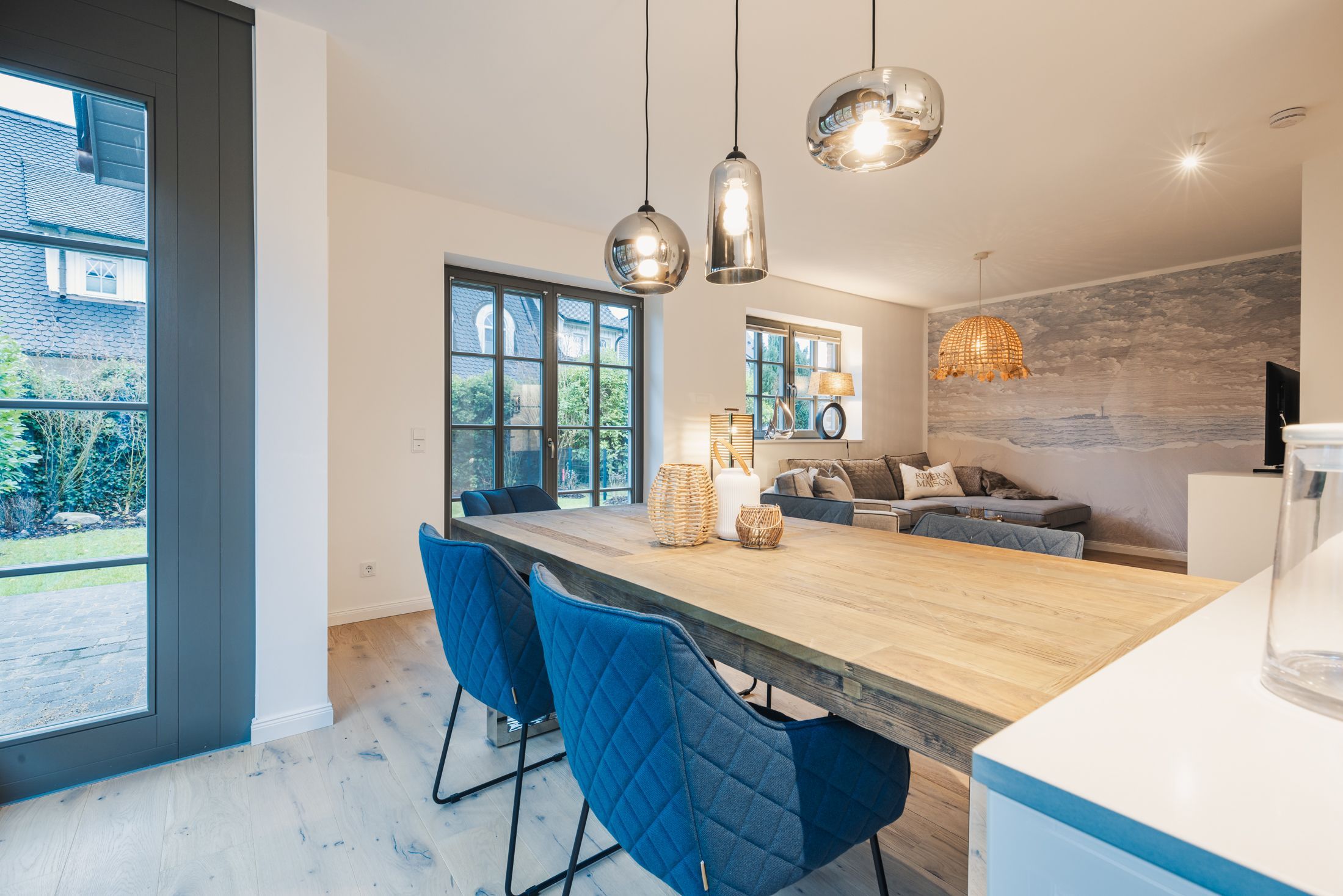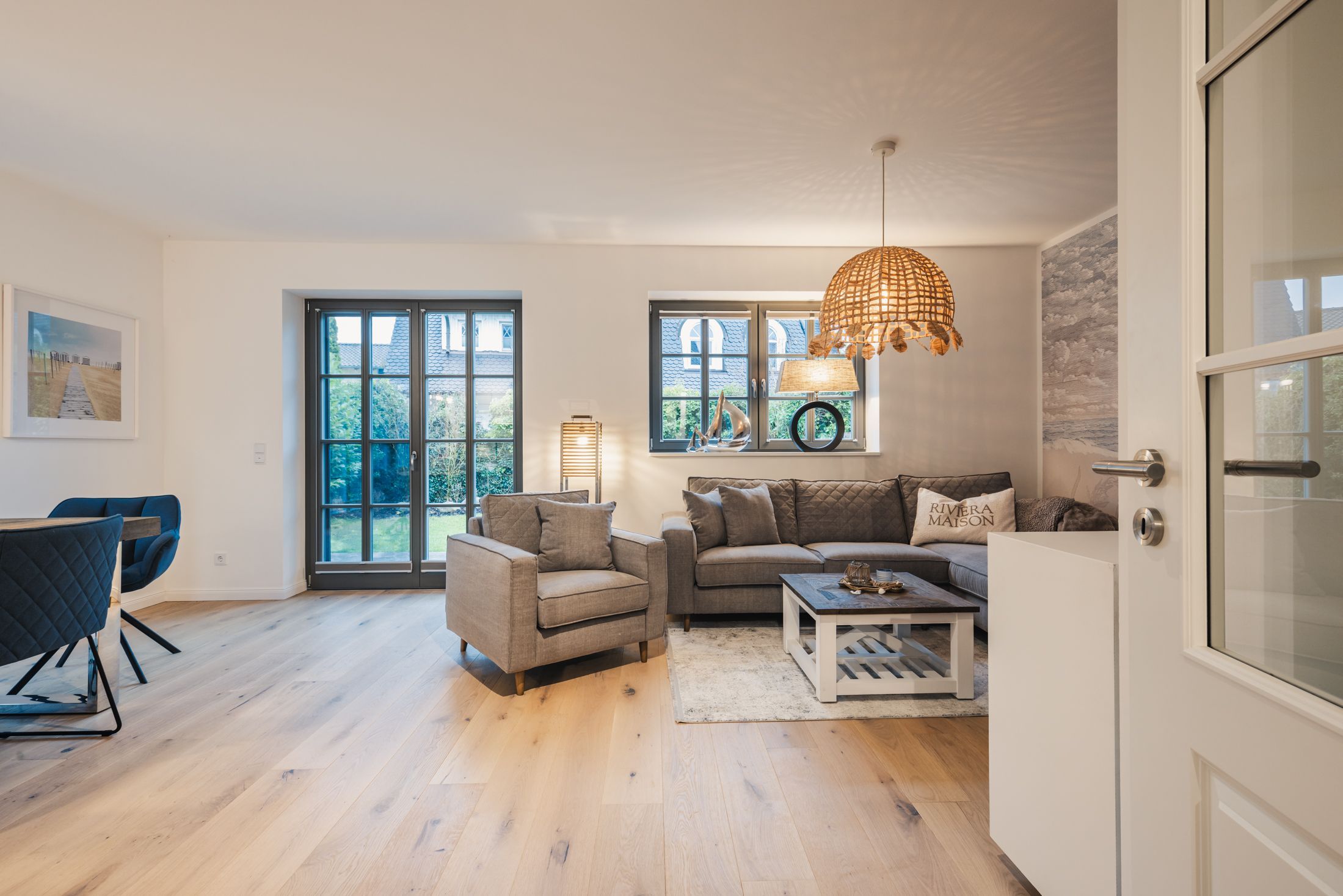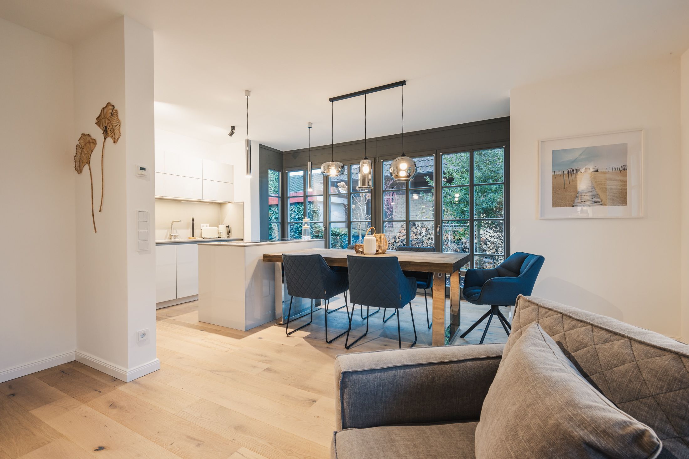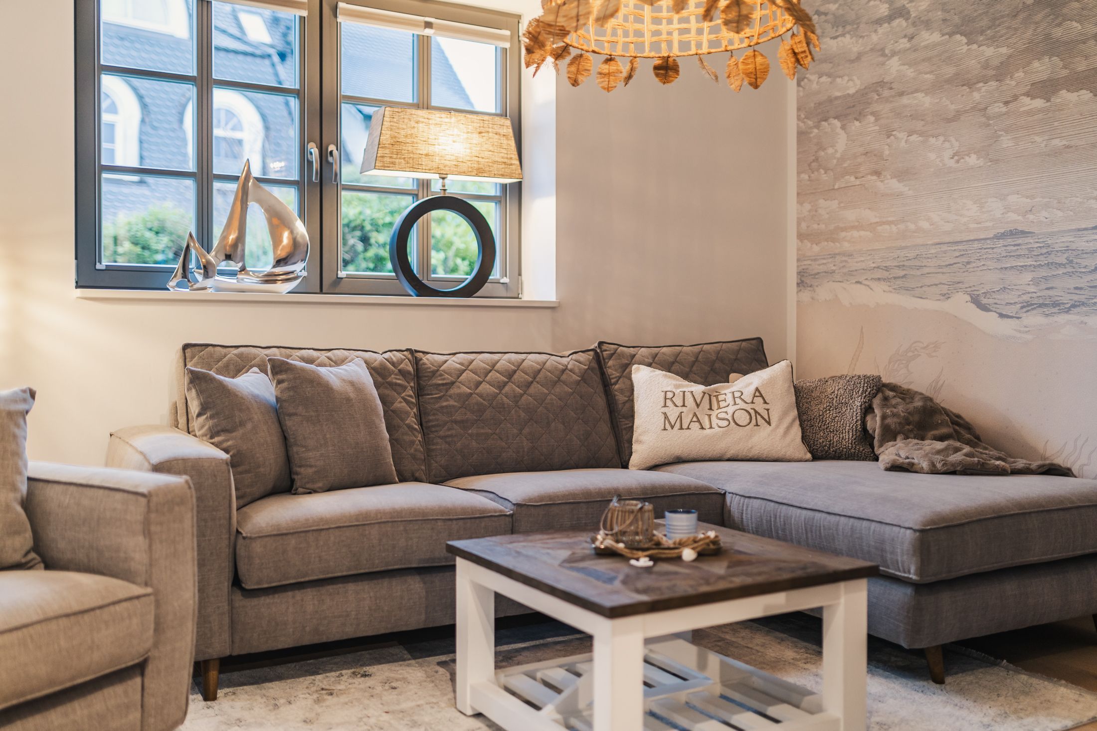 Das Ferienhaus ist gemütlich und komfortabel eingerichtet, um Ihren Aufenthalt so angenehm wie möglich zu gestalten. Der offene Wohnbereich verfügt über eine einladende Sofalandschaft, einen Esstisch und große Fenster, die viel Tageslicht hereinlassen. Die Küche ist mit einer Kochinsel versehen sowie mit modernen Markengeräten wie einem Geschirrspüler, Backofen und einer Kaffee Kapselmaschine.