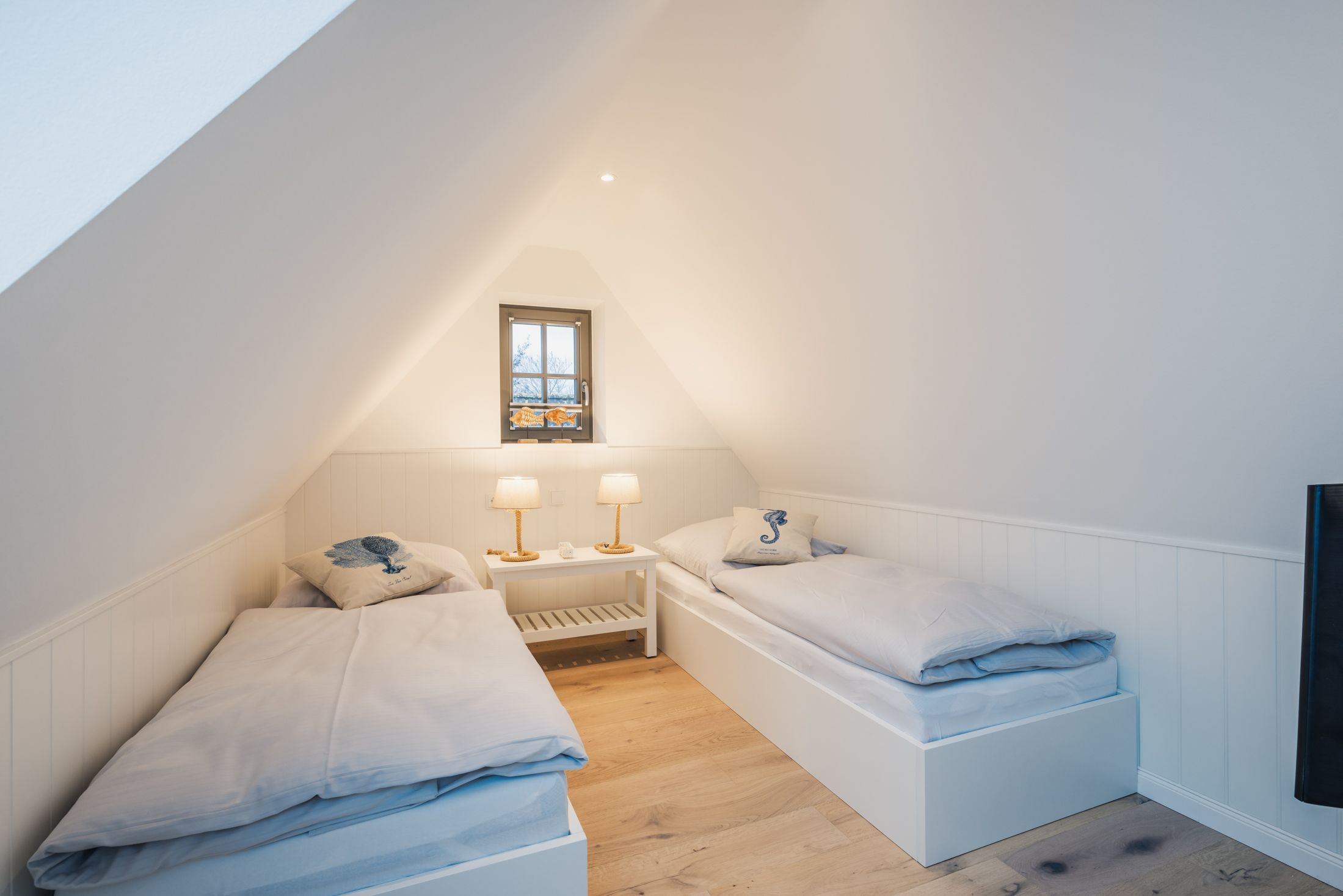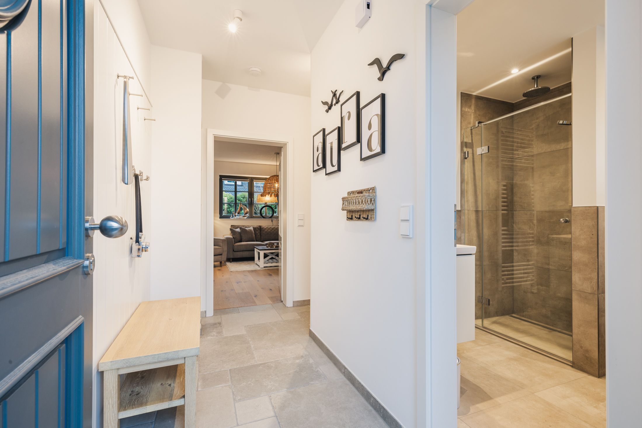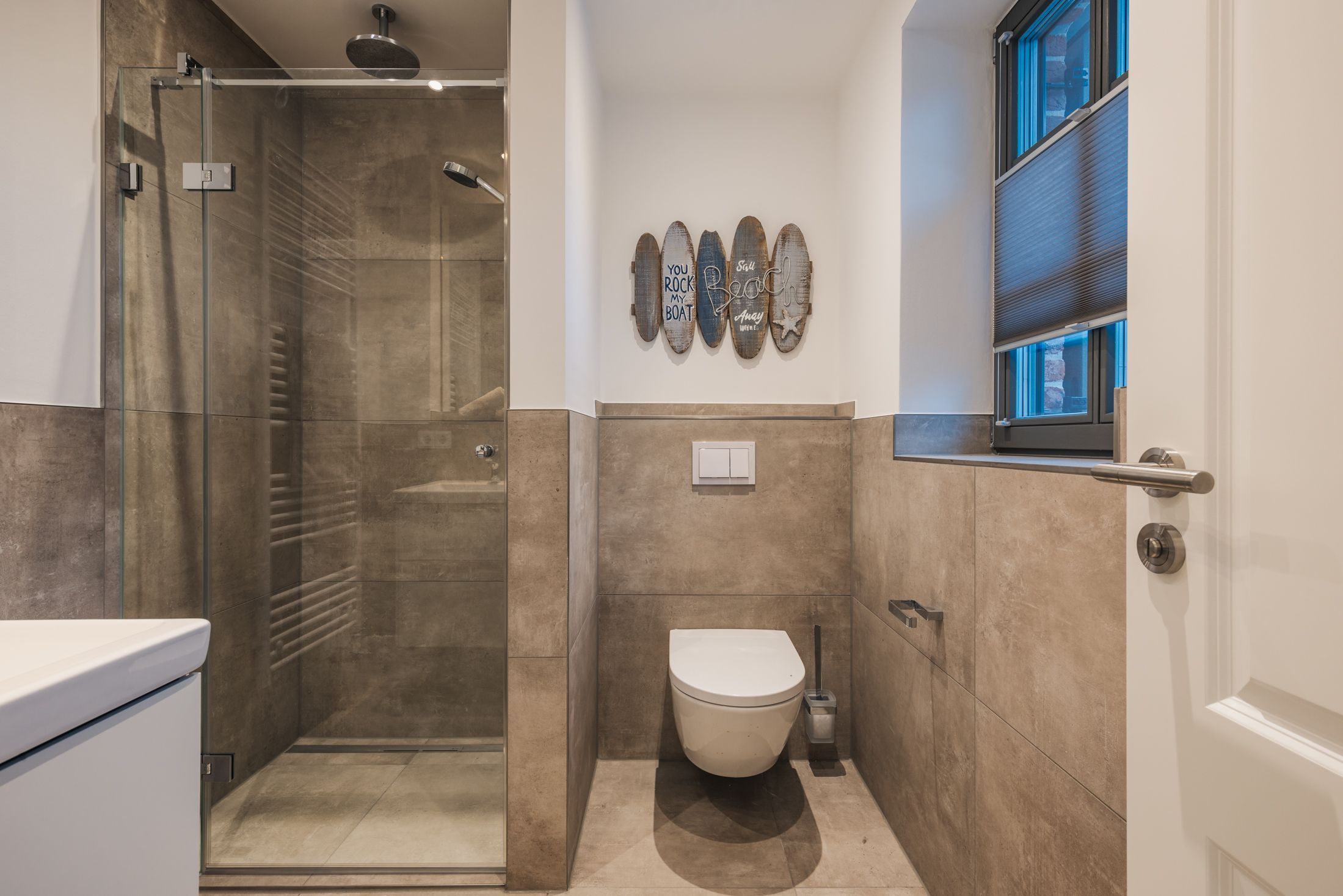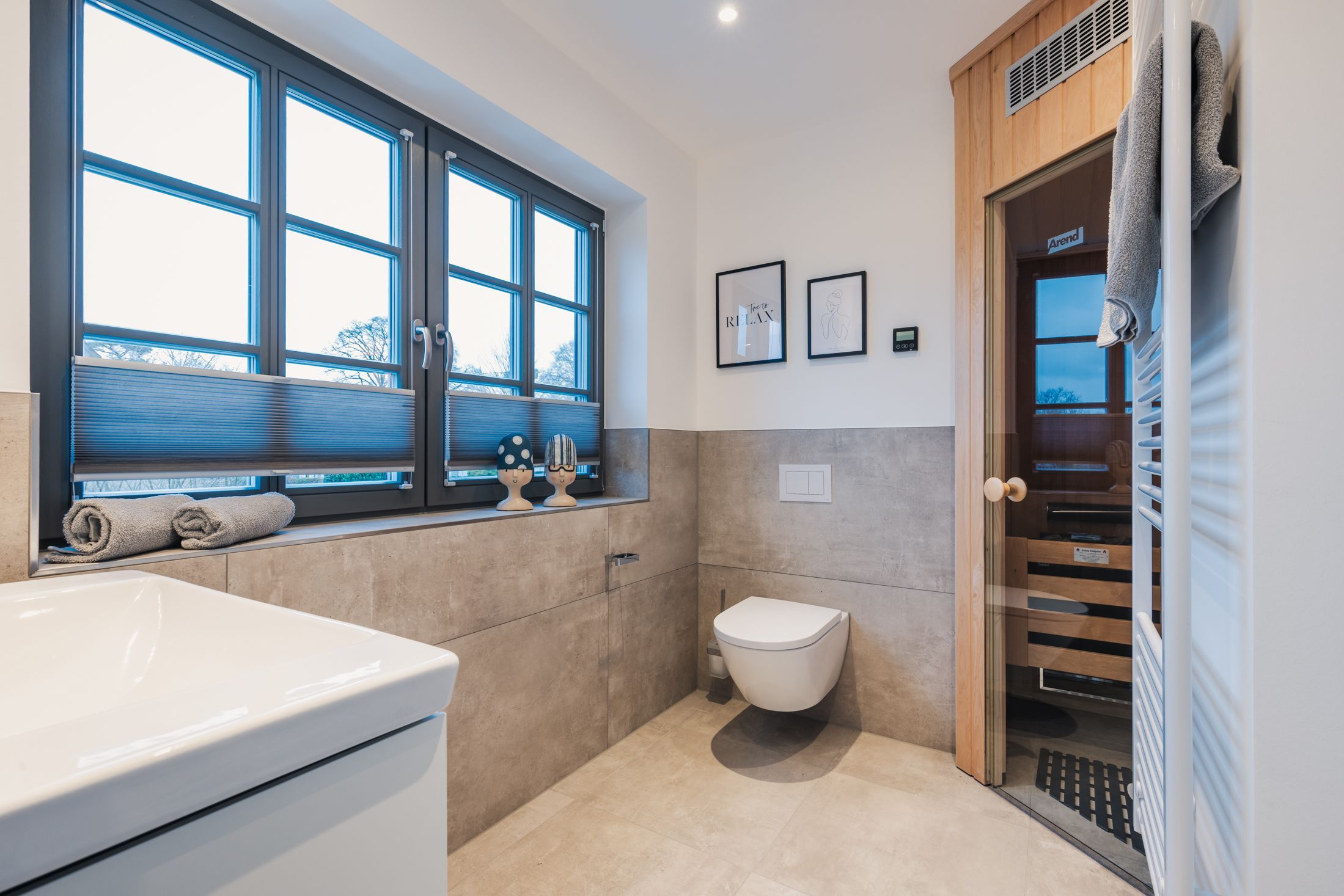 Das Ferienhaus verfügt über zwei moderne Badezimmer, die beide mit geräumigen Duschen und hochwertigen Armaturen ausgestattet sind. Das Hauptbadezimmer bietet zusätzlich eine entspannende Sauna, in der Sie die Wärme genießen und neue Energie tanken können.