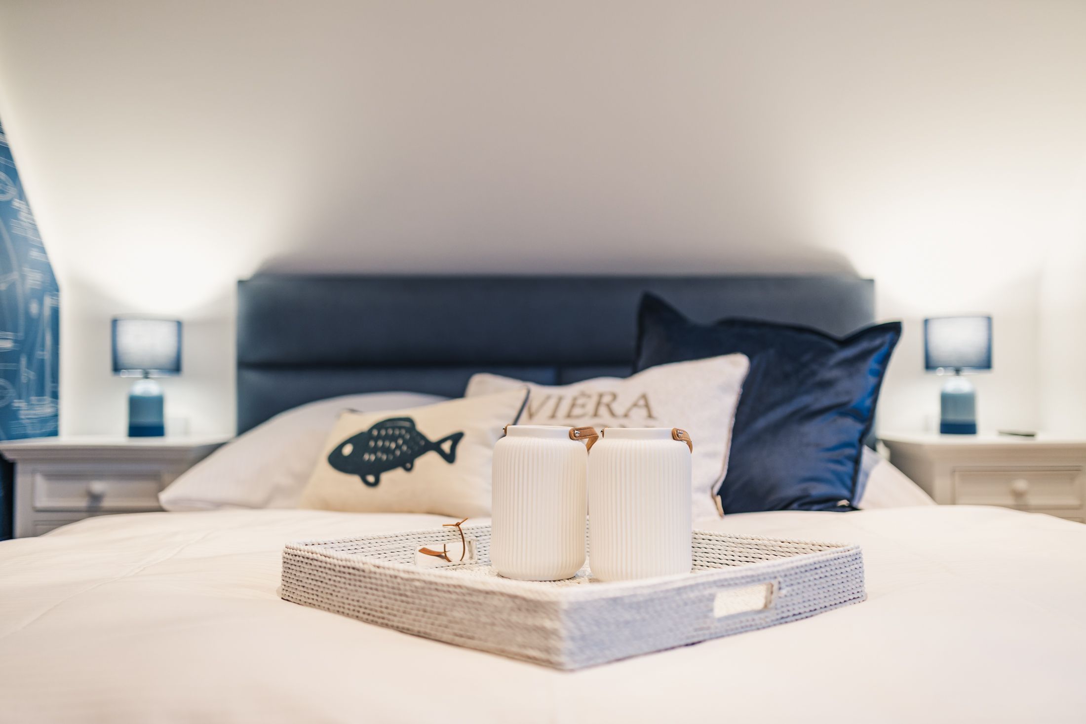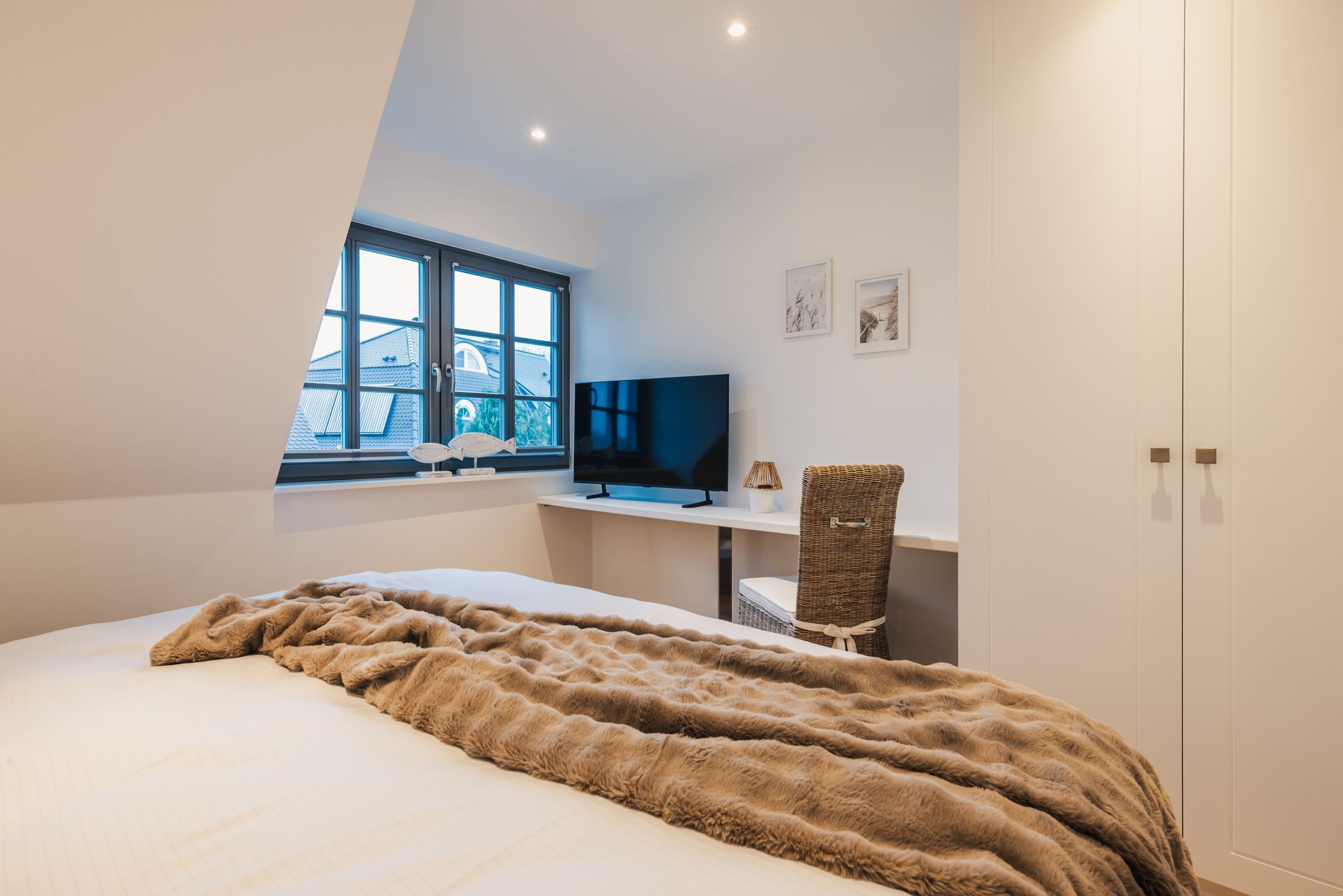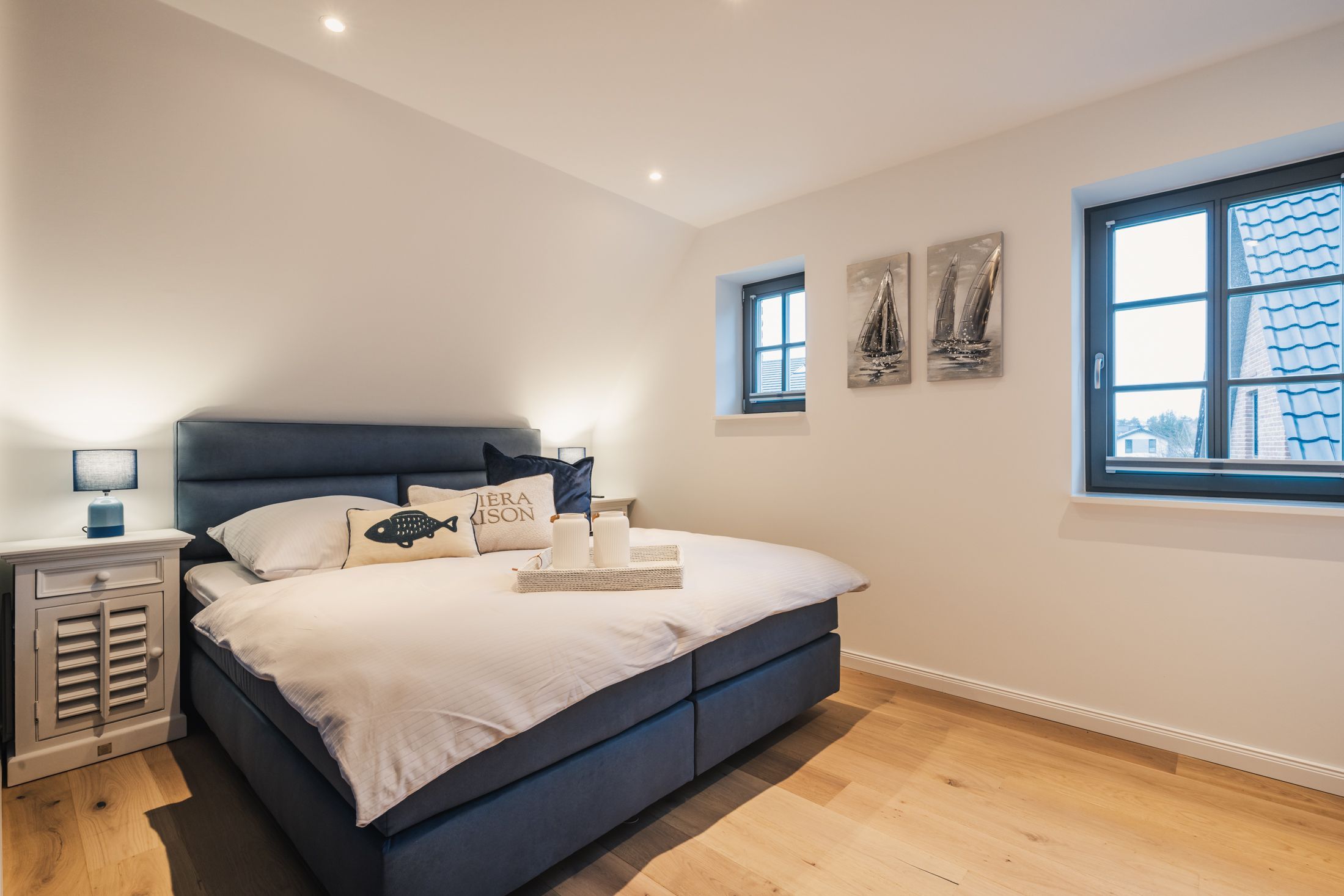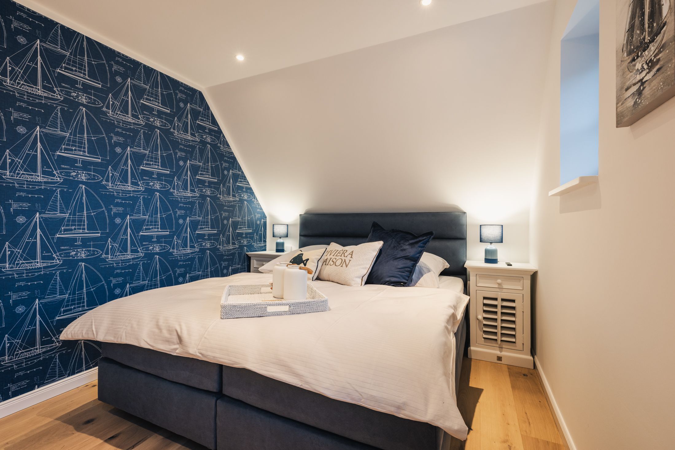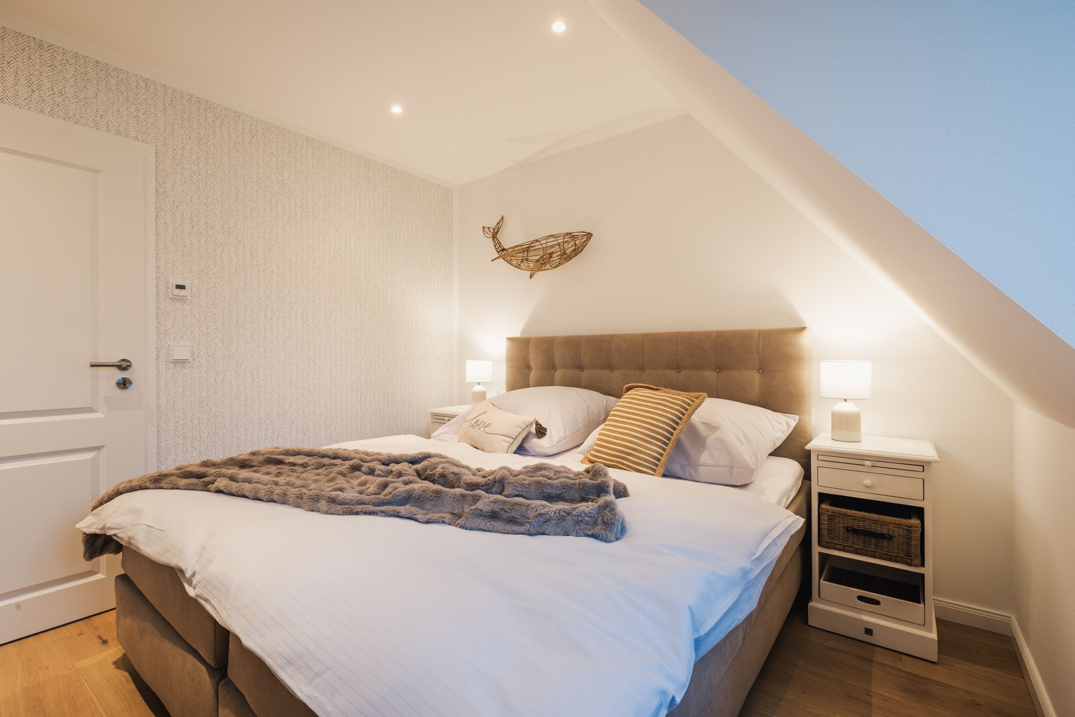 Die drei Schlafzimmer sind mit zwei bequemen Boxspringbetten und zwei Einzelbetten ausgestattet. Verdunkelnde Plissees sorgen für erholsame Nächte, und alle Schlafzimmer bieten ausreichend Stauraum für Ihr Gepäck.