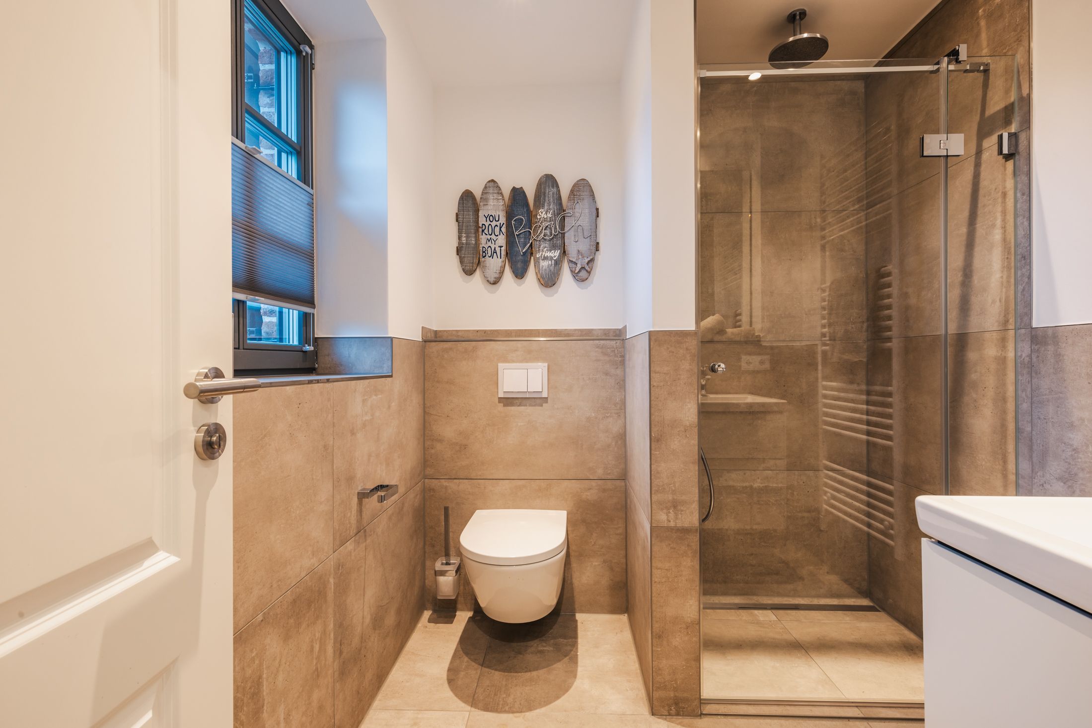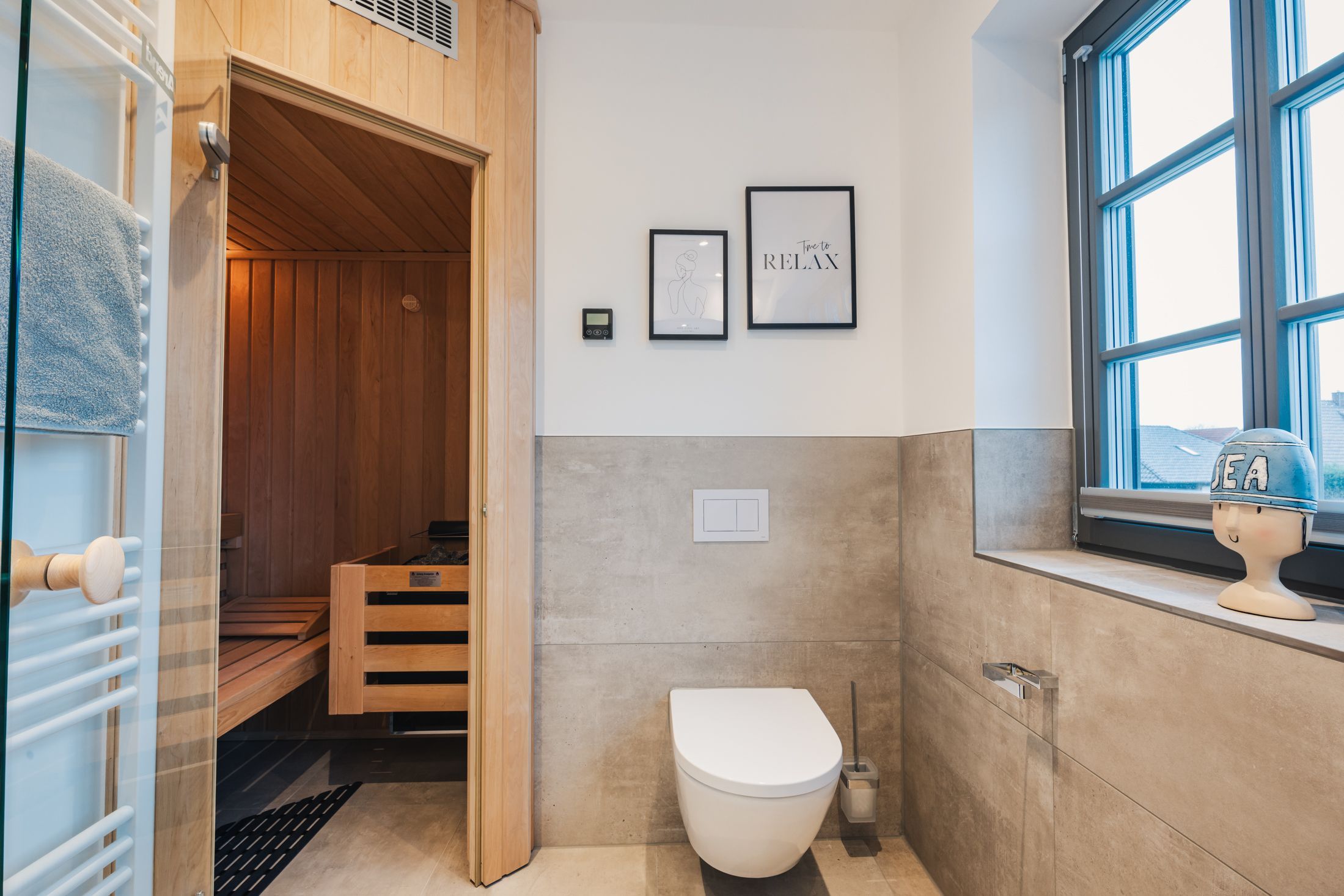 Das Ferienhaus verfügt über zwei moderne Badezimmer, die beide mit geräumigen Duschen und hochwertigen Armaturen ausgestattet sind. Das Hauptbadezimmer bietet zusätzlich eine entspannende Sauna, in der Sie die Wärme genießen und neue Energie tanken können.