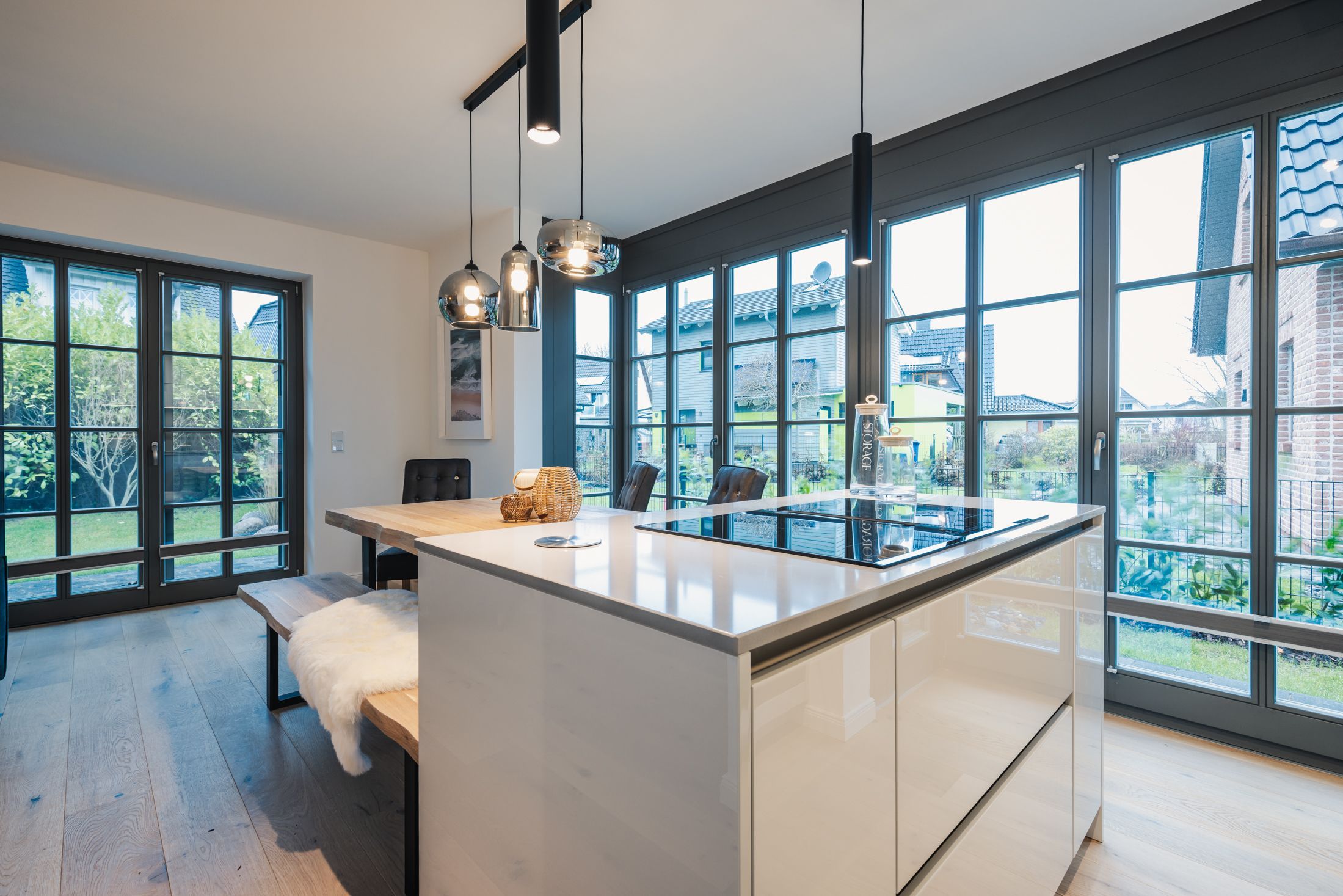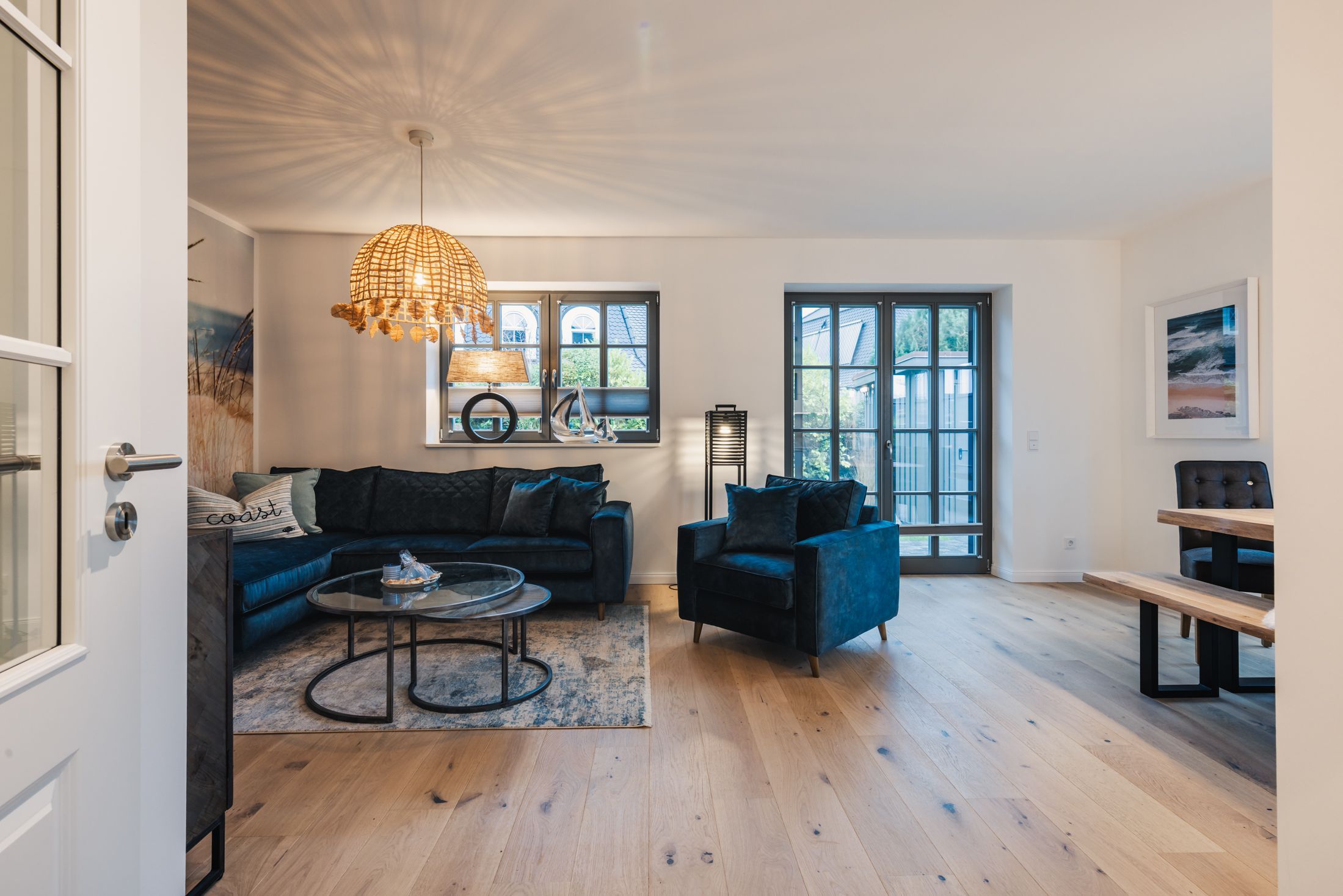 Das Ferienhaus ist gemütlich und komfortabel eingerichtet, um Ihren Aufenthalt so angenehm wie möglich zu gestalten. Der offene Wohnbereich verfügt über eine einladende Sofalandschaft, einen Esstisch und große Fenster, die viel Tageslicht hereinlassen. Die Küche ist mit einer Kochinsel versehen und bietet somit gesellige Kochabende mit Blick ins Grüne. Selbstverständlich ist die Küche mit modernen Markengeräten wie einem Geschirrspüler, Backofen und einer Kaffee Kapselmaschine ausgestattet.