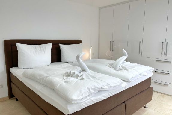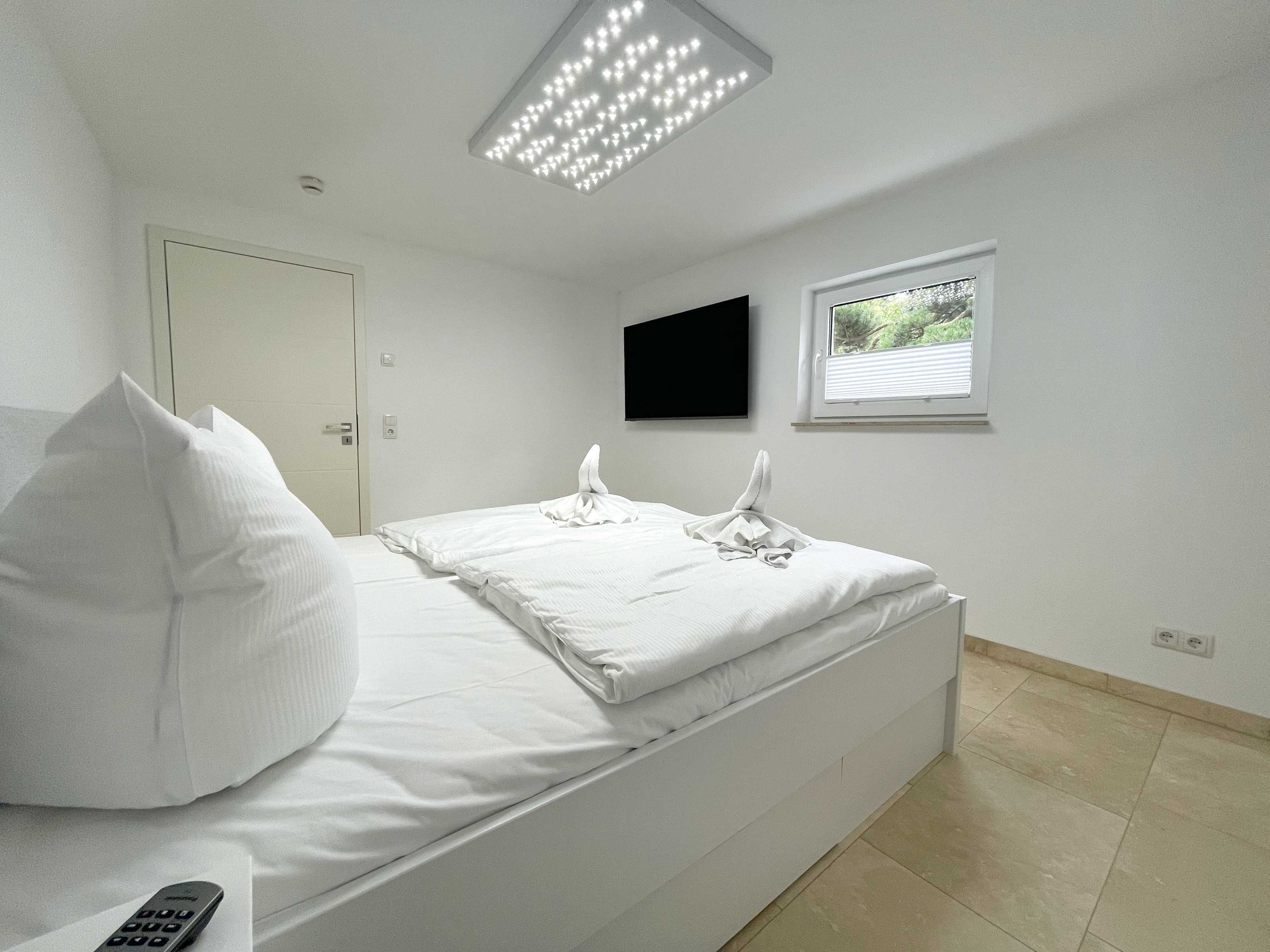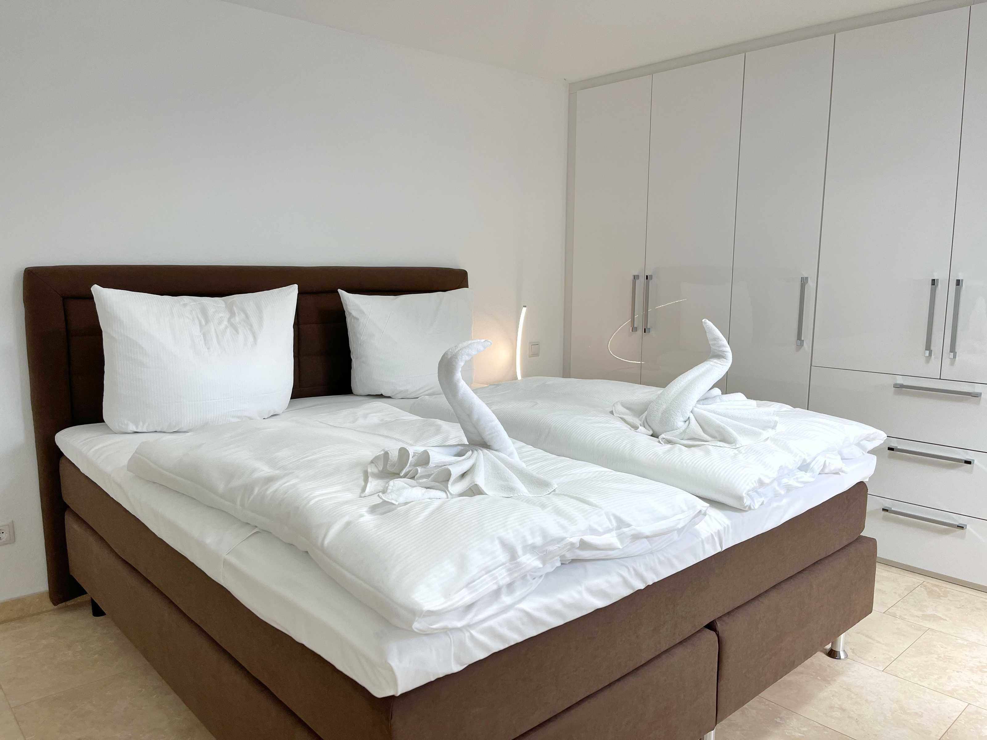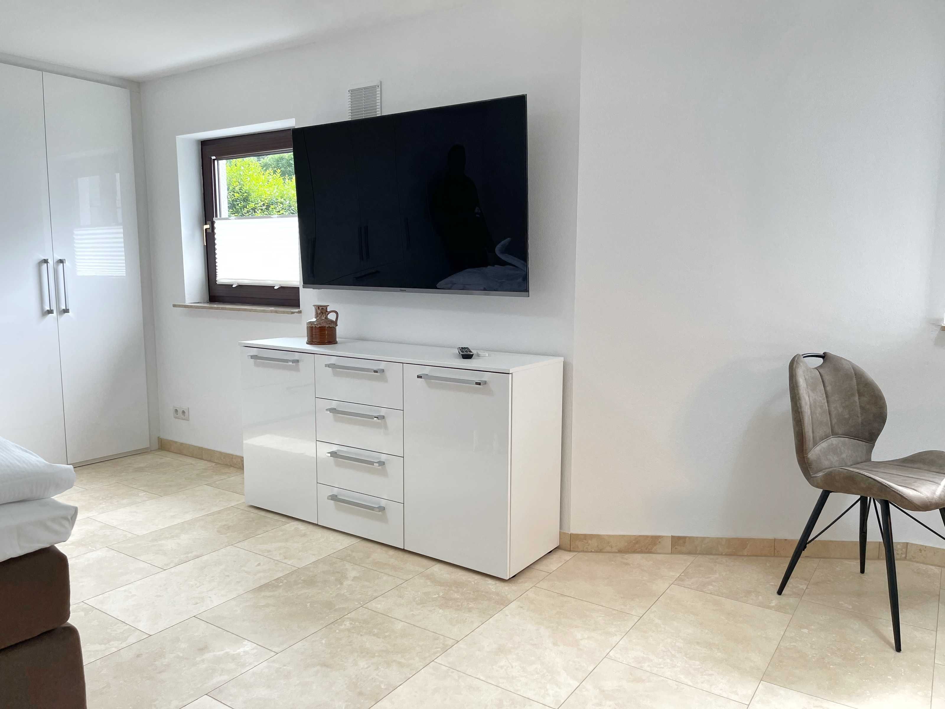 * Schlafzimmer mit Boxspringbett und Flachbild-TV 58 Zoll