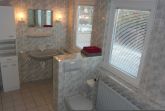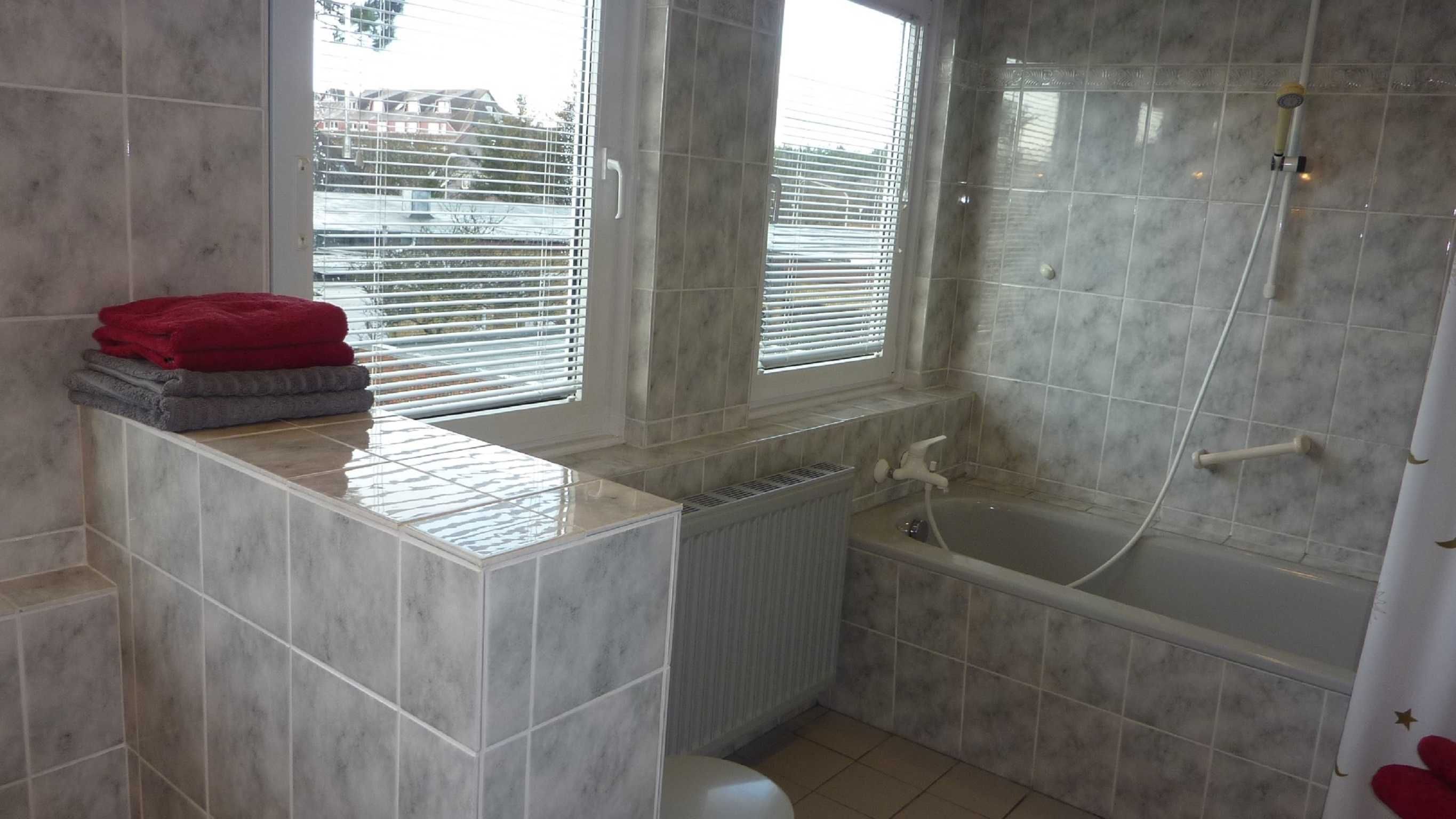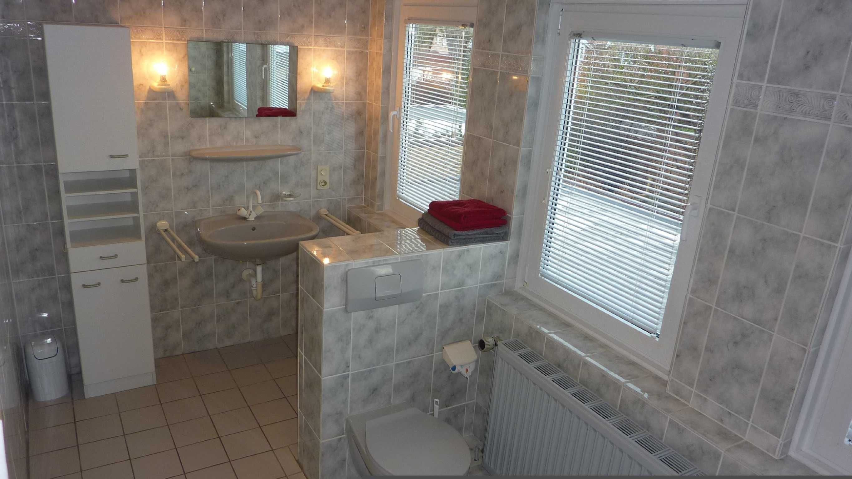 Ein helles, großes Bad mit Waschbecken, Badewanne mit Duschmöglichkeit, WC, Haartrockner und Außenfenster.