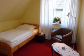 Das zweite Schlafzimmer ist eingerichtet mit einem Einzelbett (90x200), Nachttisch mit Lampe, Kleiderschrank und einer Leseecke mit Stehlampe, Ledersessel und Beistelltisch.