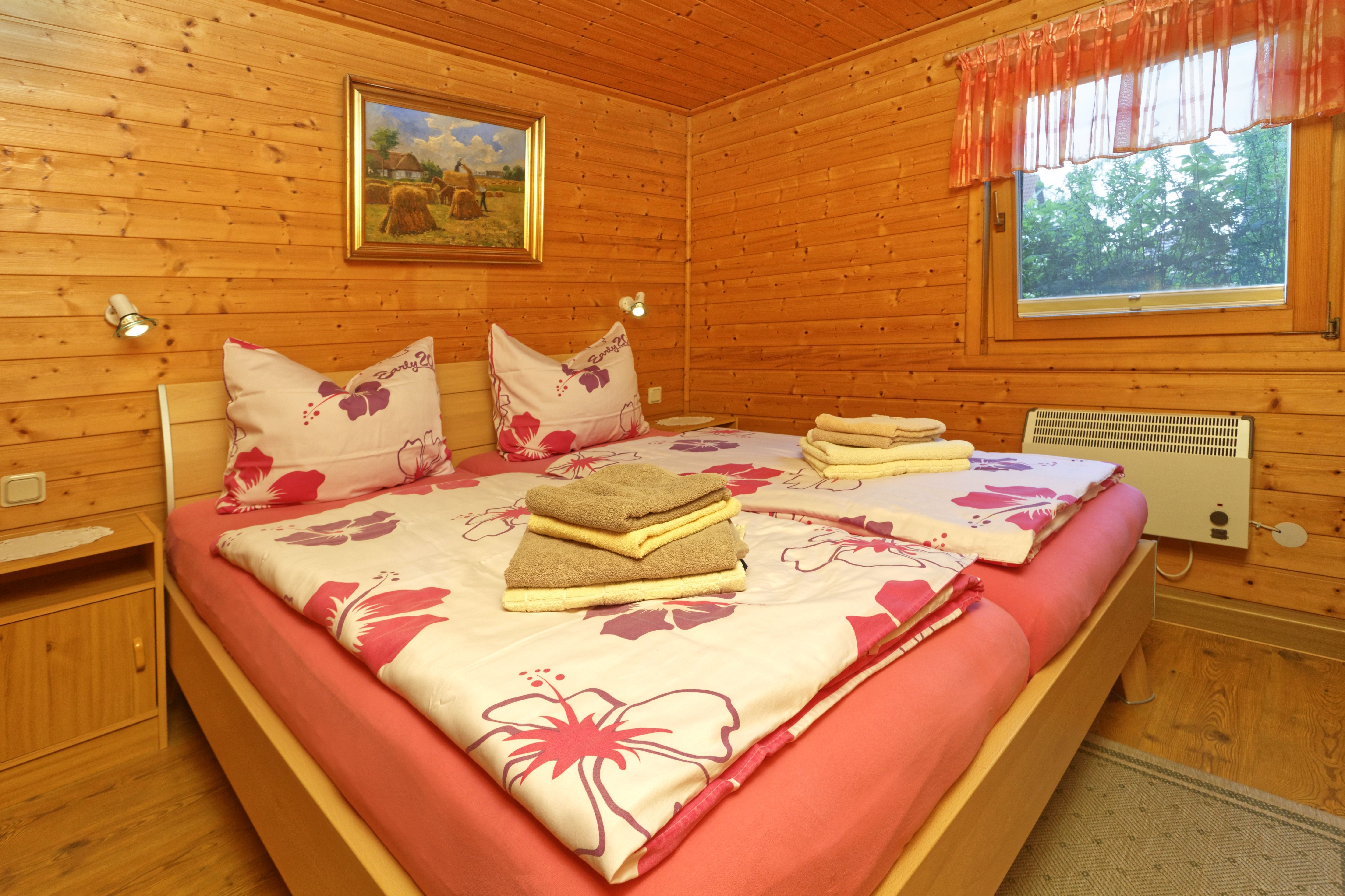 Ein separates Schlafzimmer mit Doppelbett sorgt für erholsamen Schlaf. Das Badezimmer ist mit Dusche/WC ausgestattet. Über eine steile Treppe gelangt man in die offene Schlafnische im Obergeschoss mit zwei Matratzen – ideal für Kinder.
