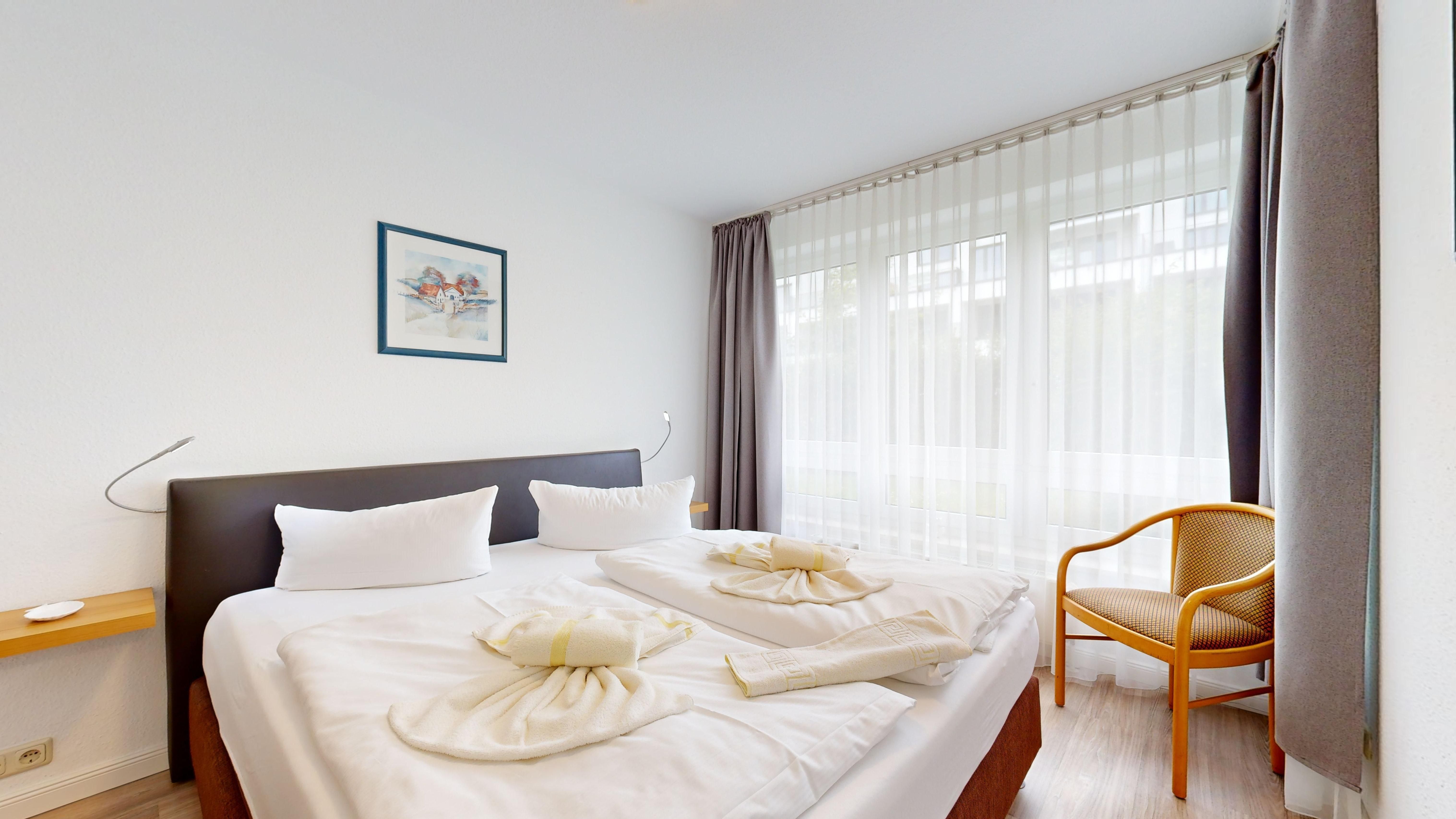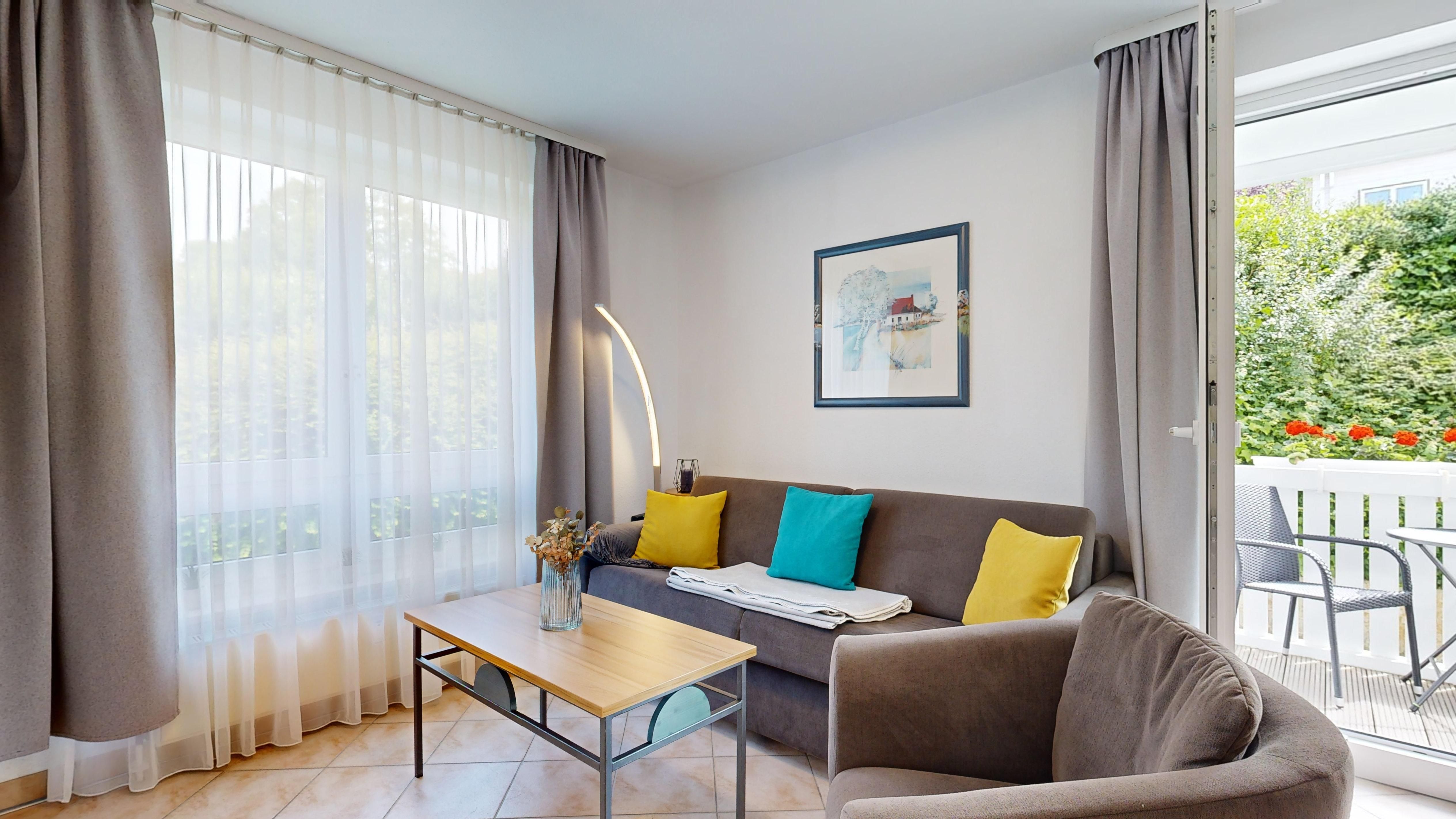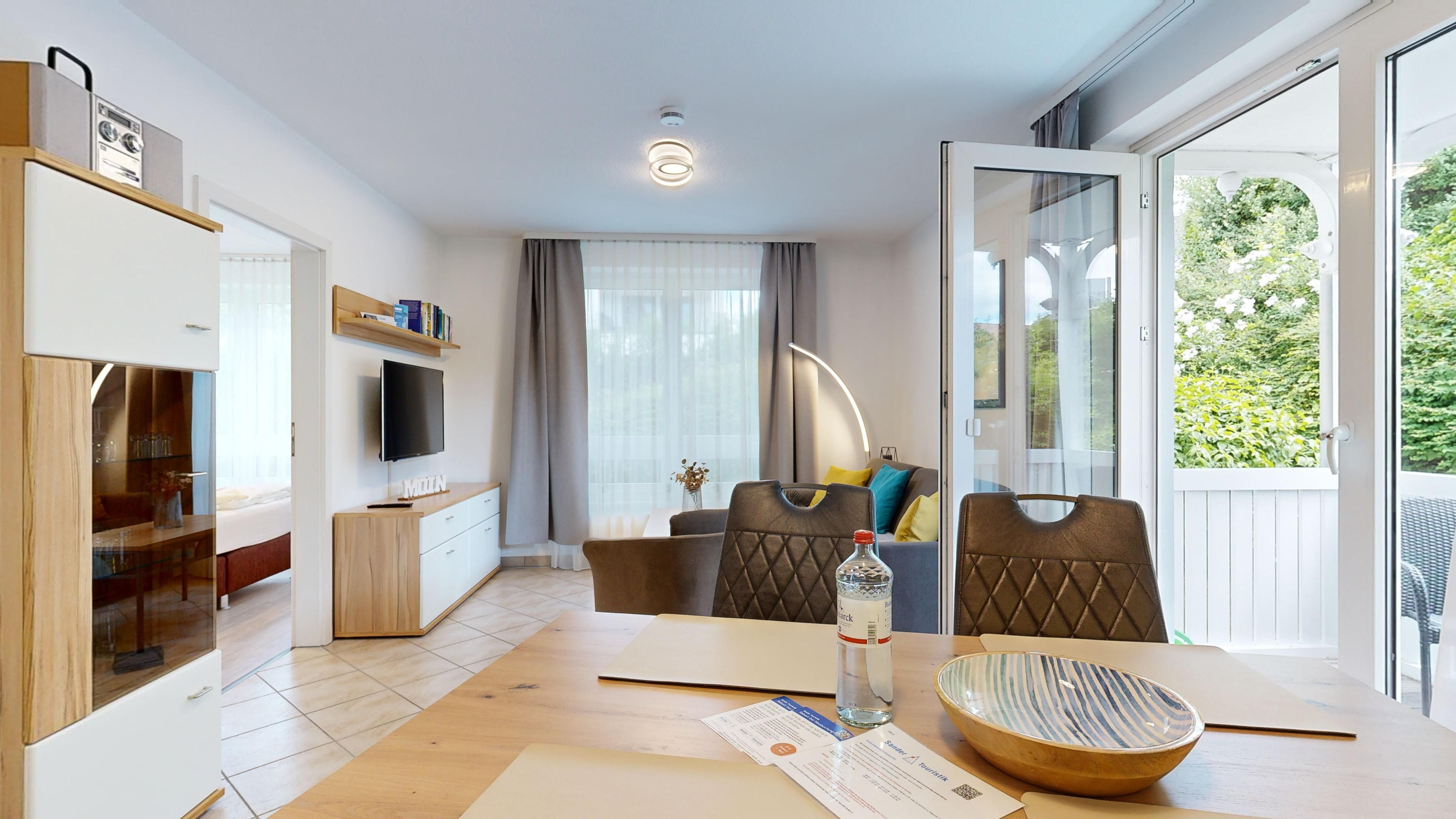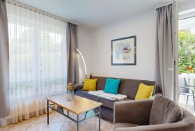 Ferienwohnung Binzer Sterne 6 für bis zu 4 Personen im Hochparterre (2 Zimmer / 45 m²) des Appartementhauses Binzer Sterne, 1 Schlafzimmer, Parkplatz (gegen Gebühr) und freies WLAN.