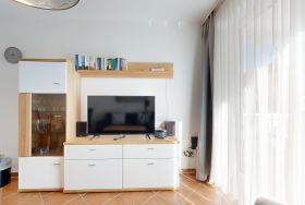 Wohnzimmer: Couchgarnitur (Schlafgelegenheit für 2 Personen), Kabel-TV, Stereoanlage, Internetanschluss (WLAN), Esstisch