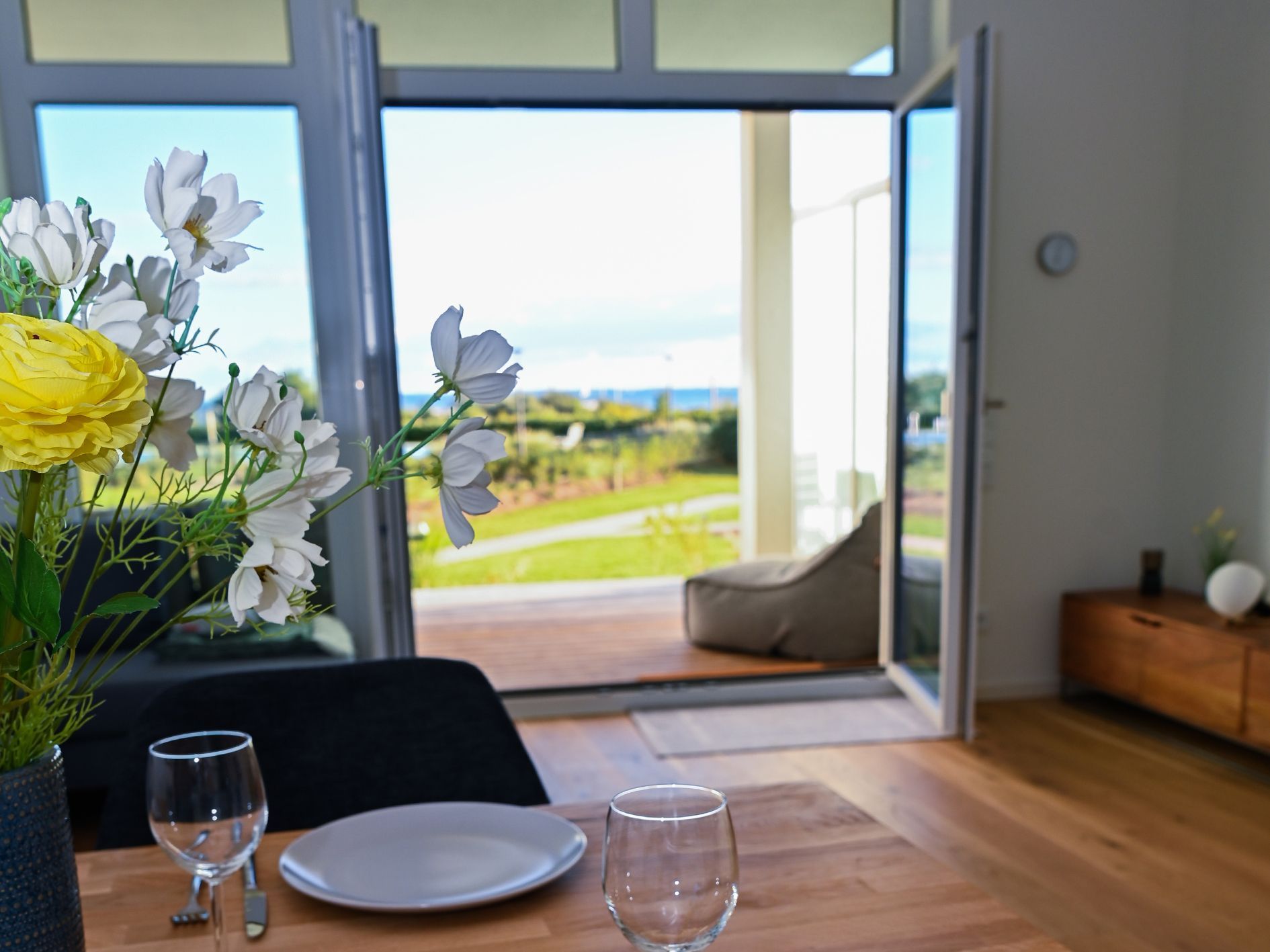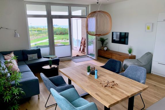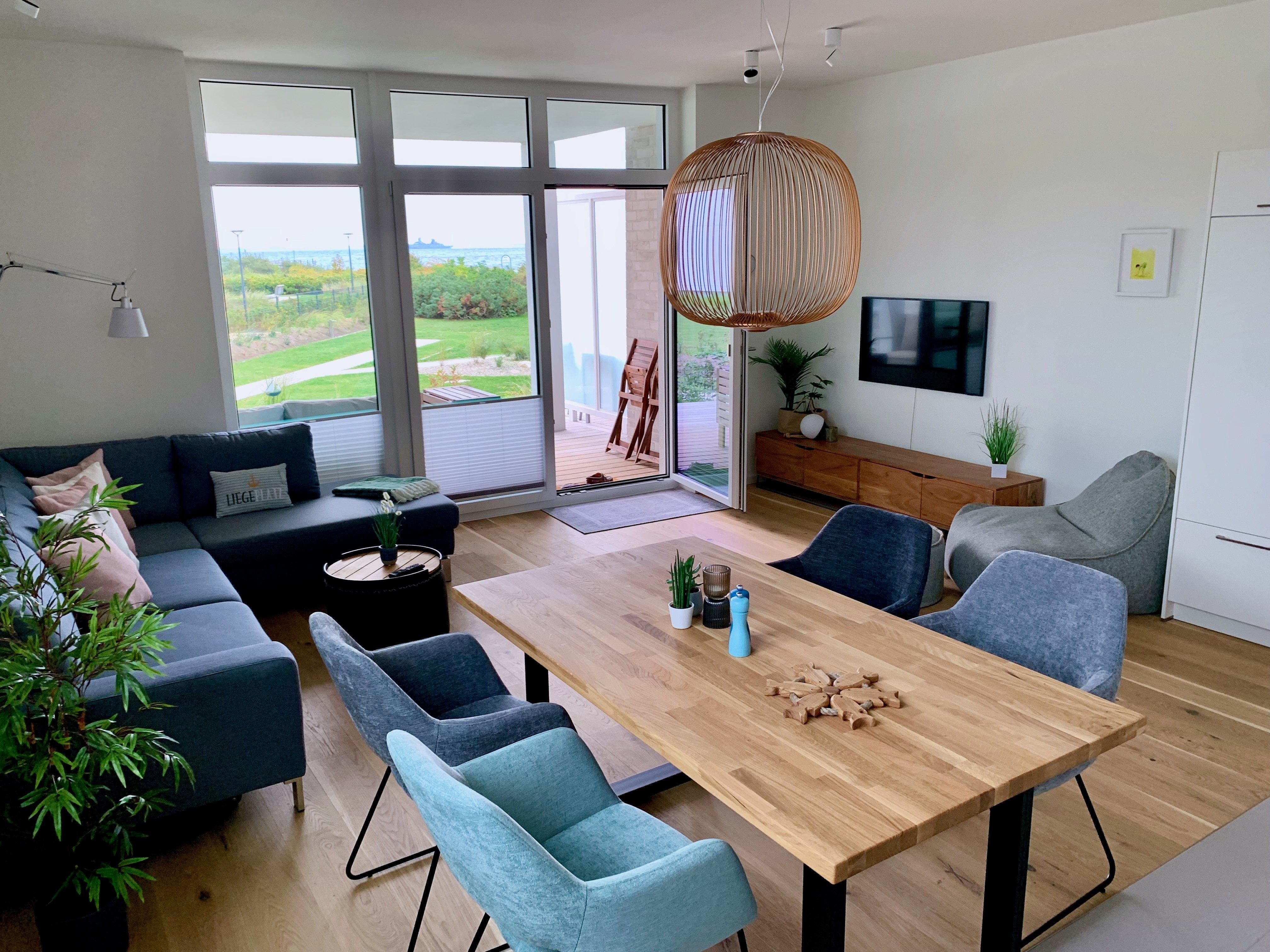 Mittelpunkt der Wohnung stellt der große Wohnessbereich mit Meerblick dar, mit vollausgestatteter Küche, Eichen-Esstisch, großem Ecksofa und Flachbildfernseher.
