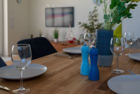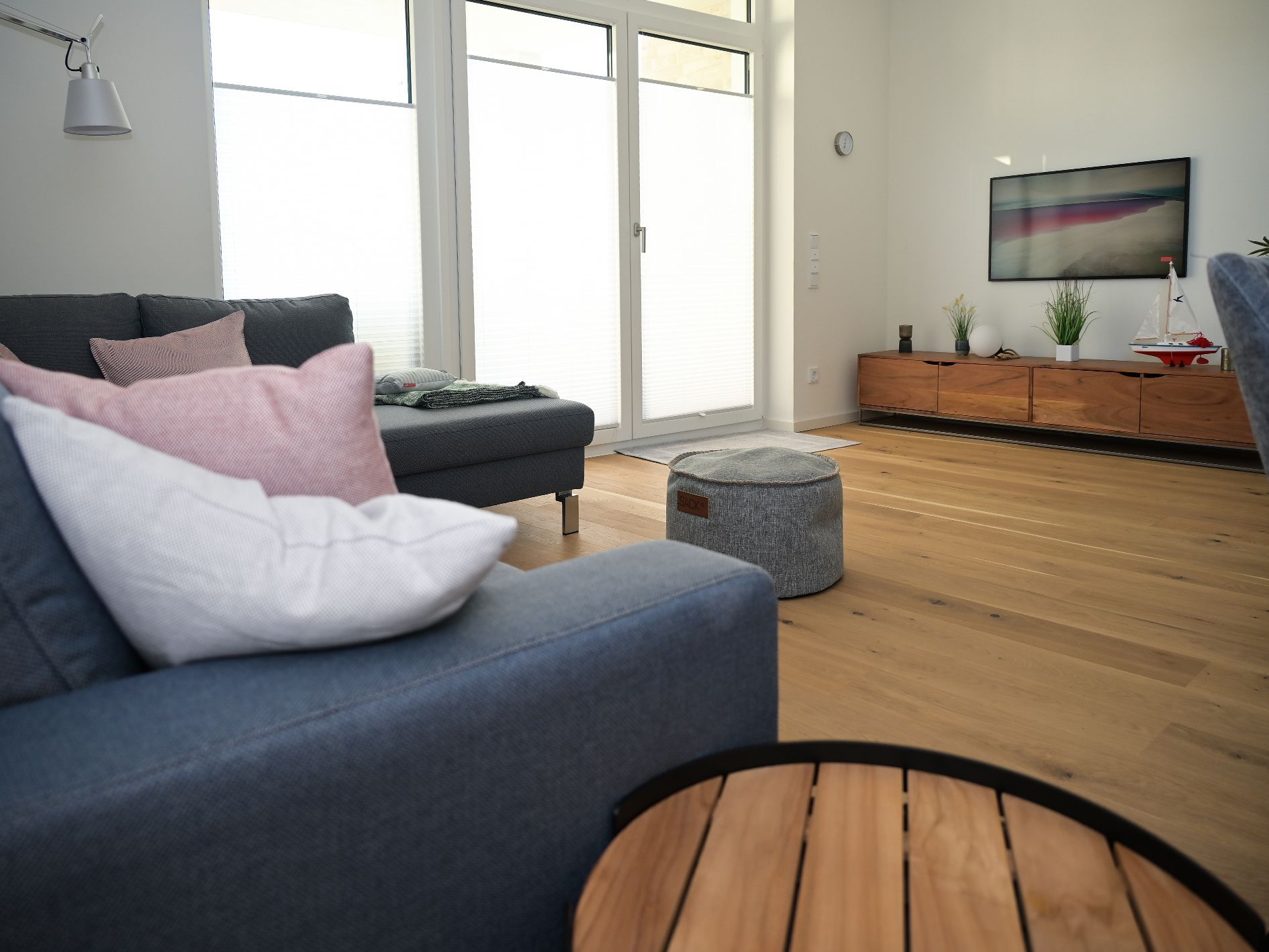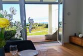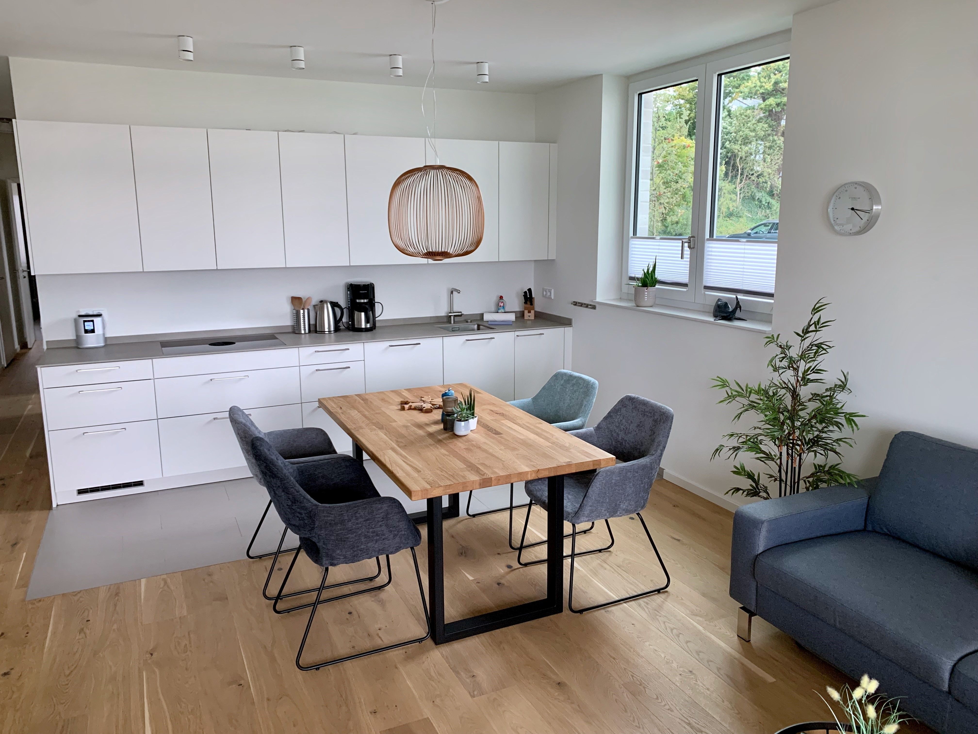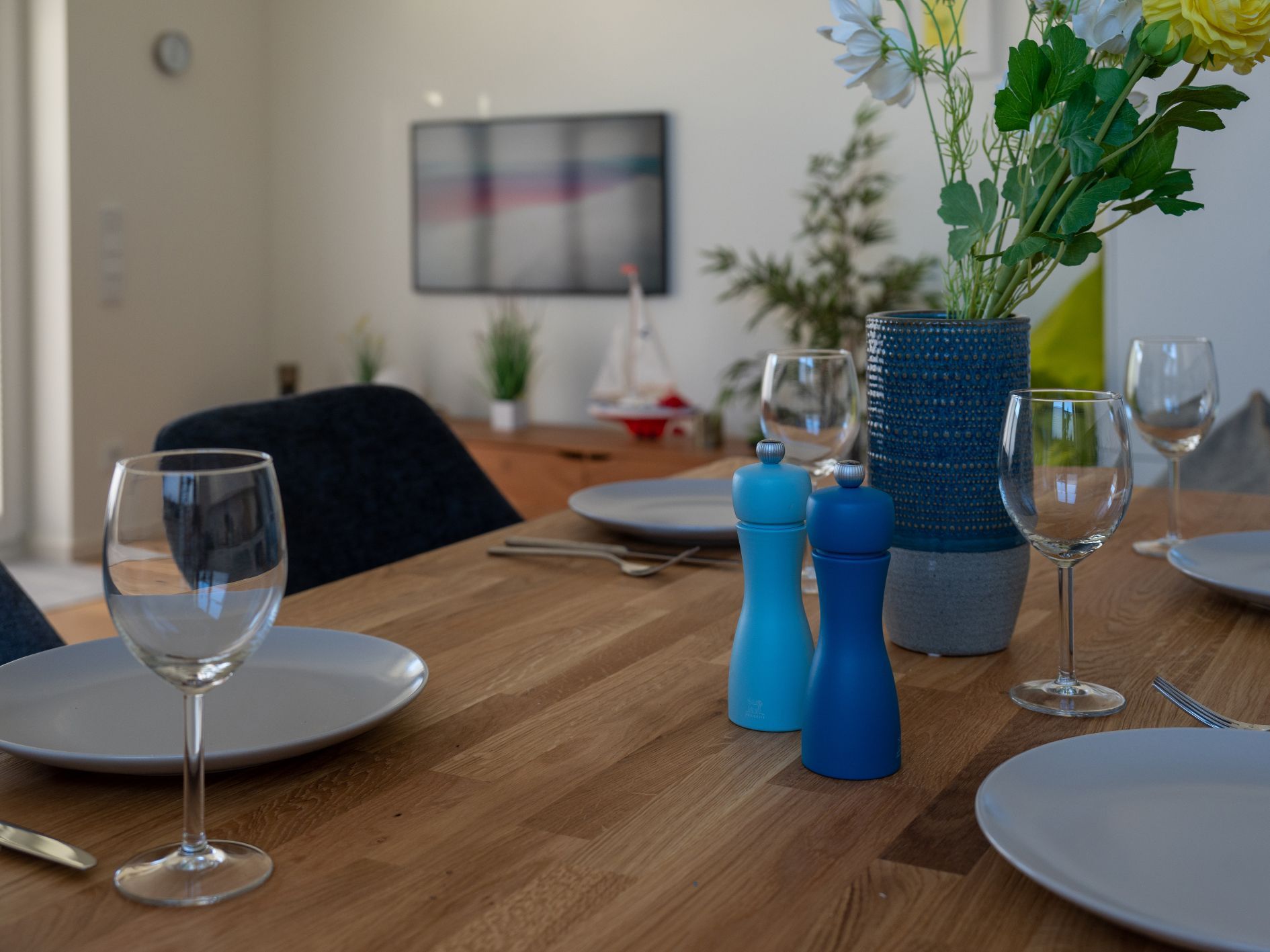 Mittelpunkt der Wohnung stellt der große Wohnessbereich mit Meerblick dar, mit vollausgestatteter Küche, Eichen-Esstisch, großem Ecksofa und Flachbildfernseher.