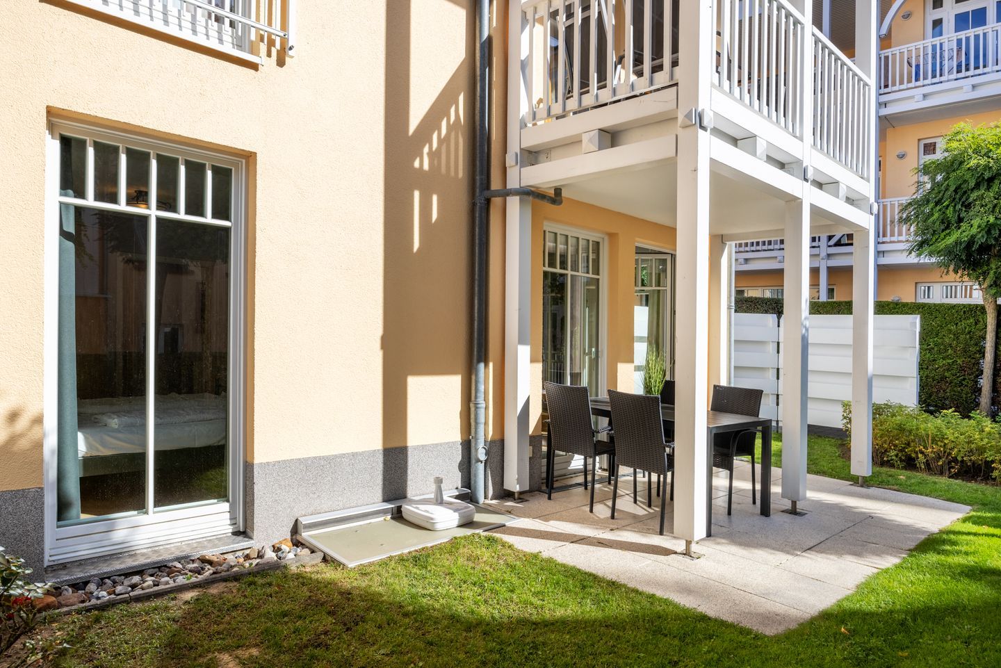 Das Apartment im Erdgeschoss der Ferienanlage zwischen Ostseestrand und Stadtwald befindet sich auf der Südseite, im Haus 2.
