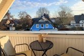 Der großzügige, überdachte Balkon nach Osten ist ebenfalls mit einem Essplatz ausgestattet und lädt zu einem Frühstück in der Morgensonne mit Blick auf die schönen Reetdachhäuser ein.