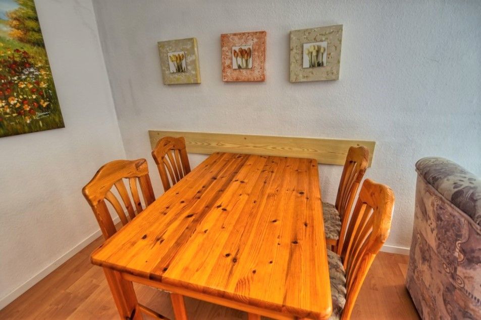 Die Wohnung verfügt über eine Wohnfläche von 56 qm mit folgender Aufteilung: Wohn-Esszimmer, sep. Elternschlafzimmer mit Doppelbett, sep. Kinderzimmer mit Etagenbett, komplett eingerichtete Küche mit Kühlschrank und Gefrierfach, 4-Plattenherd, Bad mit WC und Dusche.