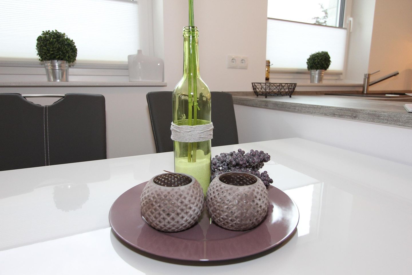 Der großzügige Küchen - und Essbereich verfügt über eine Wohnküche mit amerikanischem Küchentresen. Diese bietet Ihnen eine Komplettausstattung mit Geschirrspüler, Ceranfeld, Backofen, Mikrowelle, Kühlschrank inkl. 4-Sterne Gefrierfach, Toaster, Kaffeemaschine, Wasserkocher, Eierkocher und Handmixer sowie für die kleinen Gäste einen Babykostwärmer. An den Küchentresen schließt die moderne Essecke an. Die Terrasse zur Südwestseite ist mit Gartenmöbeln für 4 Personen ausgestattet. Die Wohnung ist bis auf das Bad komplett mit Außenrolläden verdunkelbar. Außerdem hat jedes Fenster ein Plissee (Terrassentür Schiebegardine)