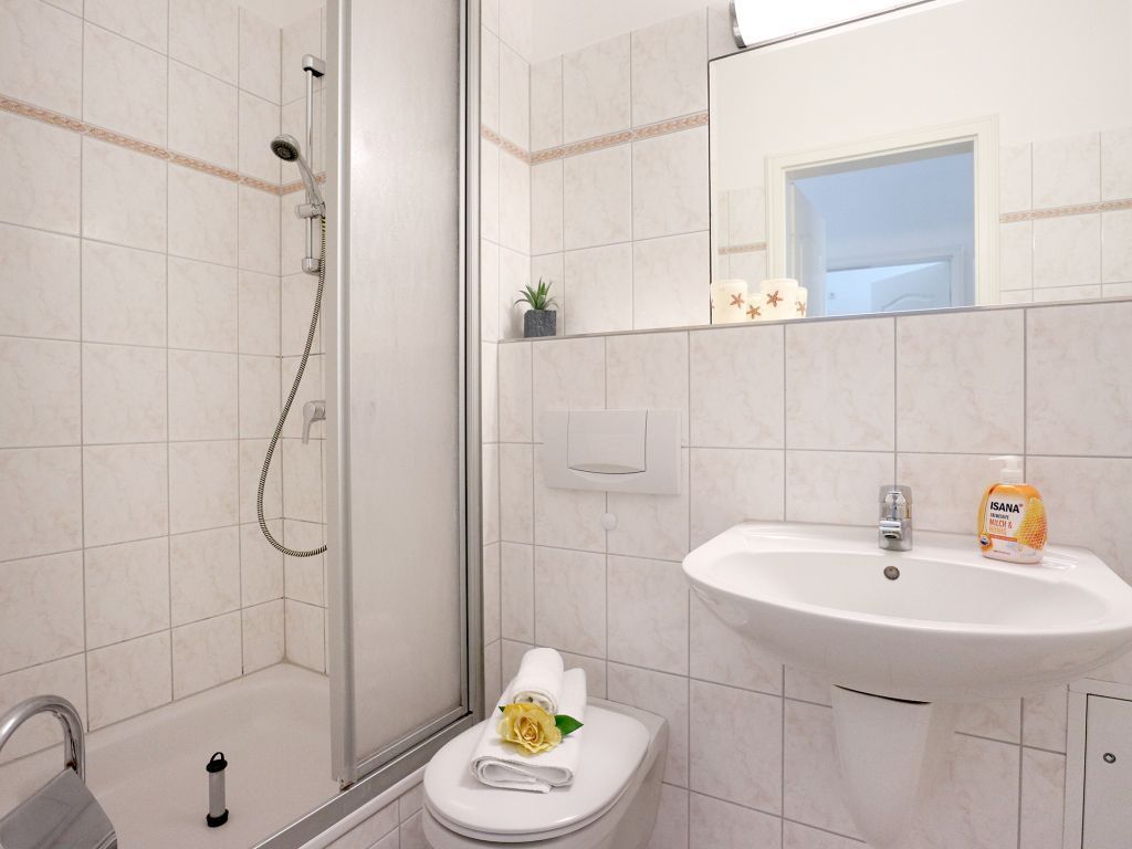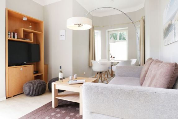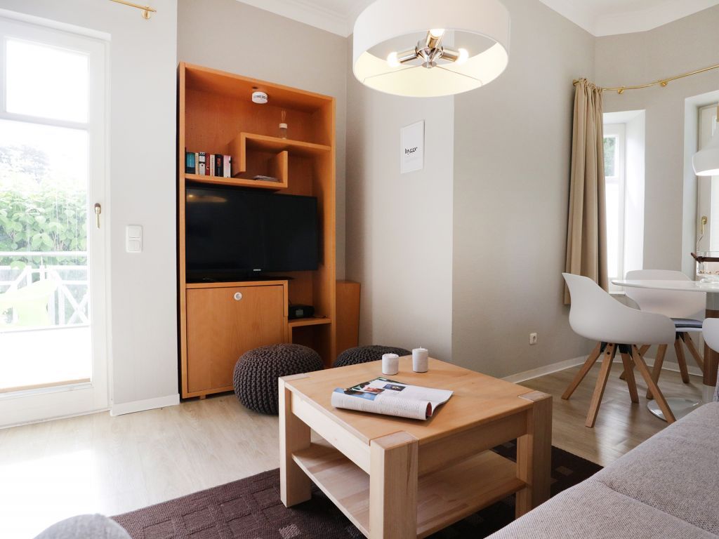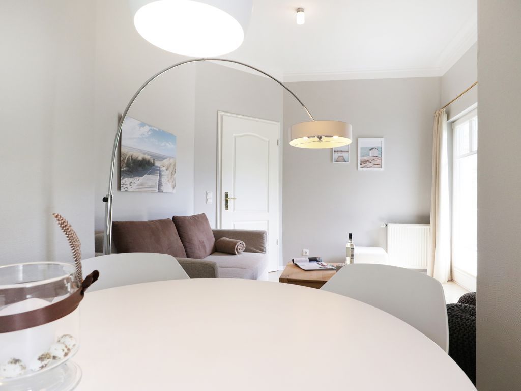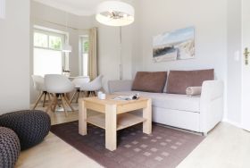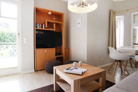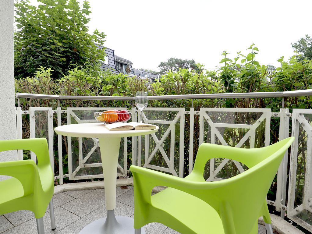 Das schicke Balkon Appartement befindet sich im Hochparterre des Hauses. Es besitzt eine Wohnfläche von ca. 40qm. Die Belegung ist mit max. 3 Personen möglich. Der Wohn-Essbereich ist geschmackvoll möbliert und mit einem Sofa ausgestattet, das in ein Schlafsofa umgewandelt werden kann und somit einen 3. Schlafplatz ermöglicht. Zudem sind ein Esstisch sowie ein Fernseher vorhanden. WLAN nutzen Sie gebührenfrei. Die separate Küche ermöglicht die Eigenversorgung: 2- Plattenherd, Kühlschrank mit integr. Gefrierfach, Kaffeemaschine, Toaster usw. ermöglichen die Zubereitung kleiner Urlaubsmahlzeiten. Vom Wohnraum aus gelangen Sie auf den saisonal möblierten Balkon in Nord-West Lage.