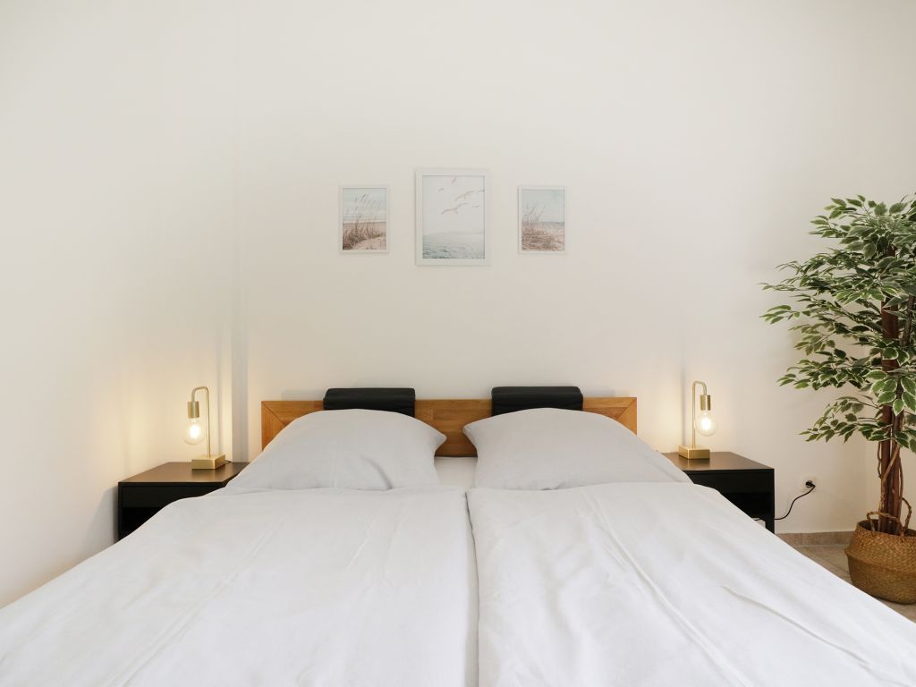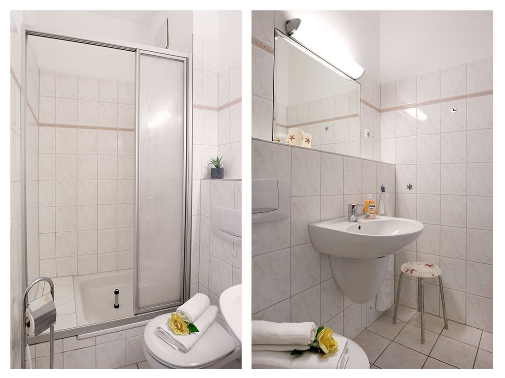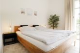 Erholsame Nächte ermöglicht ein separates Wohlfühl-Schlafzimmer mit Doppelbett 1,60m x 2,00m. Zur Wohnung gehört ist ein hell gefliestes Duschbad mit Waschtisch und WC.