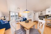 Es besitzt ein Schlafzimmer mit einem großem Doppelbett, einen Wohnbereich mit Couchecke, Elektrokamin und TV, einen Essbereich und eine Küche mit allen Annehmlichkeiten.