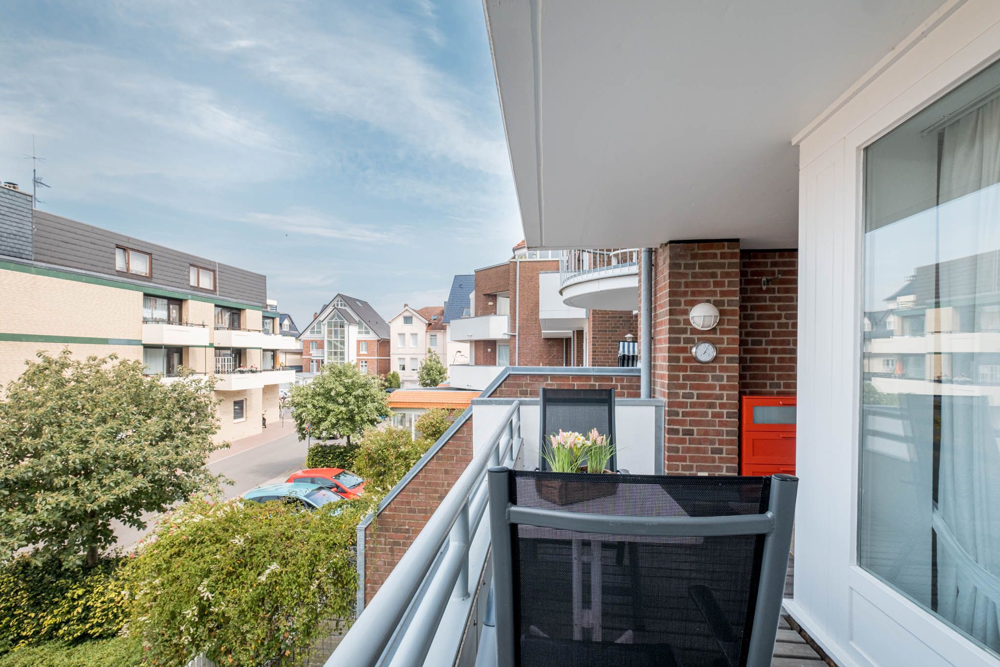 Auf dem halb überdachten, nach Westen ausgerichteten Balkon lassen sich entspannte Stunden verbringen.