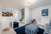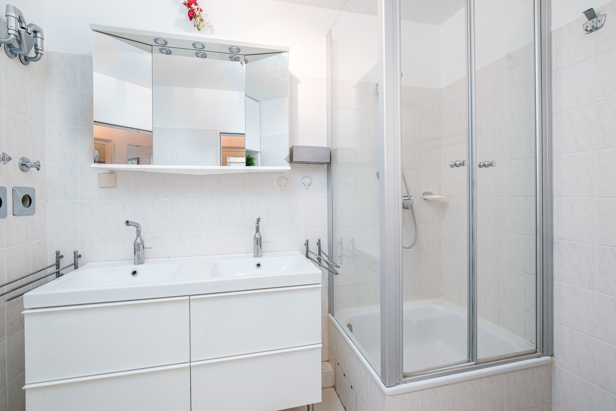 Zusätzlich befindet sich im unteren Bereich die voll ausgestattete Küche mit Geschirrspüler, Mikrowelle und auch einer Waschmaschine, ein Schlafzimmer mit Einzelbett (80 cm x 200 cm) sowie ein helles Badezimmer mit Dusche, WC, Fön und zwei Waschbecken.