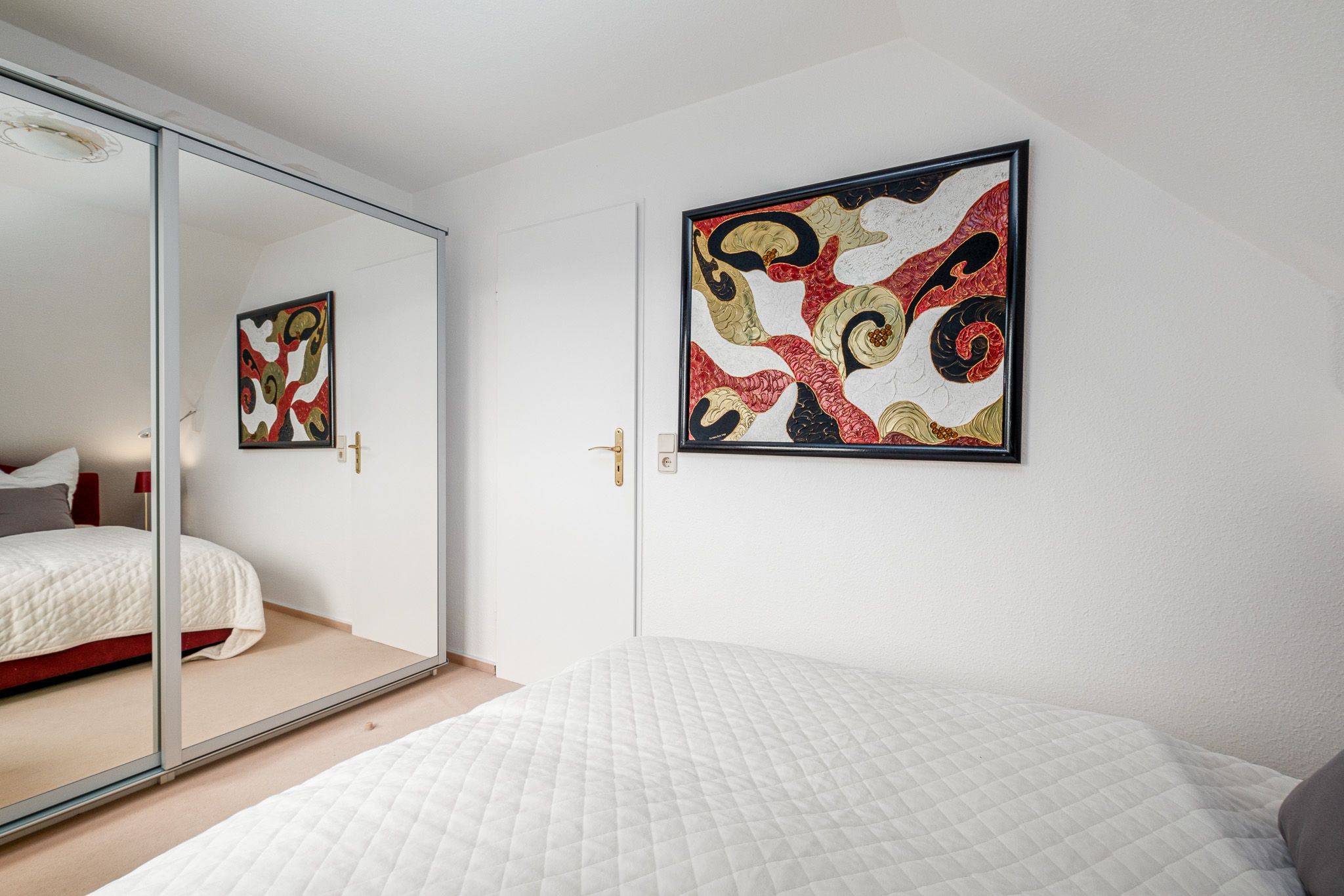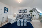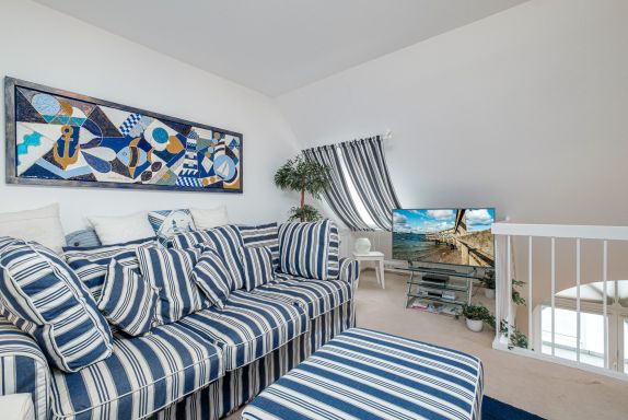 Auf der Galerie im oberen Wohnraum finden Sie eine gemütliche Schlafcouch (160 cm x 200 cm), Kabel-TV mit DVD-Player und Hi-Fi Anlage vor. Hier lassen sich entspannte Filmabende verbringen. Des Weiteren befindet auf der oberen Etage ein Schlafzimmer mit einem franz. Bett (140 cm x 200 cm). In der Ferienwohnung steht Ihnen Internet per WLAN zur Verfügung.