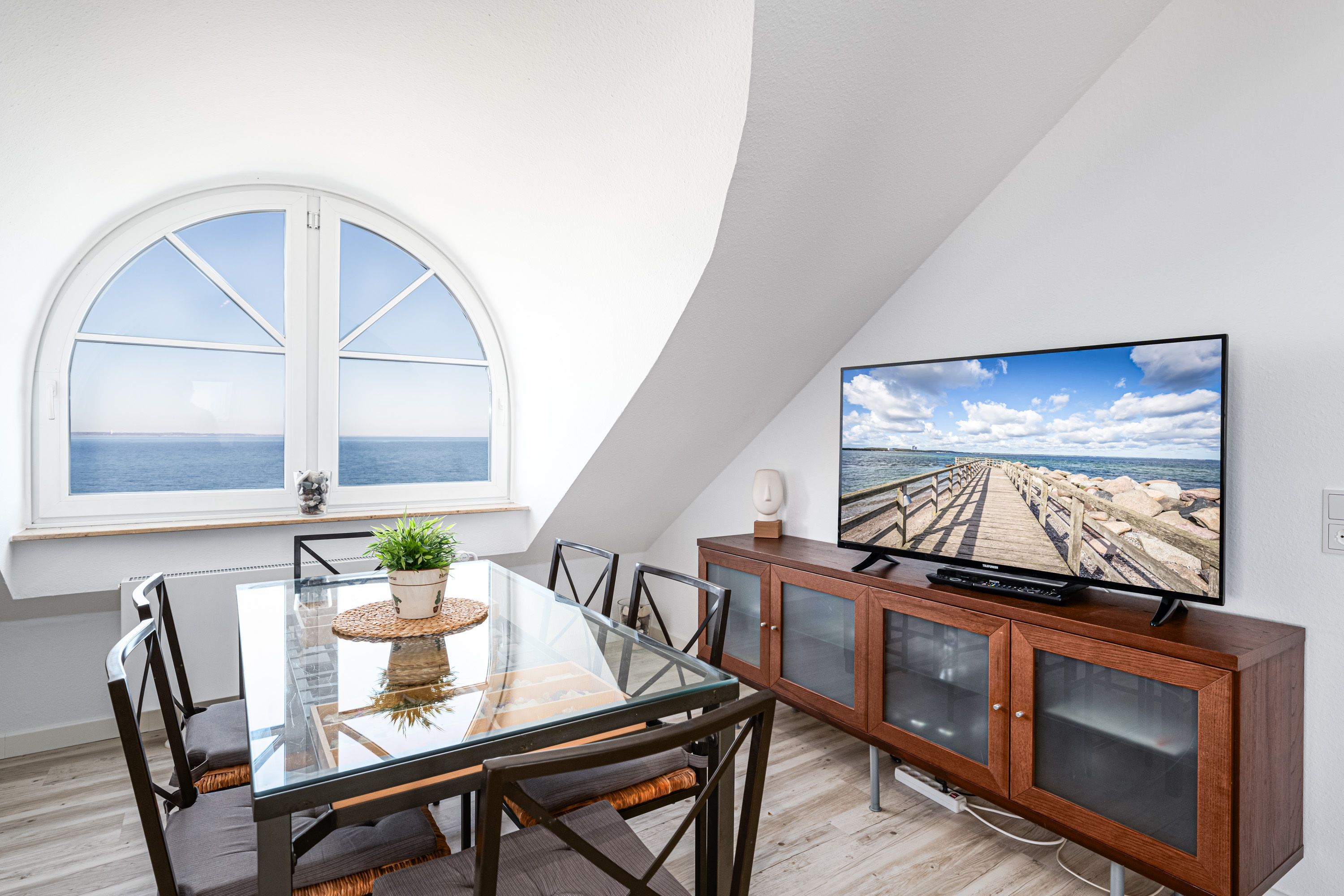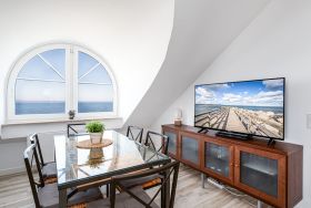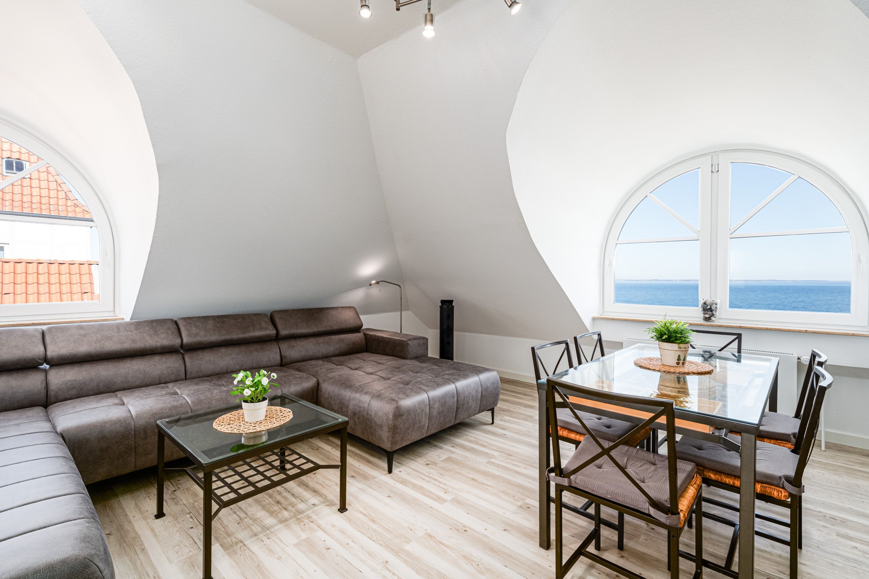 In dieser in 2025 modernisierten und 72m² großen Niendorf Ferienwohnung im 4. OG genießen bis zu 4 Personen aus fast allen Fenstern einen wunderschönen Meerblick auf die Ostsee.