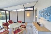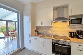 Ein besonderes Highlight des Ferienhauses ist der Wintergarten mit Fußbodenheizung, der zu jeder Jahreszeit ein gemütlicher Rückzugsort ist. Hier genießen Sie Ihr Frühstück mit Blick auf den liebevoll angelegten Garten oder lassen den Tag bei einem Glas Wein in der Abendsonne ausklingen. Der Wintergarten ist direkt über die Küche zugänglich und mit einem Radio ausgestattet, das UKW, DAB+ und Internetradio bietet.