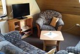 Das Wohnzimmer ist ausgestattet mit einer Couch und zwei Sesseln, Essecke , Flachbildschirm und Radio.