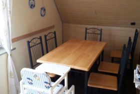 Die gemütliche Ferienwohnung mit separatem Eingang bietet Platz für 5 Personen und ist ca 60 qm groß. Sie befindet sich in der 1. Etage und verfügt über 1 Wohnzimmer mit Essecke und integrierter Küchenzeile. Außerdem bietet sie 2 separate Schlafzimmer.