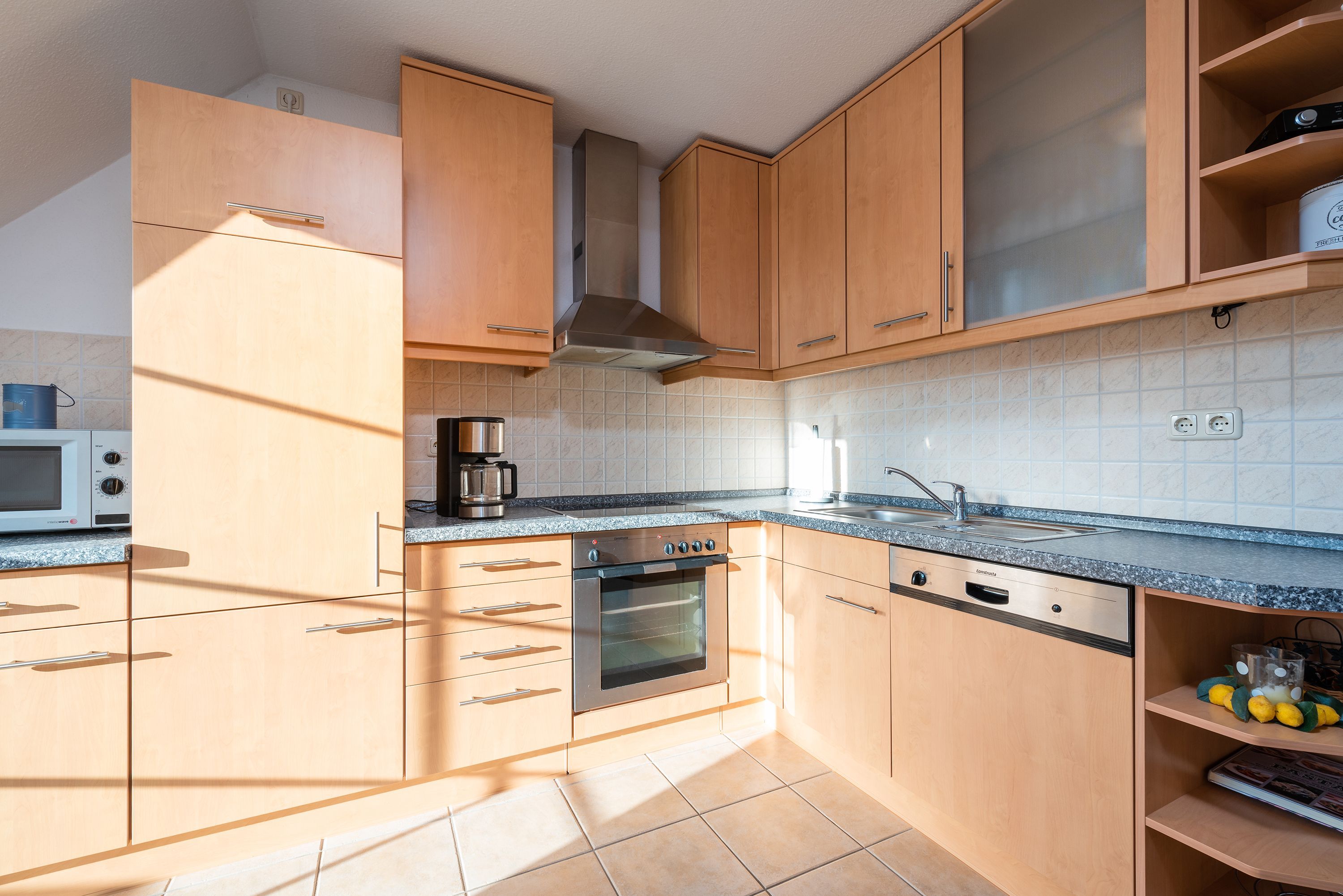 • Voll ausgestattete Küche inklusive 4-Plattenherd, Mikrowelle, Kaffeemaschine und Geschirrspüler.