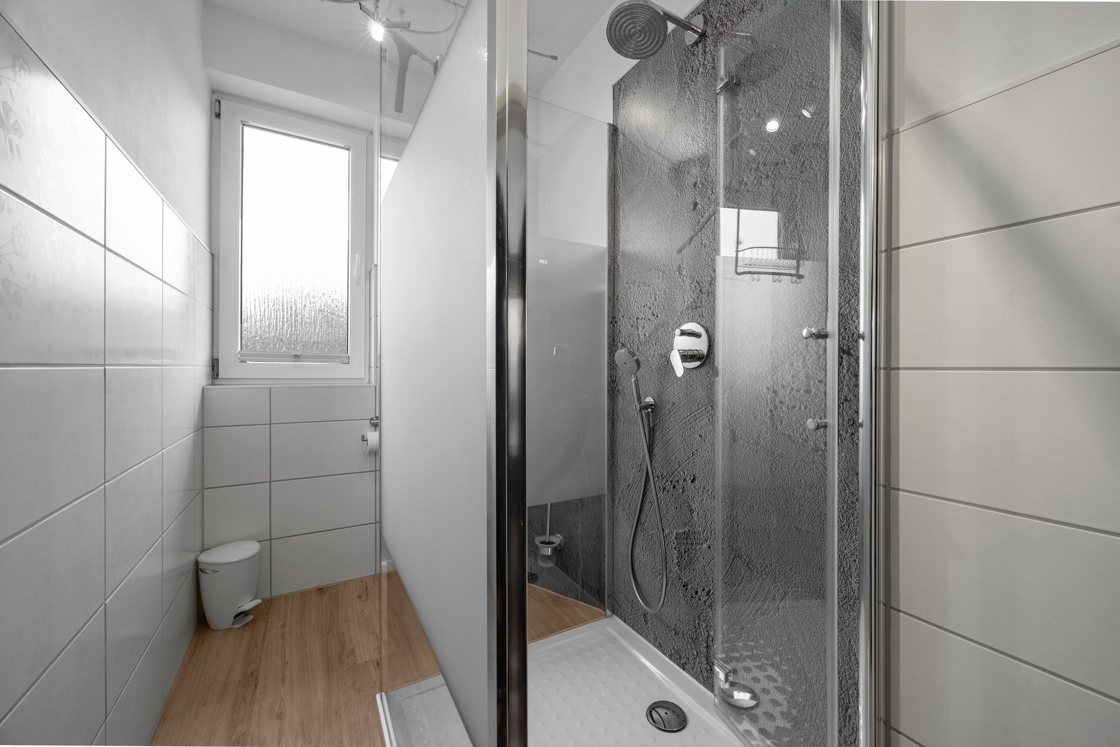 Das Badezimmer mit Fenster ist modern gestaltet und verfügt über eine ebenerdige Dusche, die Ihnen nach einem langen Tag Erholung bietet.
