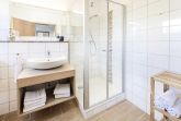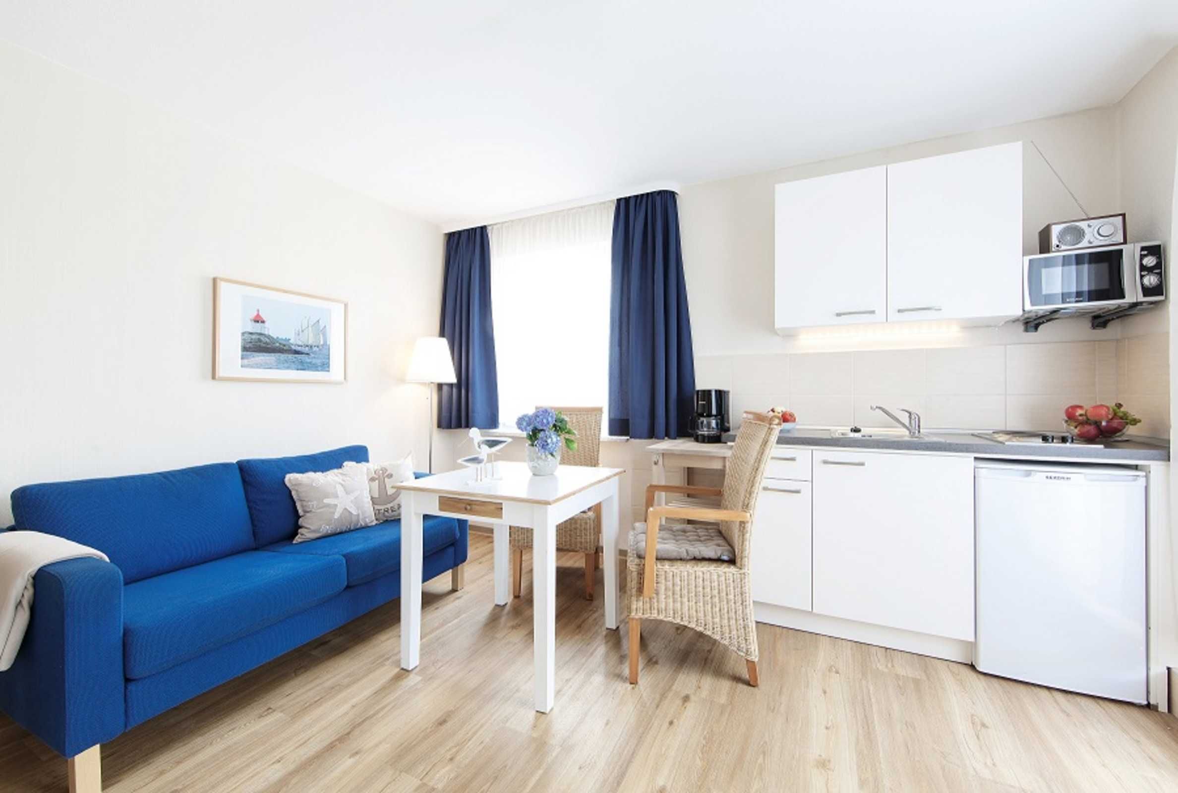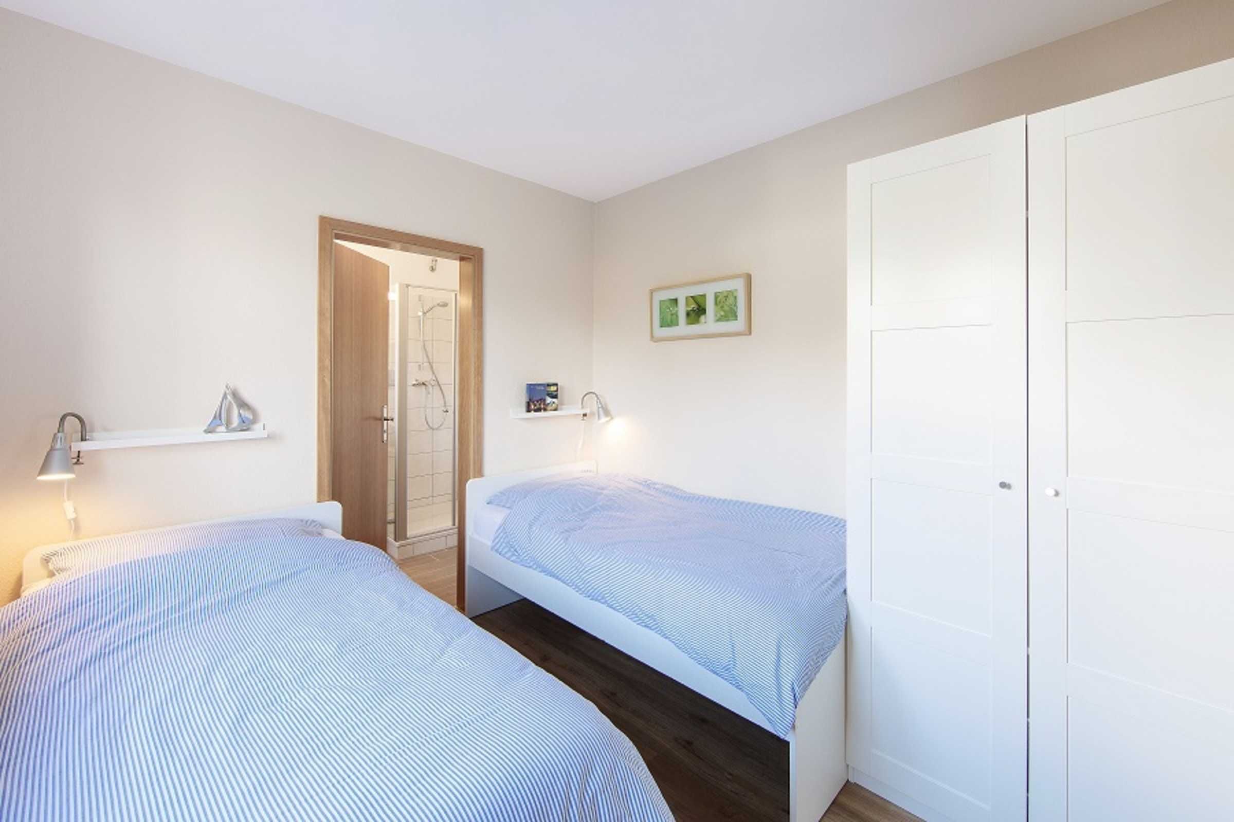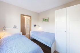 Dieses Appartement im ersten Obergeschoss bietet 2 Personen einen angenehmen Urlaub. Im Wohnzimmer mit integrierter Kochzeile finden unsere Gäste einen Essplatz sowie ein Sofa zum Lesen oder Fernsehen. Ein Schlafzimmer mit zwei Einzelbetten und das Duschbad mit WC ergänzen dieses Appartement (ca. 30 m²). Selbstverständlich gehört auch zu dieser Unterkunft ein Balkon.