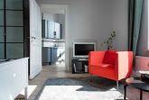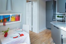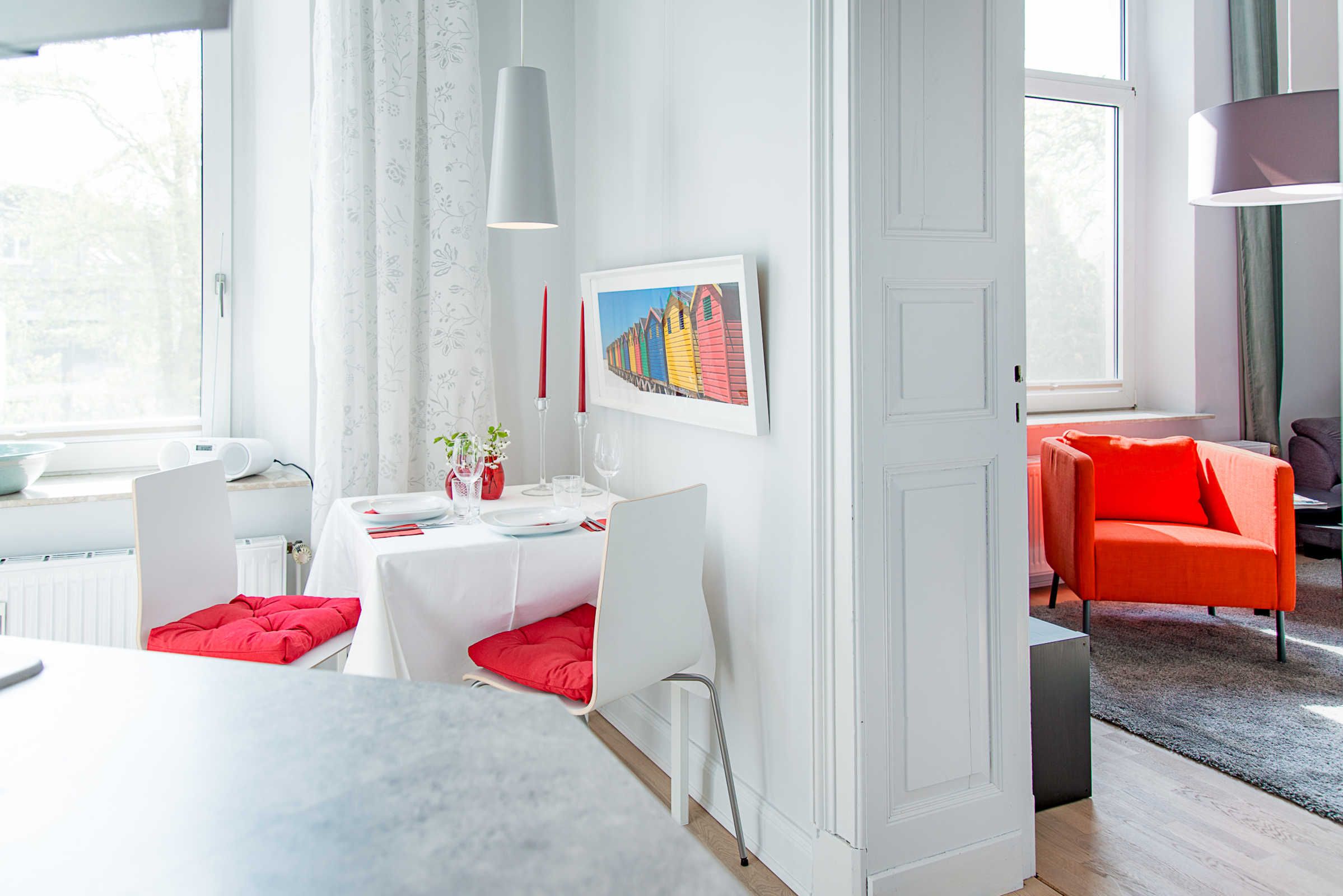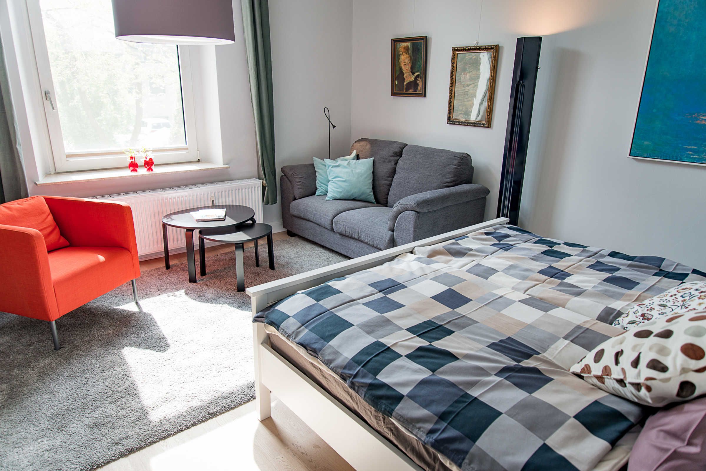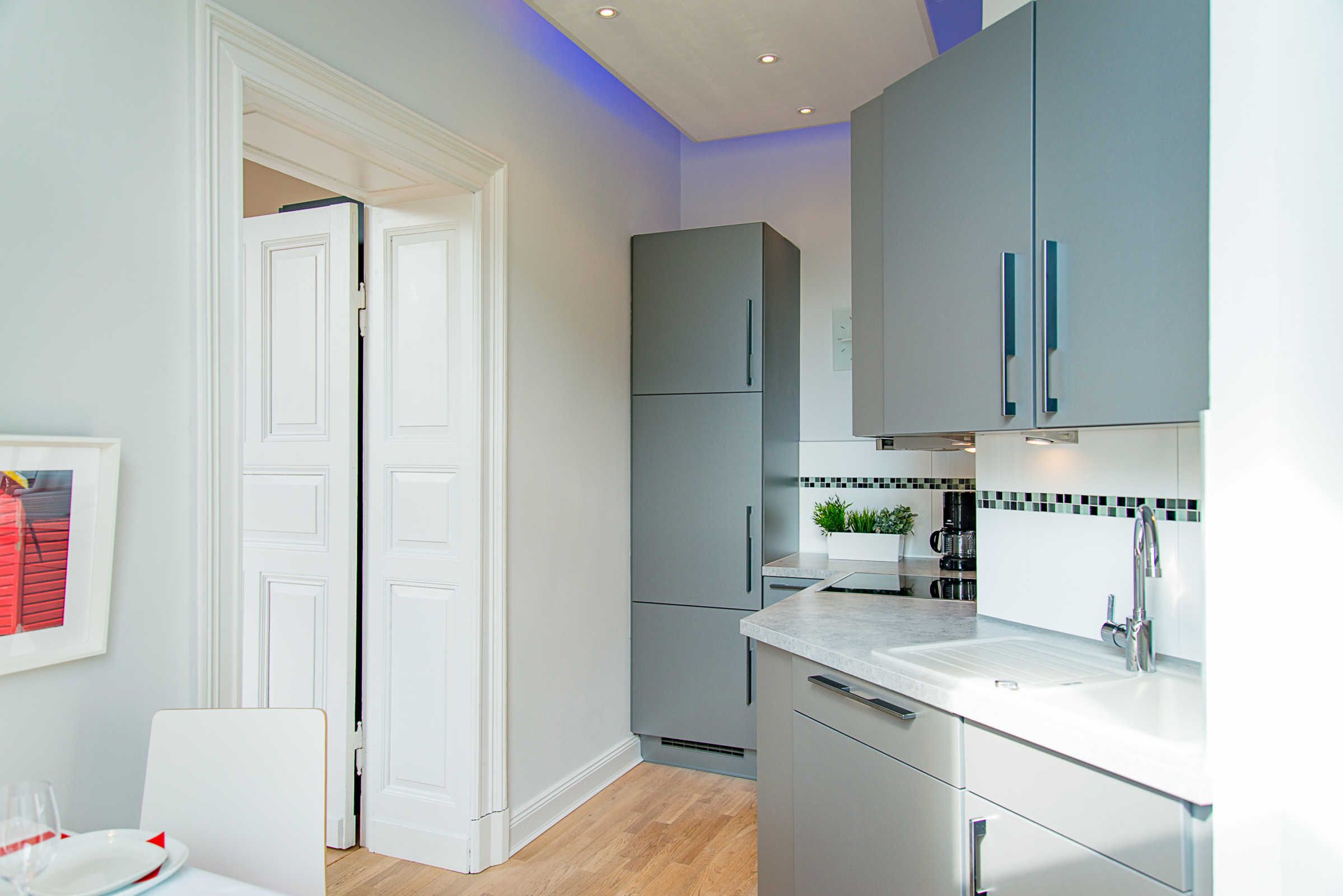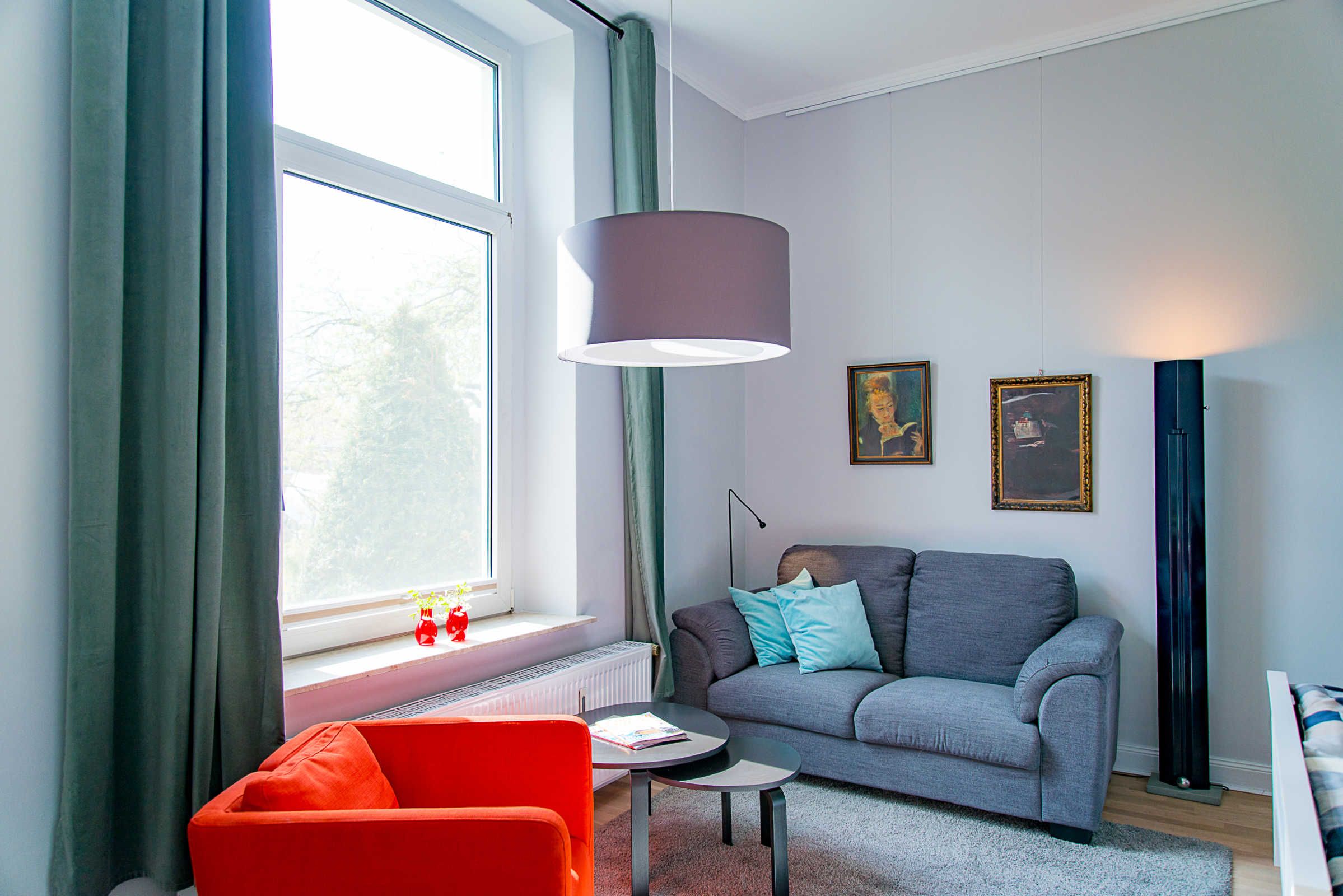 Unsere moderne 1-Zimmer-Wohnung im Erdgeschoss einer historischen Stadtvilla mit separatem Eingangangsbereich (Flur) und Garderobe, 39 qm, Deckenhöhe 3,70 m. und Eichenparkett-Boden befindet sich in zentraler, ruhiger, stadt- und strandnaher Lage.