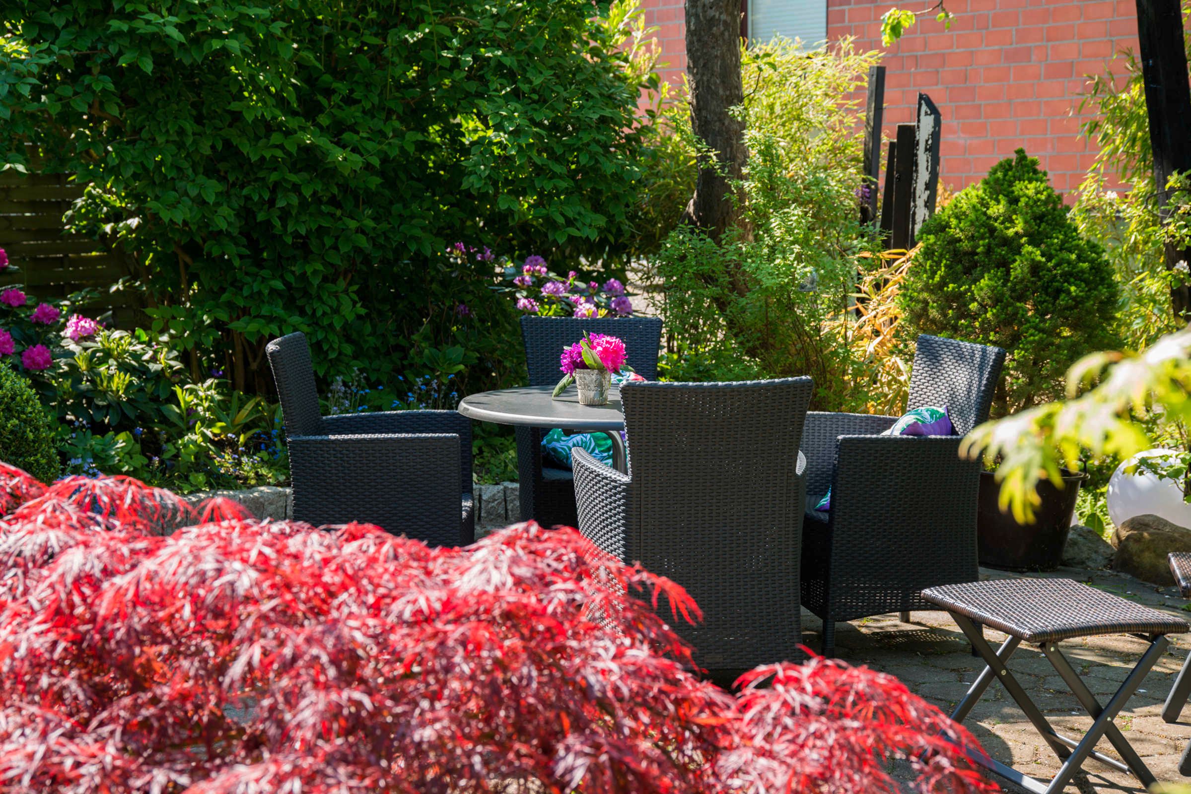 Der große Garten mit großzügigen Einzelbereichen, Sitzgruppen und Liegestühlen lädt zum Verweilen und Entspannen ein.