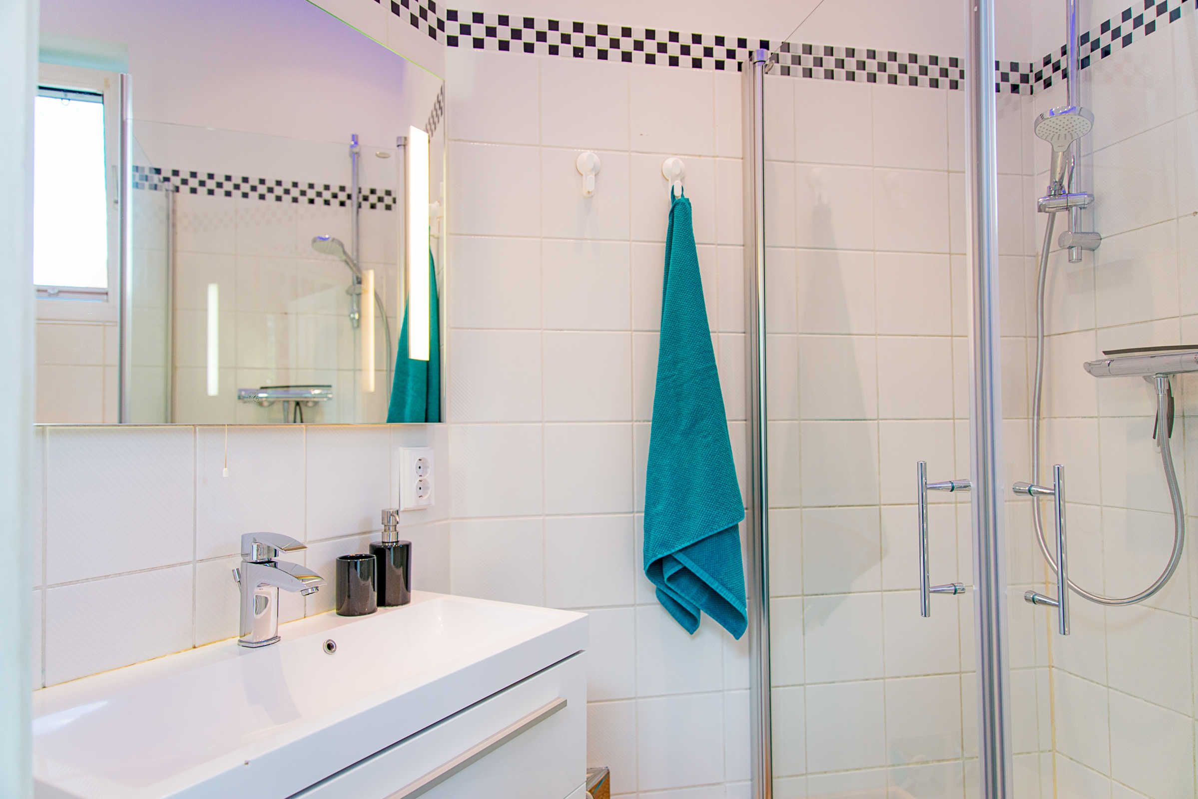 Ein Bad mit Fenster, Dusche, WC und Haartrockner ist vorhanden.