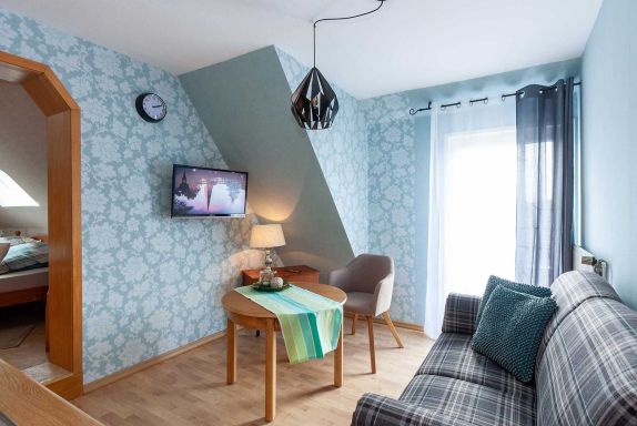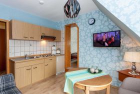 Kleine Obergeschosswohnung mit Balkon, geeignet für 2 Personen. Wohnzimmer mit SAT-TV und integrierter Küchenzeile. Schlafzimmer mit Doppelbett. Bad mit Dusche/WC.