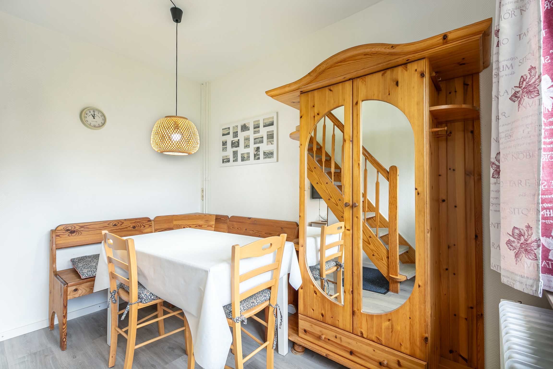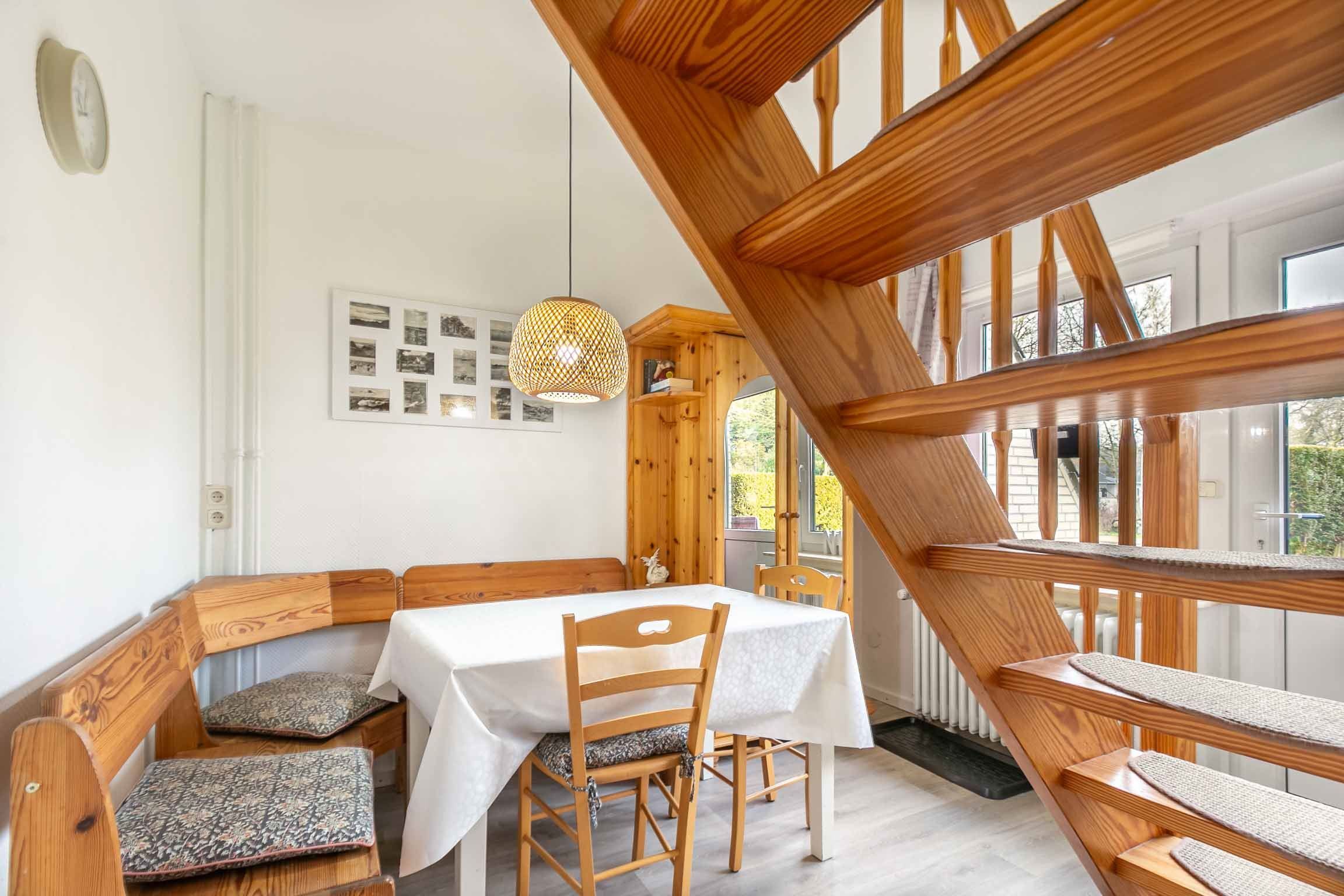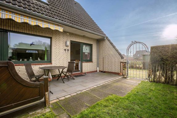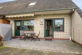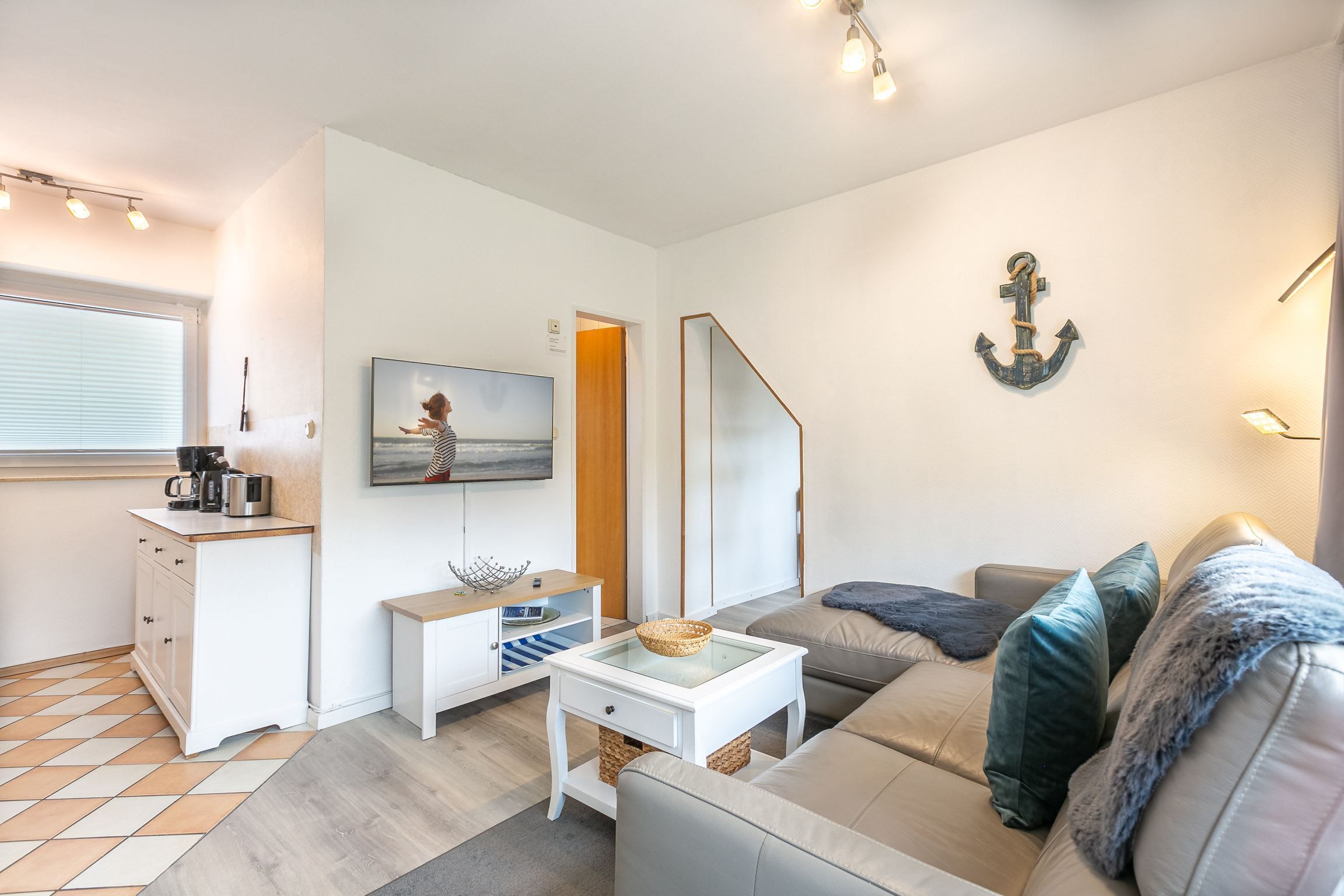 Gemütlich eingerichtetes Wohnzimmer mit elektrisch verstellbarem Lederecksofa, SMART-TV (Sat) und Stereo-Kompaktanlage. Direkter Zugang zur möblierten und windgeschützten Gartenterrasse nach Westen mit Strandkorb. Offene Küche mit Backofen, Geschirrspüler und Kühlschrank (ohne Gefrierfach). Im Eingangsbereich des Domizils befindet sich das separate Esszimmer, von dem aus eine Treppe zum 2. Schlafzimmer führt.