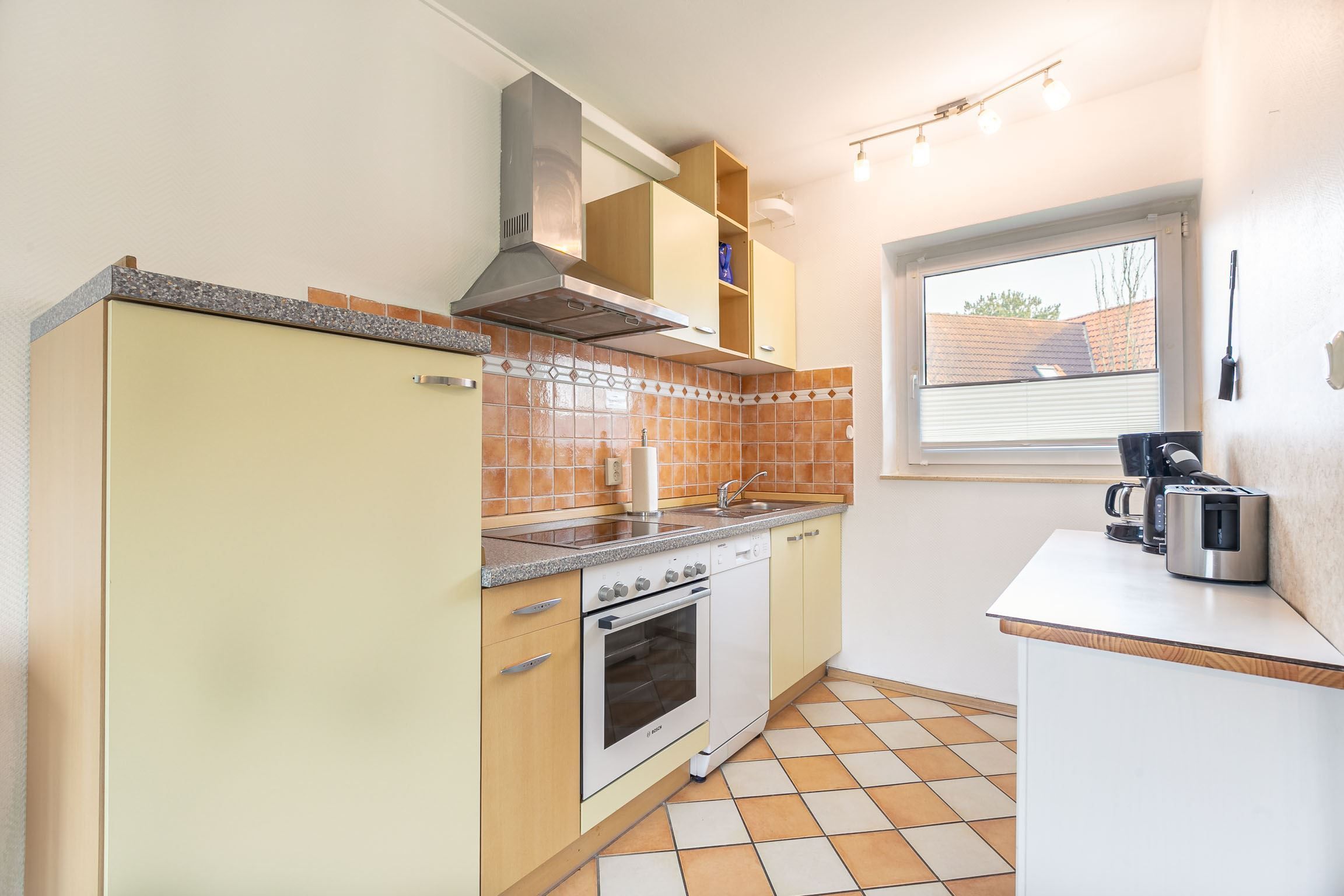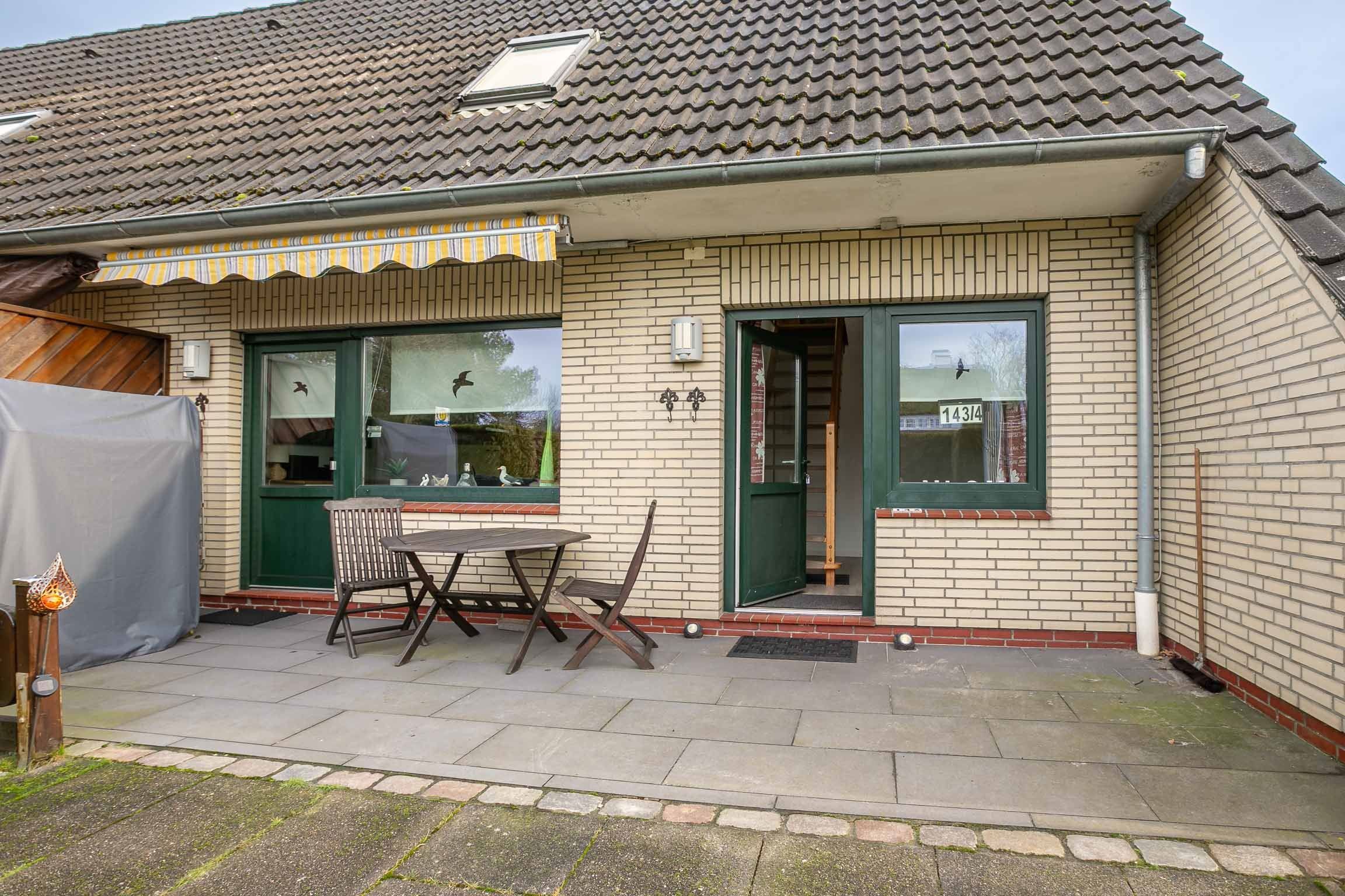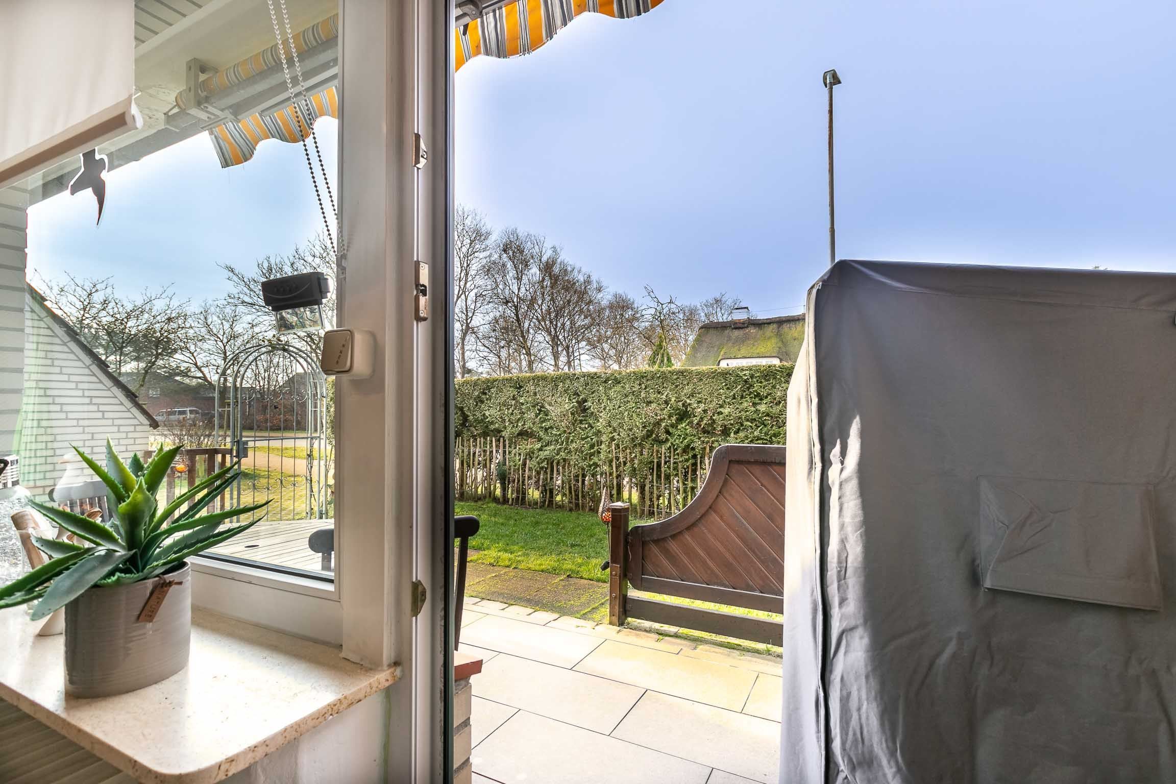 Gemütlich eingerichtetes Wohnzimmer mit elektrisch verstellbarem Lederecksofa, SMART-TV (Sat) und Stereo-Kompaktanlage. Direkter Zugang zur möblierten und windgeschützten Gartenterrasse nach Westen mit Strandkorb. Offene Küche mit Backofen, Geschirrspüler und Kühlschrank (ohne Gefrierfach). Im Eingangsbereich des Domizils befindet sich das separate Esszimmer, von dem aus eine Treppe zum 2. Schlafzimmer führt.