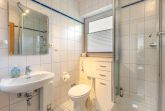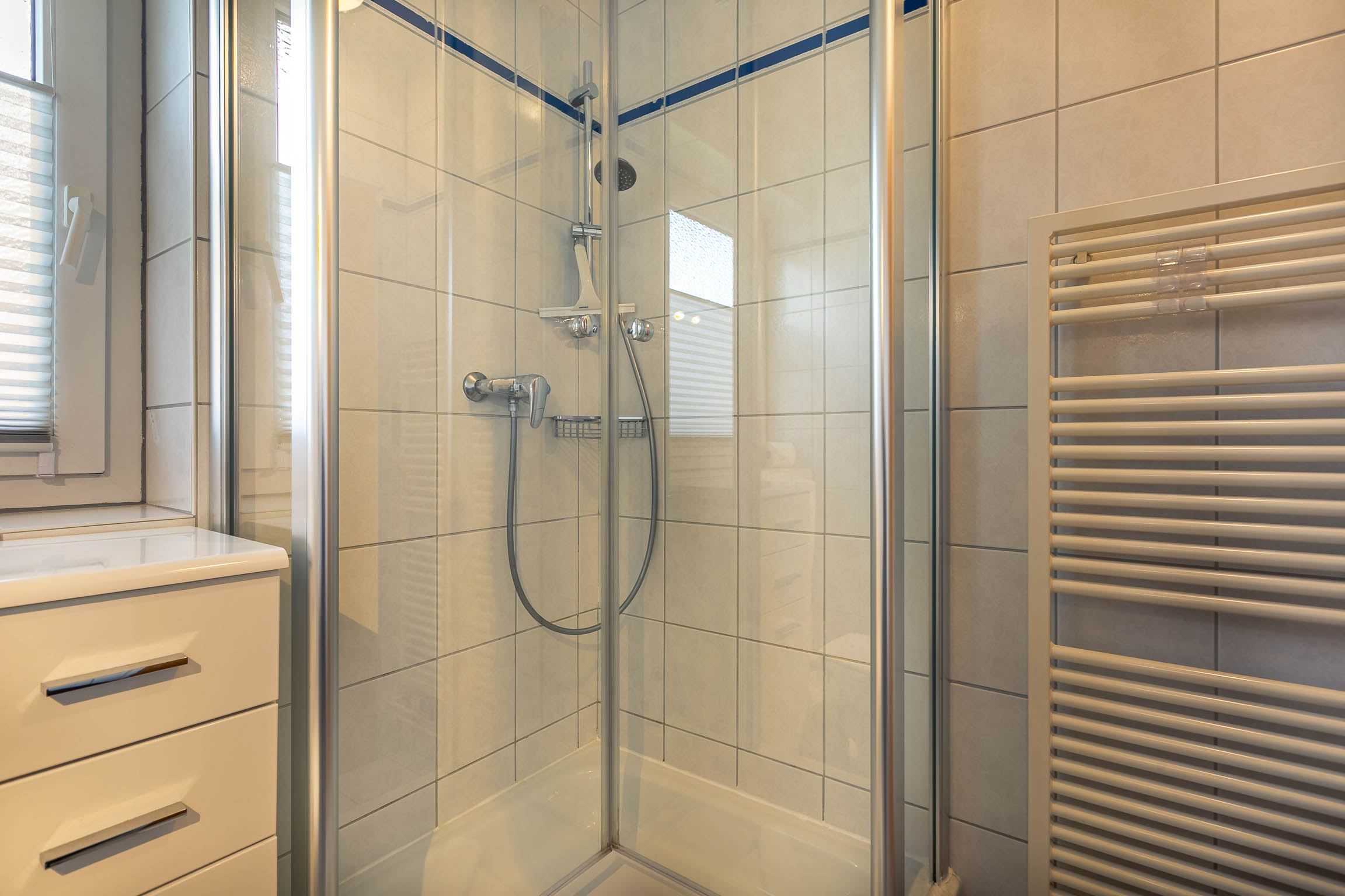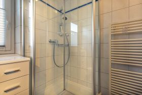 Badezimmer (Duschbad) mit Dusche, WC, Handtuchwärmer, Tageslicht und Föhn.