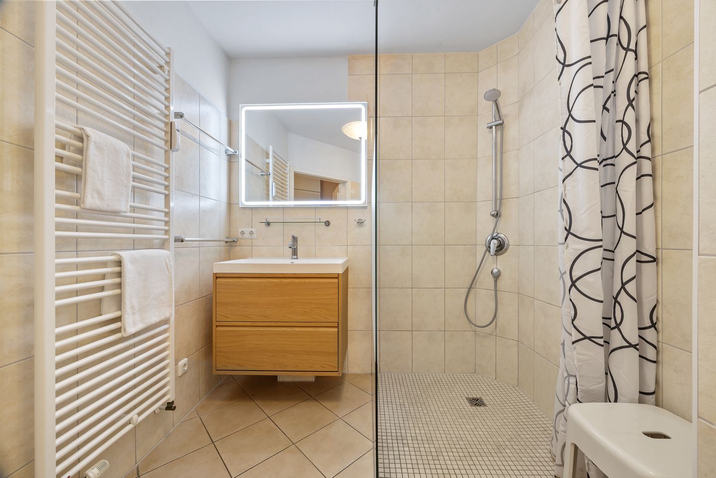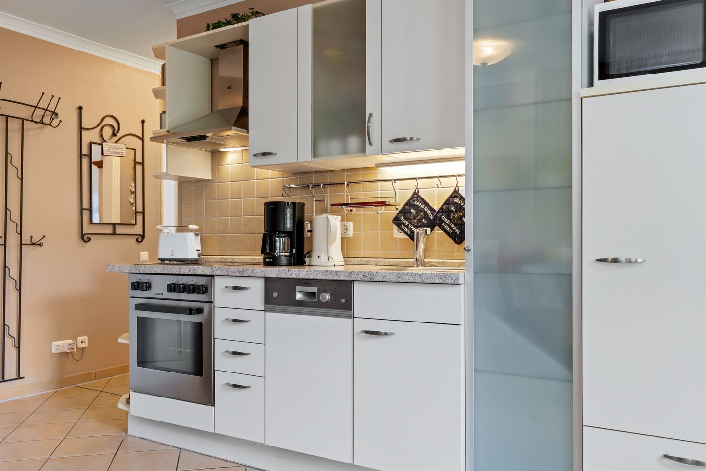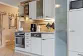 Die voll ausgestattete offene Küche verfügt über Wasserkocher, Kaffeemaschine, Toaster, Backofen, 4-Felder Ceranherd, Mikrowelle, Geschirrspüler und Gefrierfach. Das Apartment beinhaltet überdies Bügeleisen, Bügelbrett und Minisafe.