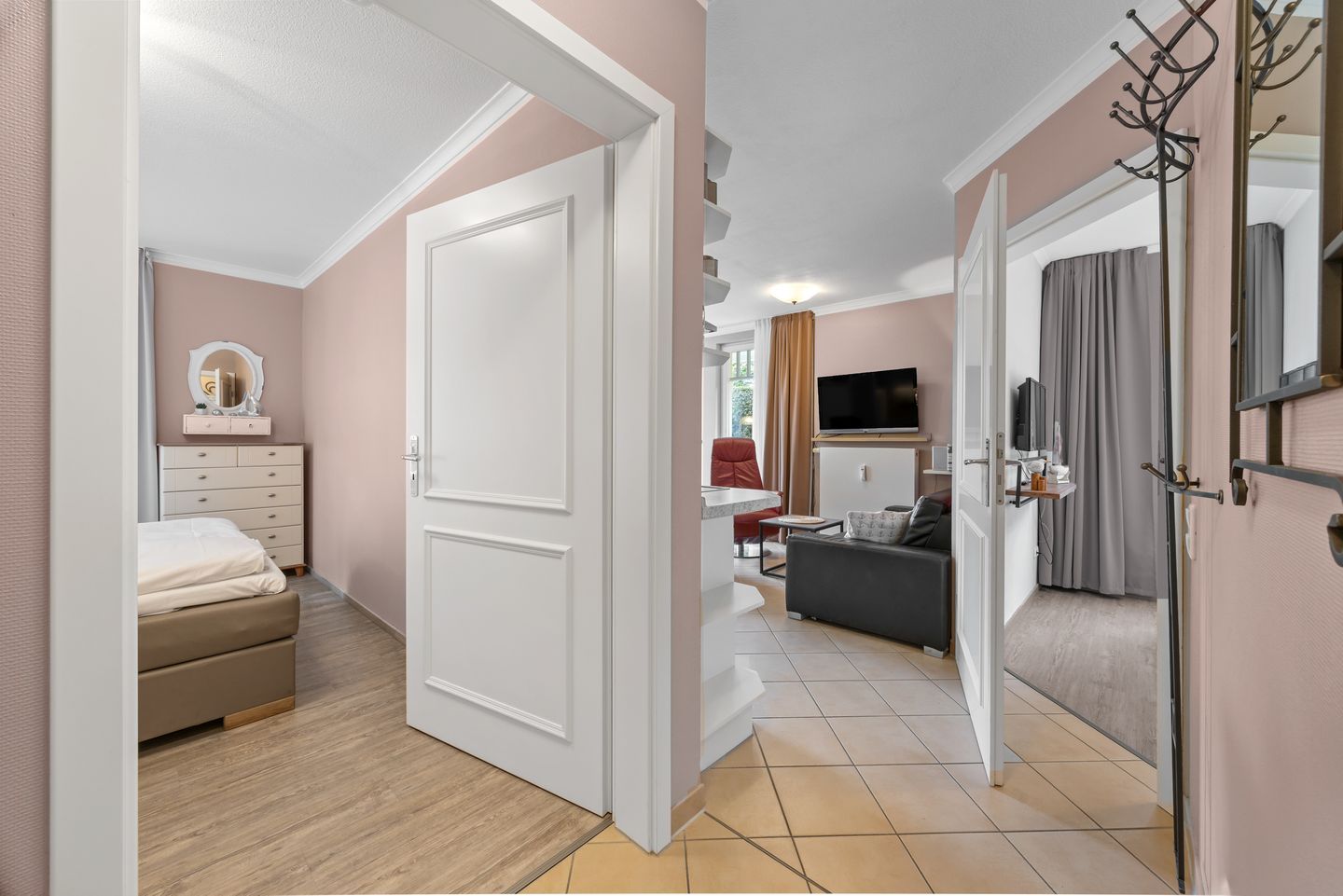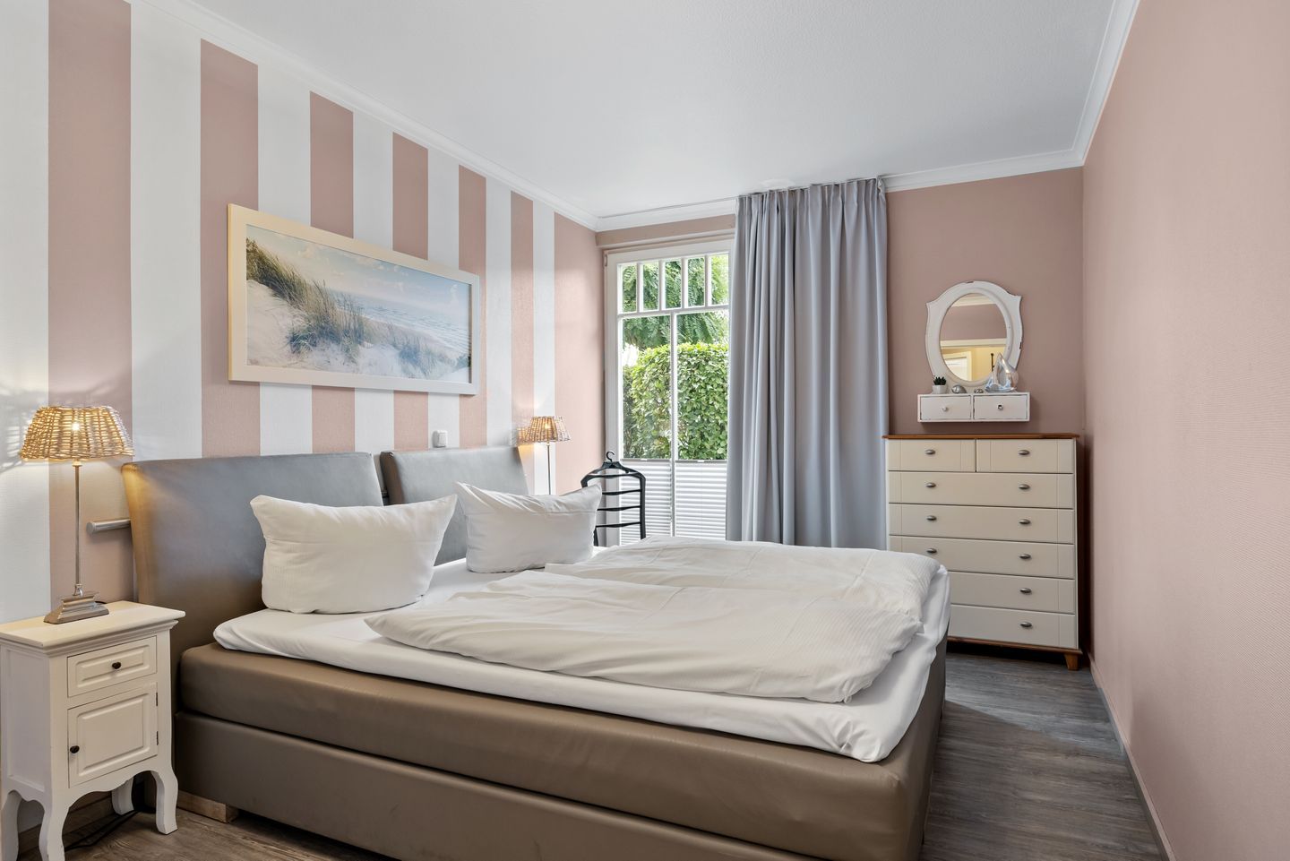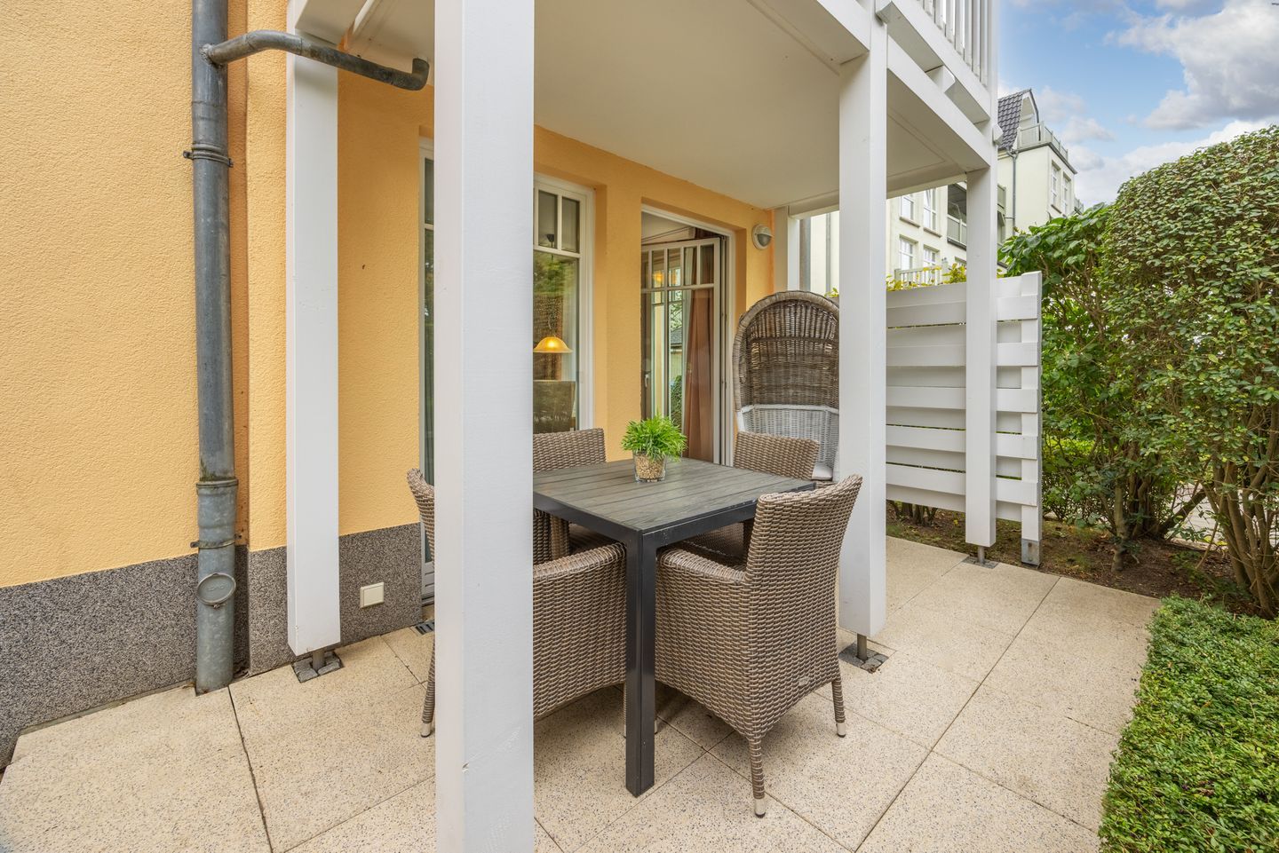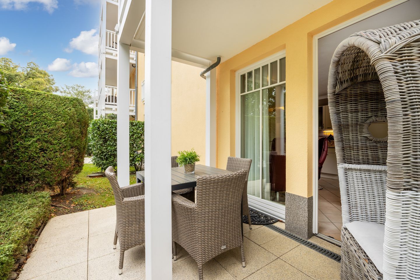 Die Ferienwohnung befindet sich im Erdgeschoss auf der Nord-Westseite der Apartmentanlage, im Haus 2, genau zwischen dem kilometerlangen Ostseestrand und dem grünen Stadtwald Kühlungsborns.