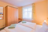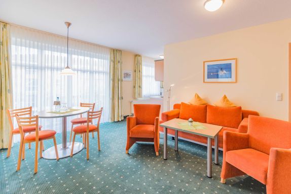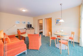 Das 3-Zimmer-Apartment mit Teppichboden befindet sich im 1. OG des Am Weststrand Apartmenthaus Bellamare. Mit ca. 55 m² Wohnfläche und einem Balkon zur sonnigen Südseite besteht das Apartment aus einem Wohnzimmer, zwei separaten Schlafzimmern, einer voll ausgestatteten Küchenzeile mit Geschirrspülmaschine, Kühlschrank, Mikrowelle, Zwei-Platten-Cerankochfeld, Kaffeemaschine, Wasserkocher und Toaster. Das eine Schlafzimmer verfügt über ein Doppelbett und das zweite Schlafzimmer ist mit einem Etagenbett ausgestattet. Im Wohnzimmer gibt es eine Sitzecke mit Couch und Sessel sowie einen Esstisch mit 4 Stühlen. Die Couch im Wohnzimmer ist ebenfalls ausklappbar und mit einer Größe von 1.40 x 2,00 m zum Schlafen für 1 bis 2 Personen geeignet. Weiterhin gibt es ein Bad mit Dusche, WC und Waschbecken sowie einen Flur. Das Apartment ist für maximal 3 Erwachsene und insgesamt 5 Personen geeignet. Haustiere sind in diesem Apartment nicht gestattet.