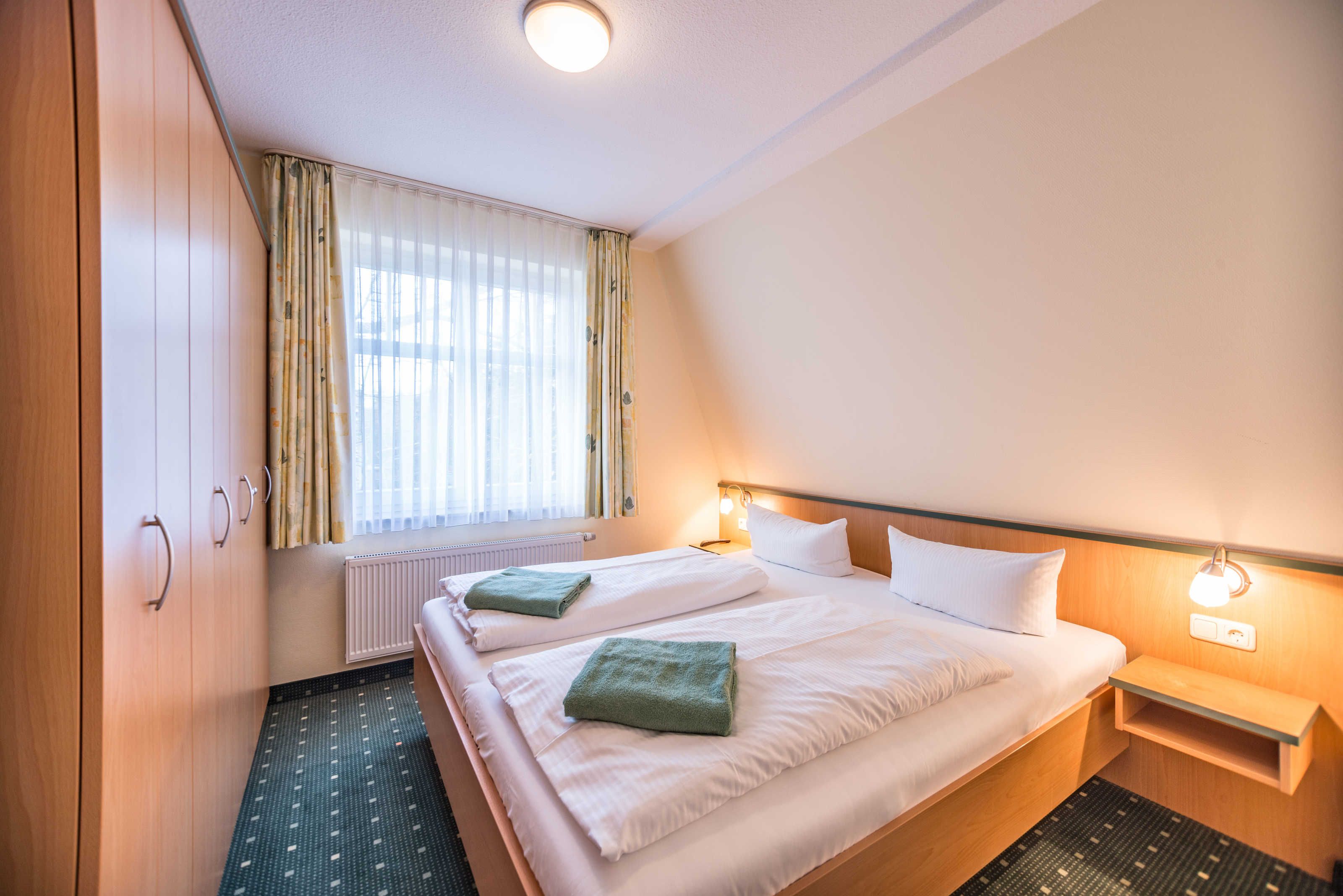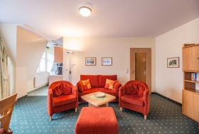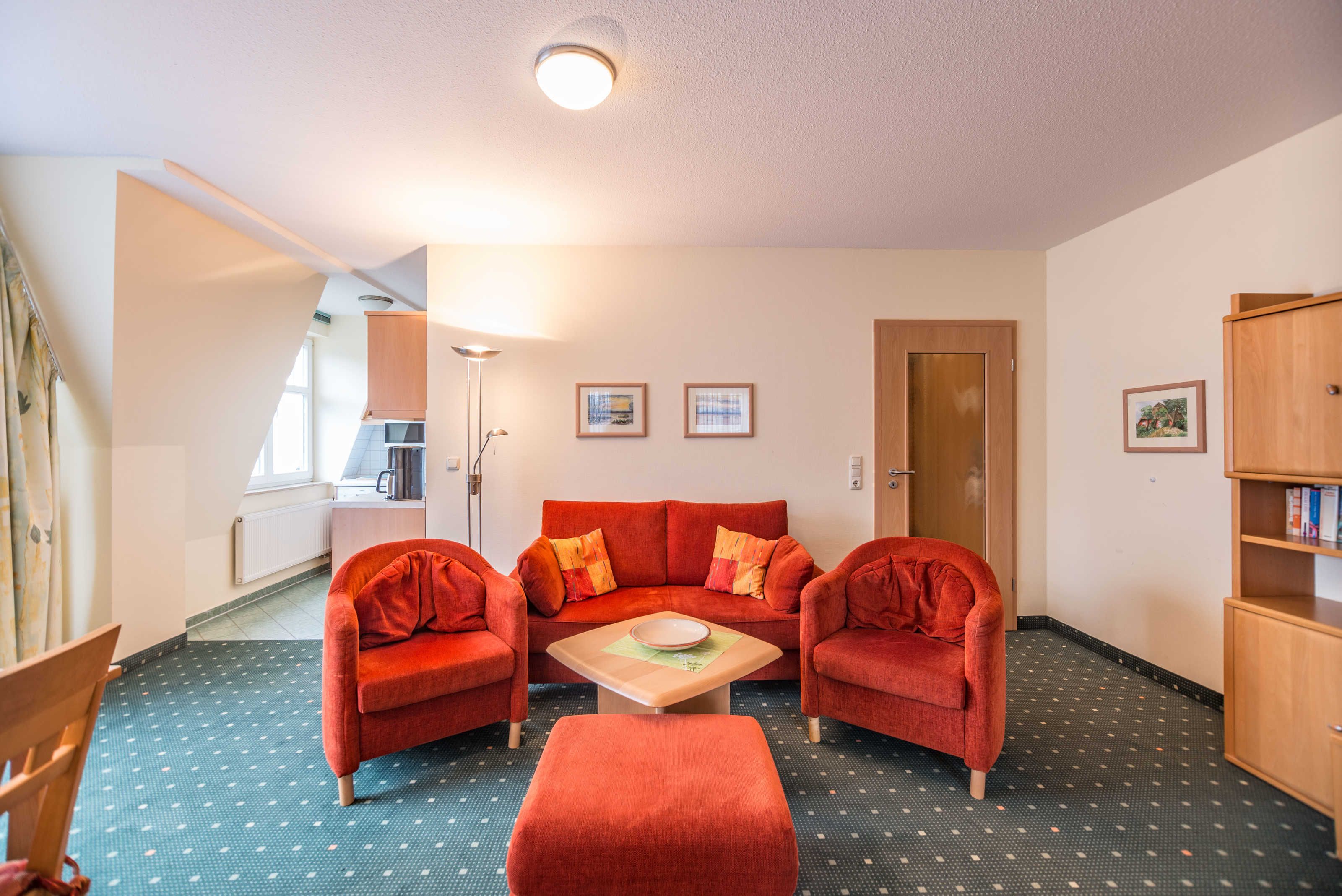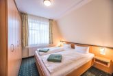 Das 3-Zimmer-Apartment mit Teppichboden befindet sich im 2. OG des Am Weststrand Apartmenthaus Bellamare. Mit ca. 50 m² Wohnfläche und einem Balkon zur sonnigen Südseite besteht das Apartment aus einem Wohnzimmer, zwei separaten Schlafzimmern, einer voll ausgestatteten Küchenzeile mit Geschirrspülmaschine, Kühlschrank, Mikrowelle, Zwei-Platten-Cerankochfeld, Kaffeemaschine, Wasserkocher und Toaster. Das eine Schlafzimmer verfügt über ein Doppelbett und ein TV-Gerät. Das zweite Schlafzimmer ist mit einem Einzelbett ausgestattet. Im Wohnzimmer gibt es eine Sitzecke mit Couch und Sessel sowie eine Esstisch mit 4 Stühlen. Die Couch im Wohnzimmer ist ebenfalls ausklappbar und mit einer Größe von 1.40 x 2.00 m zum Schlafen für 1 bis 2 Personen geeignet. Weiterhin gibt es ein Bad mit Dusche, WC und Waschbecken sowie einen Flur. Das Apartment ist für maximal 4 Erwachsene und insgesamt 5 Personen geeignet. Haustiere sind in diesem Apartment nicht gestattet.