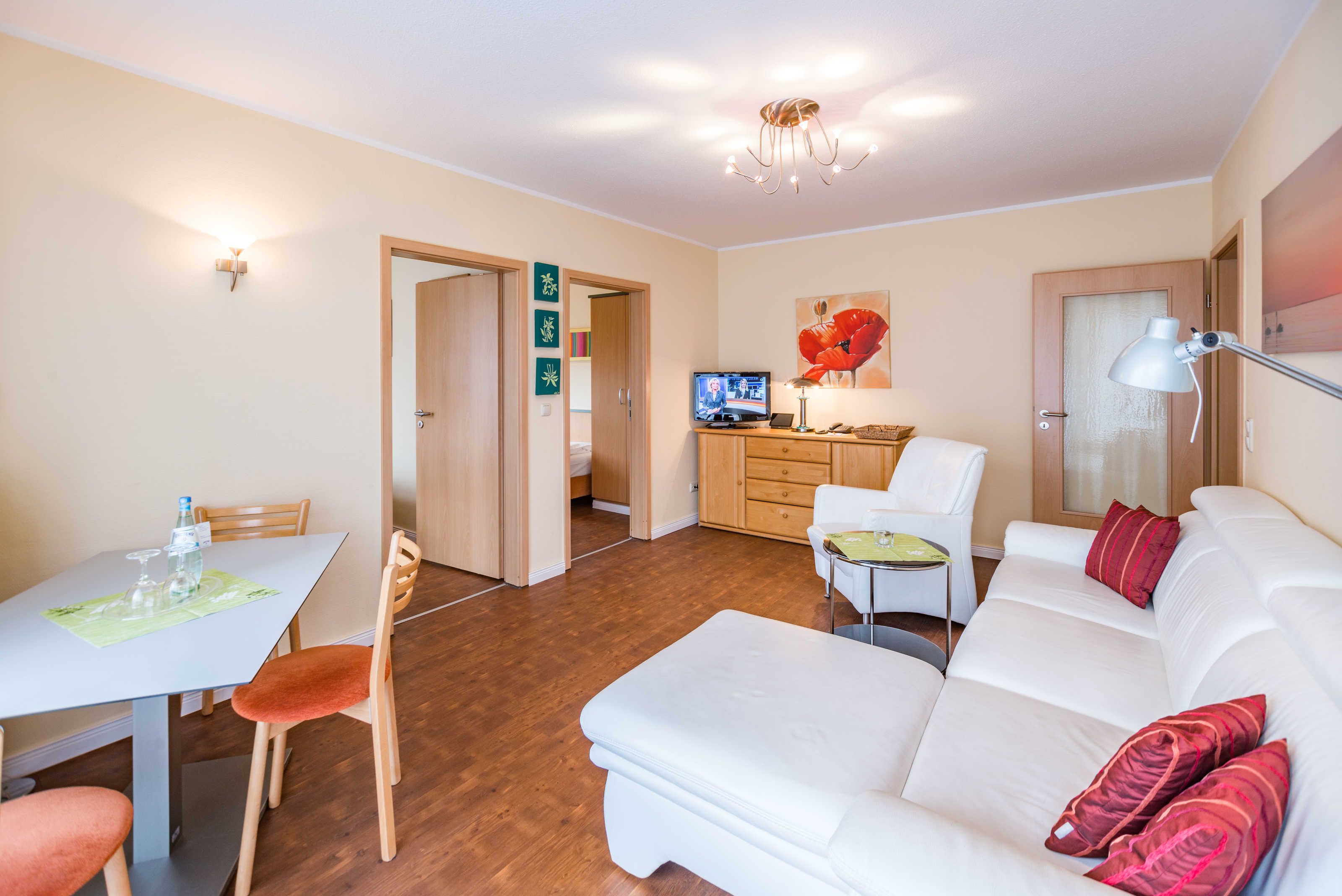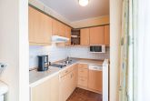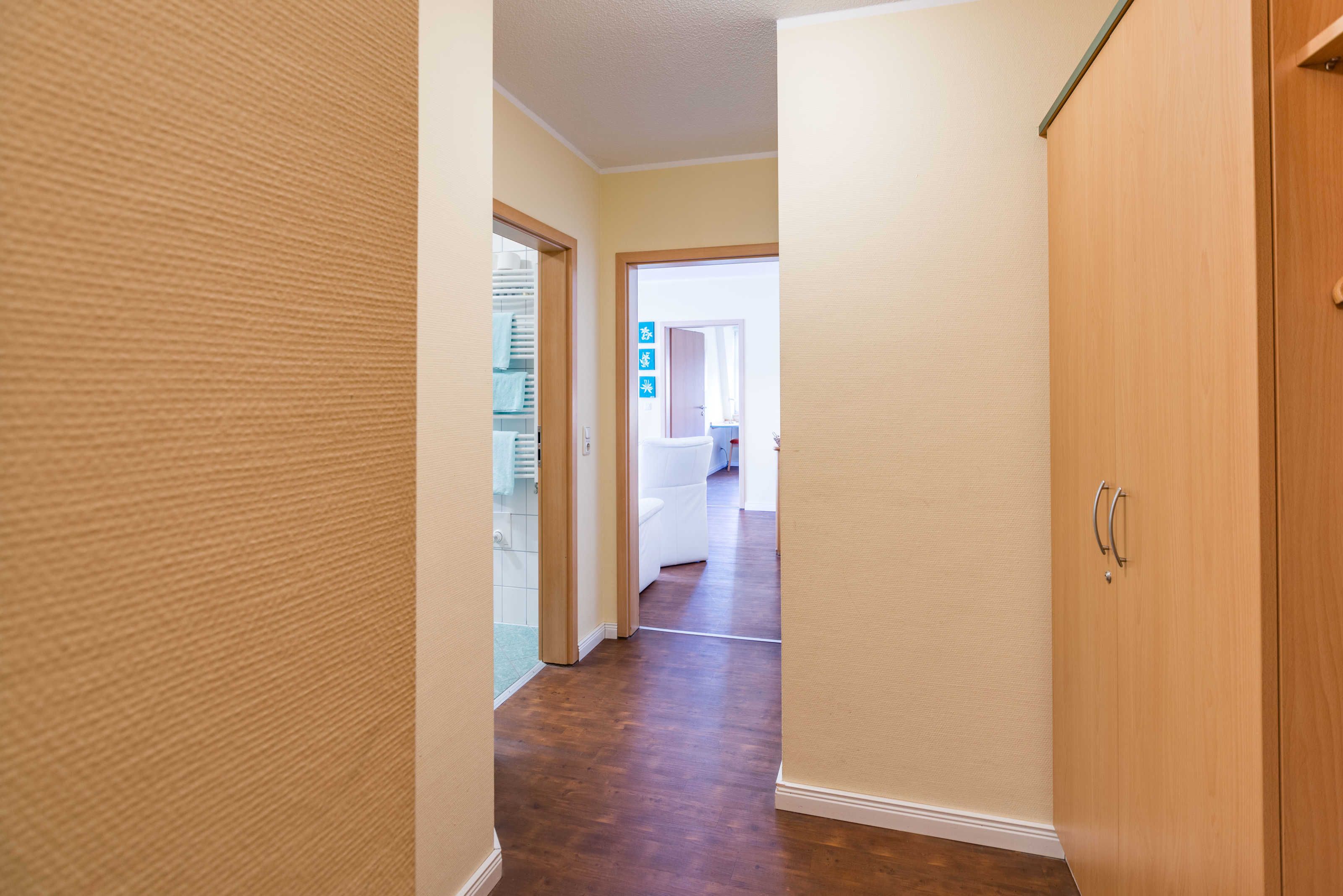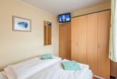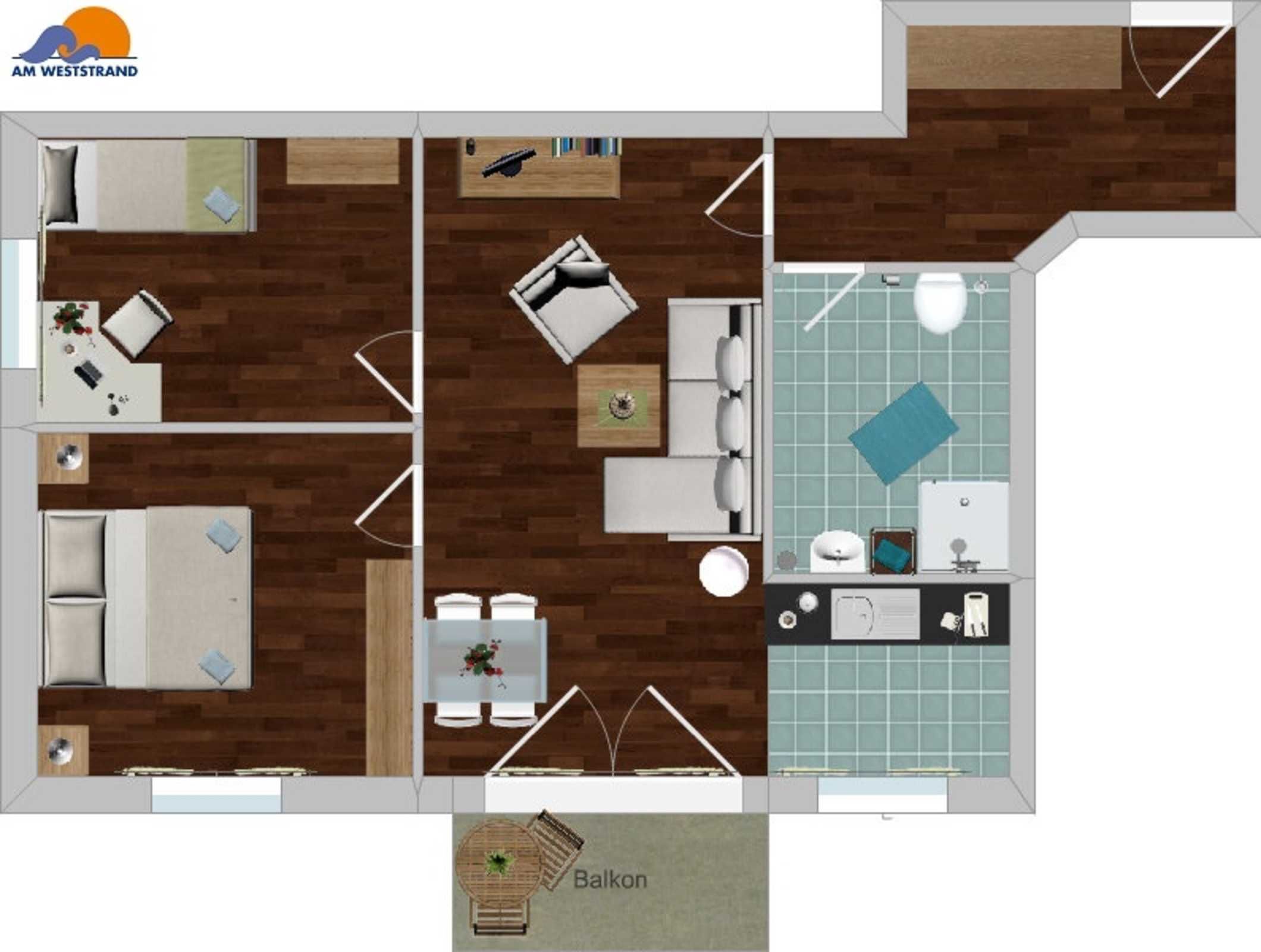 Das 3-Zimmer-Apartment mit Holzbodenoptik befindet sich im 2. OG des Am Weststrand Apartmenthaus Bellamare. Mit ca. 50 m² Wohnfläche und einem Balkon zur sonnigen Südseite besteht das Apartment aus einem Wohnzimmer, zwei separaten Schlafzimmern, einer voll ausgestatteten Küchenzeile mit Geschirrspülmaschine, Kühlschrank, Mikrowelle, Zwei-Platten-Cerankochfeld, Kaffeemaschine, Wasserkocher und Toaster. Das eine Schlafzimmer verfügt über ein Doppelbett und ein TV-Gerät. Das zweite Schlafzimmer ist mit einem Einzelbett ausgestattet. Im Wohnzimmer gibt es eine Sitzecke mit einer Couch und Sessel sowie eine Esstisch mit 4 Stühlen. Die Couch im Wohnzimmer ist ebenfalls ausklappbar und mit einer Größe von 1.40 x 2.00 m zum Schlafen für 1 Person geeignet. Weiterhin gibt es ein Bad mit Dusche, WC und Waschbecken sowie einen Flur. Das Apartment ist für maximal 4 Personen geeignet. Haustiere sind in diesem Apartment willkommen.
