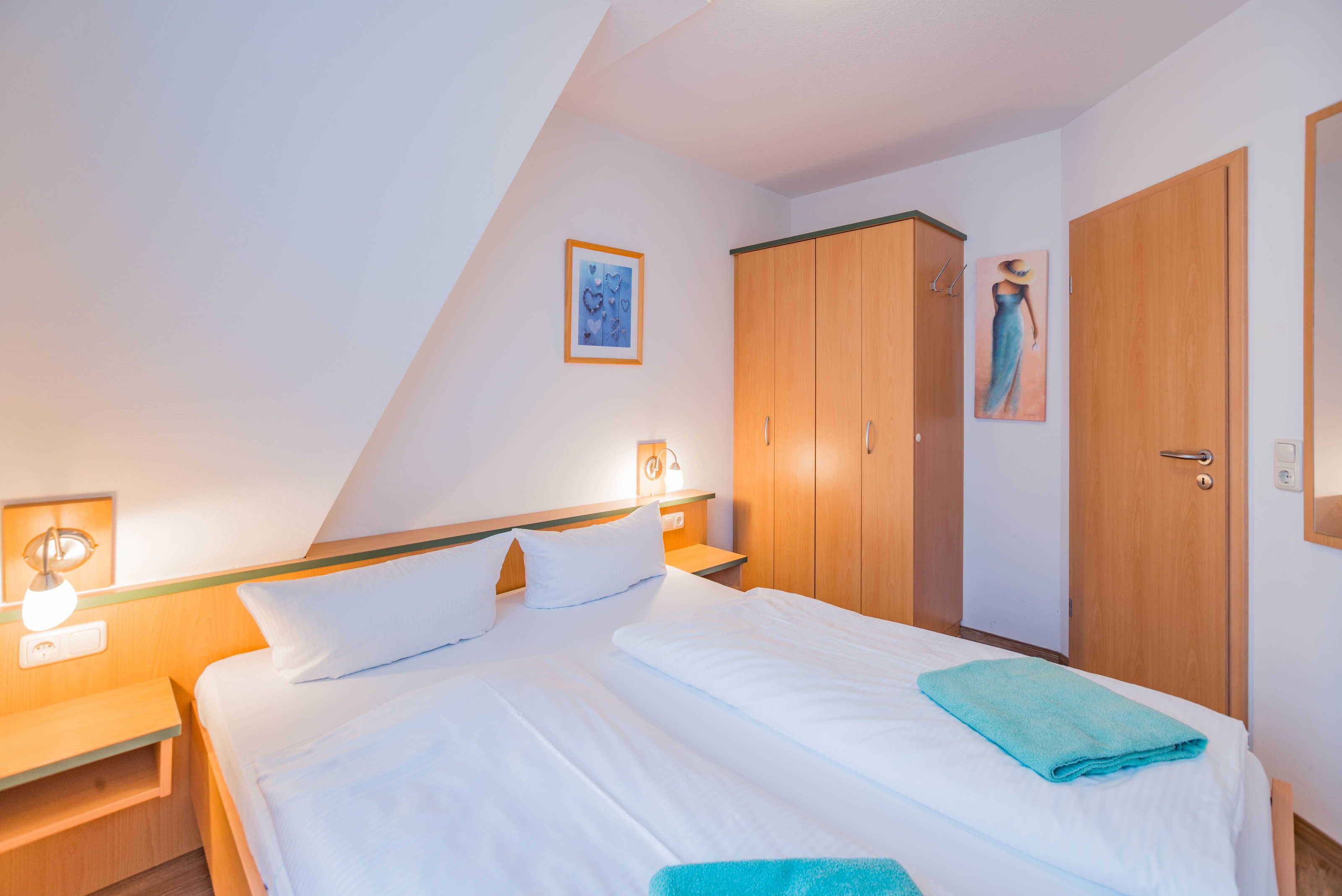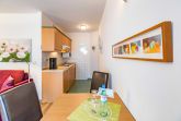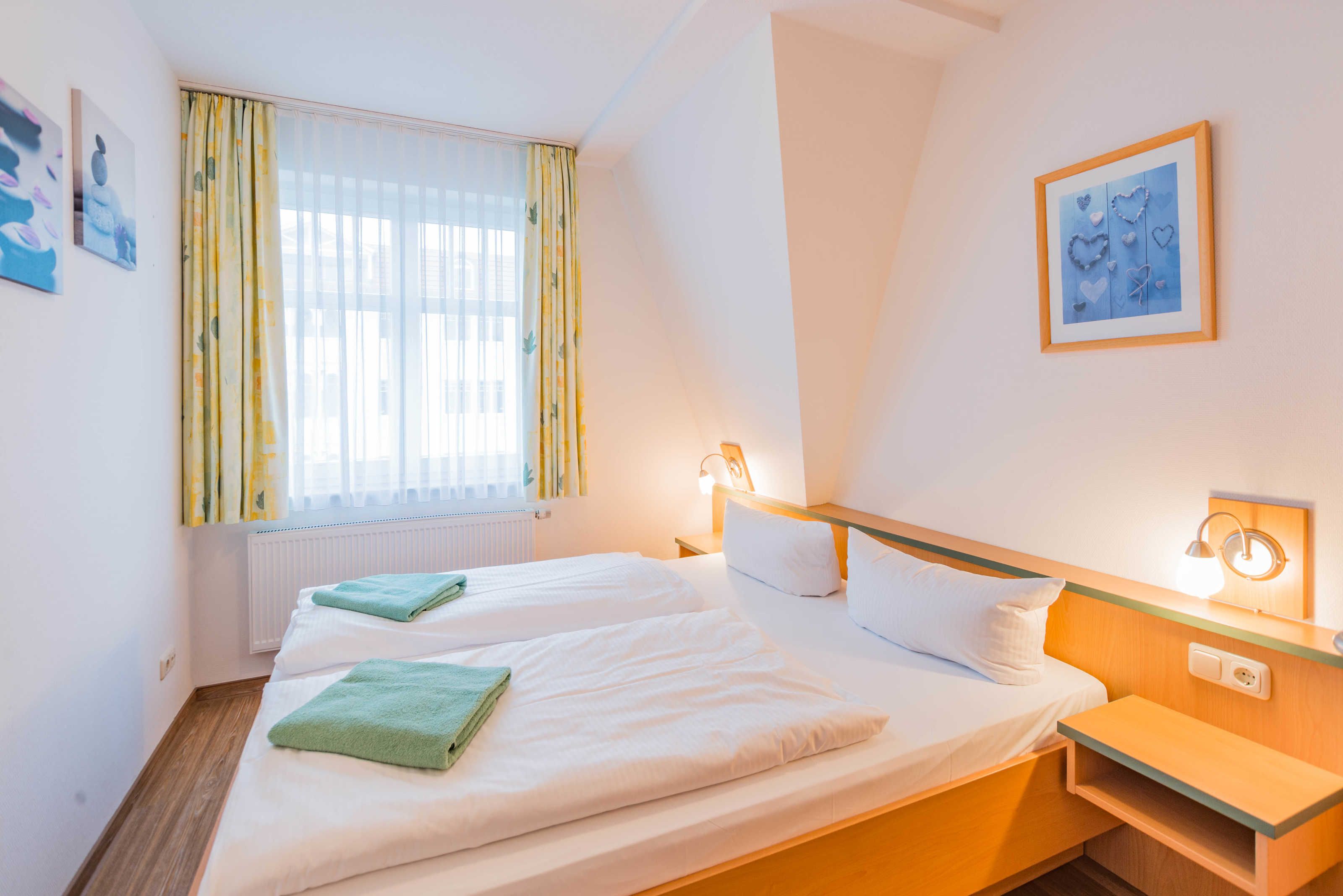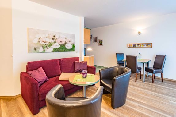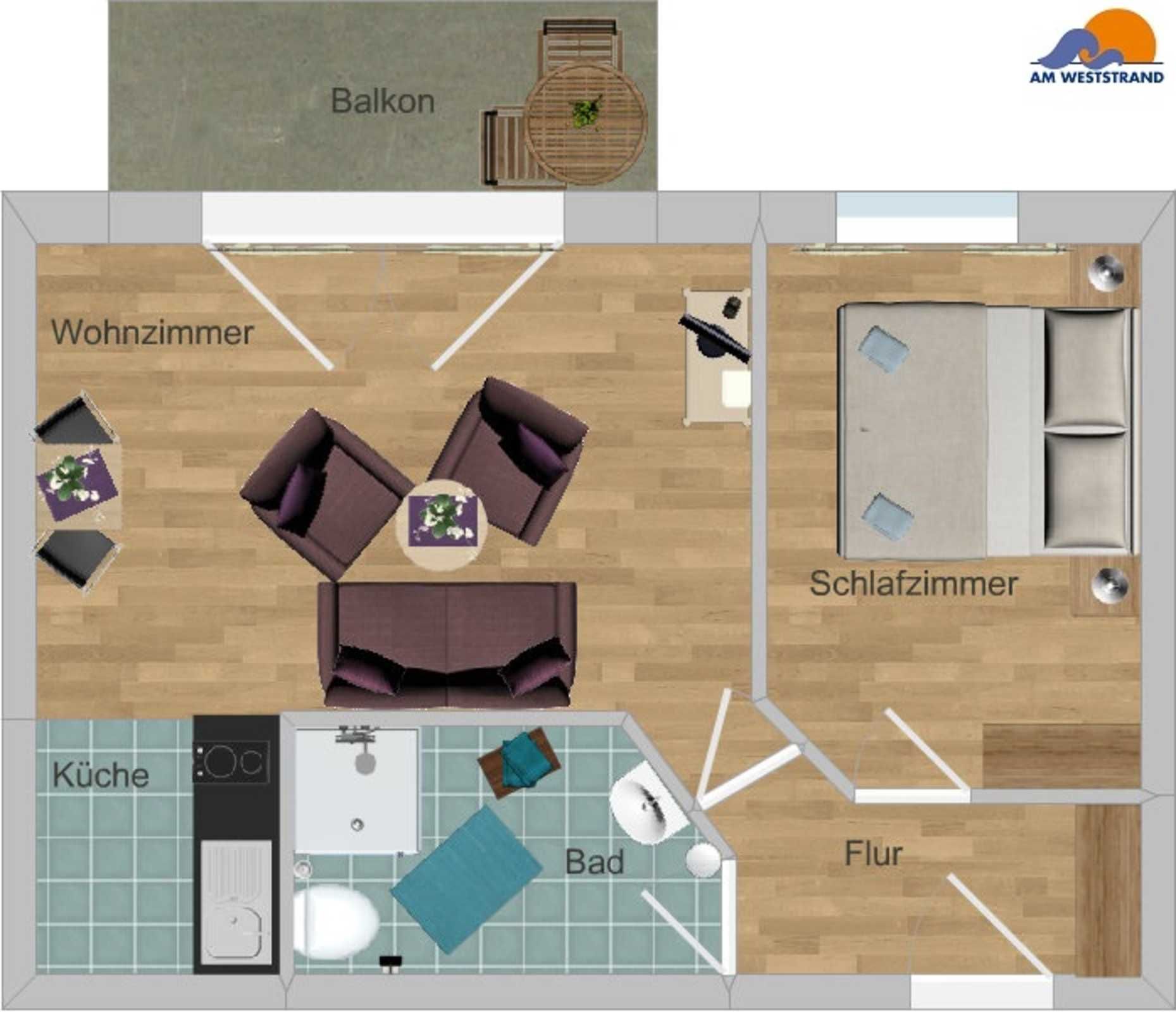 Das 2-Zimmer-Apartment mit Holzoptikboden befindet sich im 2. OG des Am Weststrand Apartmenthaus Bellamare. Mit ca. 40 m² Wohnfläche und einem Balkon zur Nordseite besteht das Apartment aus einem Wohnzimmer, einem Schlafzimmer, einer voll ausgestatteten Küchenzeile mit Geschirrspülmaschine, Kühlschrank, Mikrowelle, Zwei-Platten-Cerankochfeld, Kaffeemaschine, Wasserkocher und Toaster. Das Schlafzimmer verfügt über ein Doppelbett. Im Wohnzimmer gibt es eine Sitzecke mit Couch und Sessel sowie einen Esstisch mit 4 Stühlen. Das Schlafsofa im Wohnbereich ist ausklappbar und 1.40 x 2.00 m groß. Somit ist es für 1 bis 2 Personen geeignet. Weiterhin gibt es ein Bad mit Dusche, WC und Waschbecken sowie einen Flur. Das Apartment ist für maximal 4 Personen geeignet. Haustiere sind in diesem Apartment nicht gestattet.