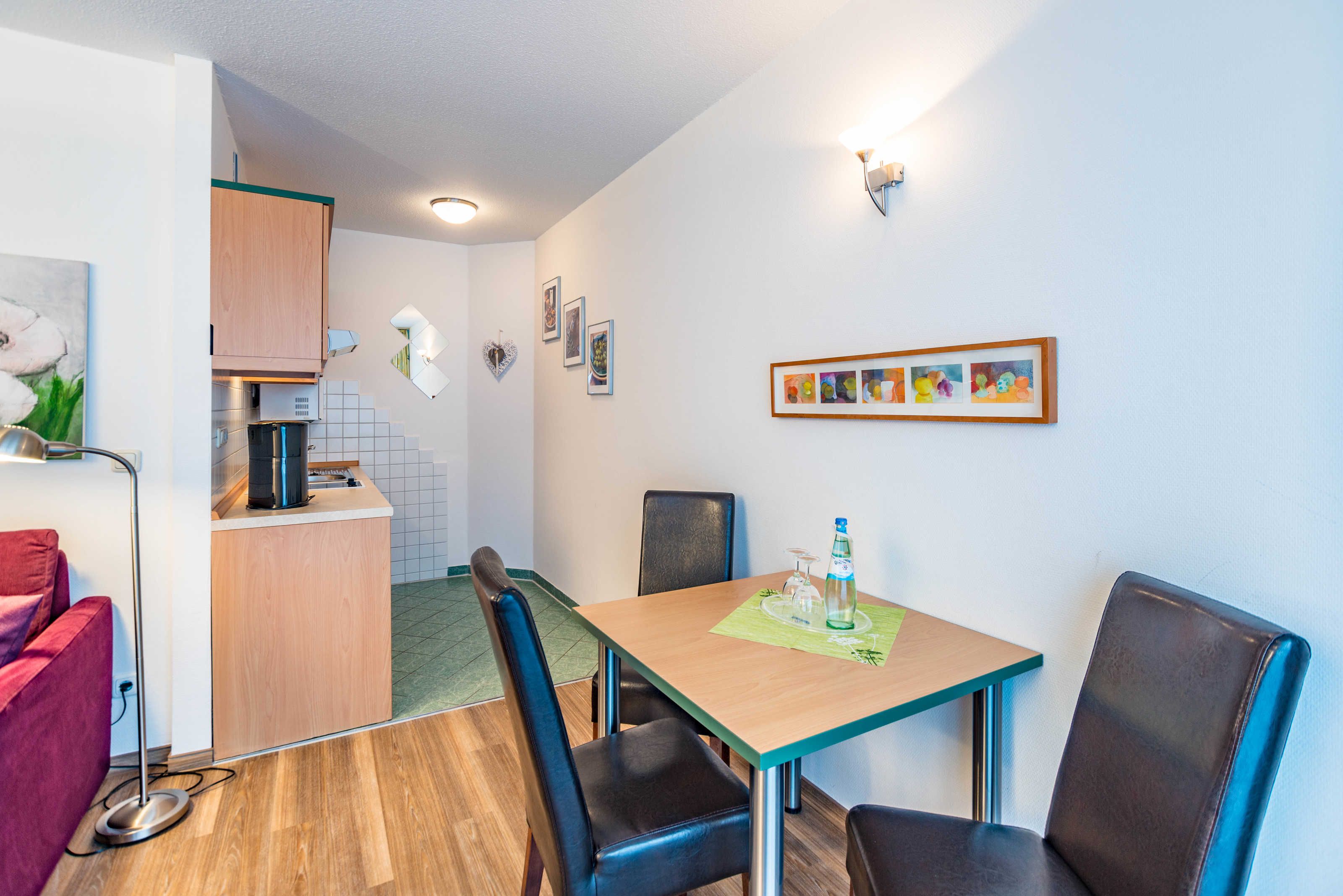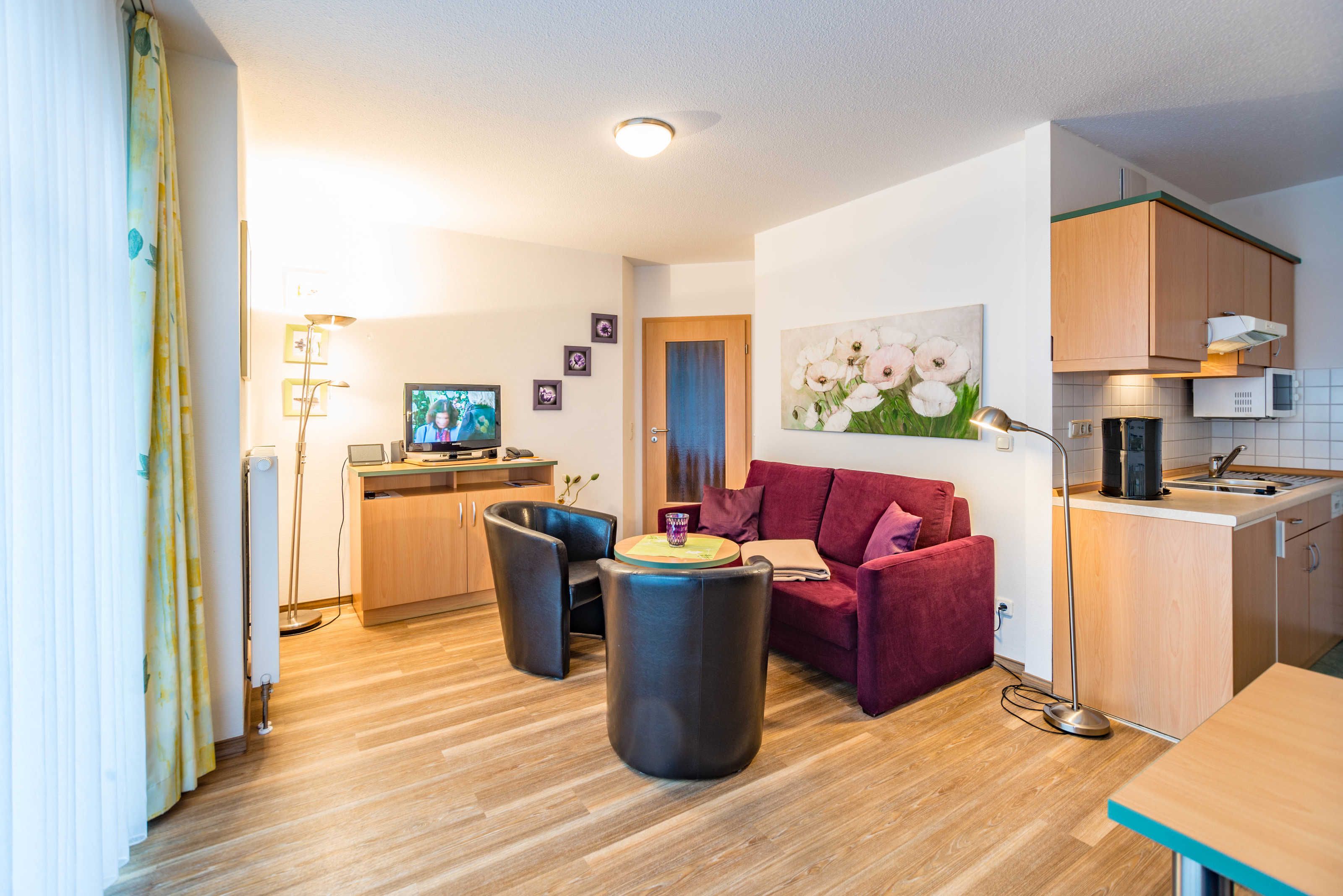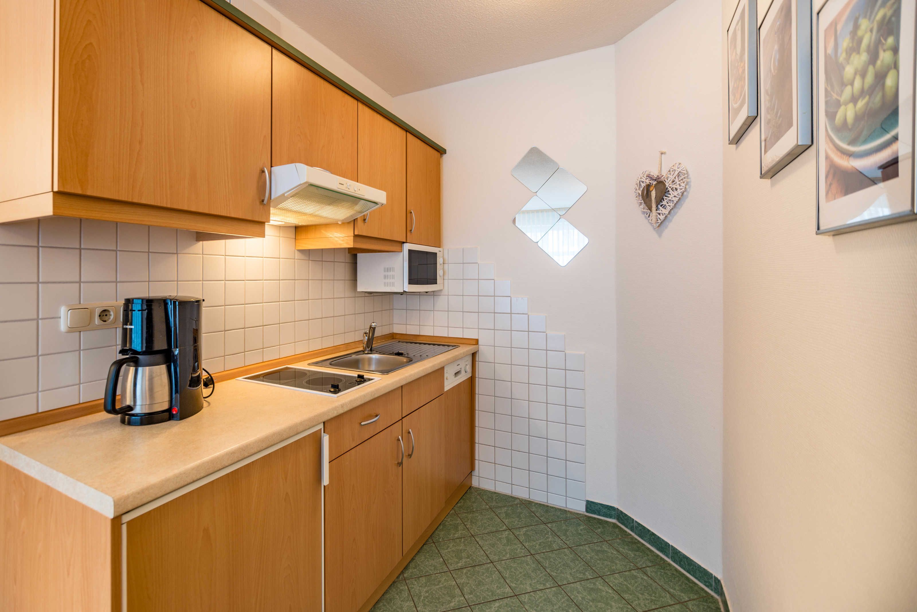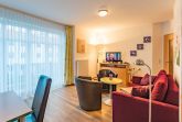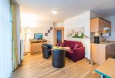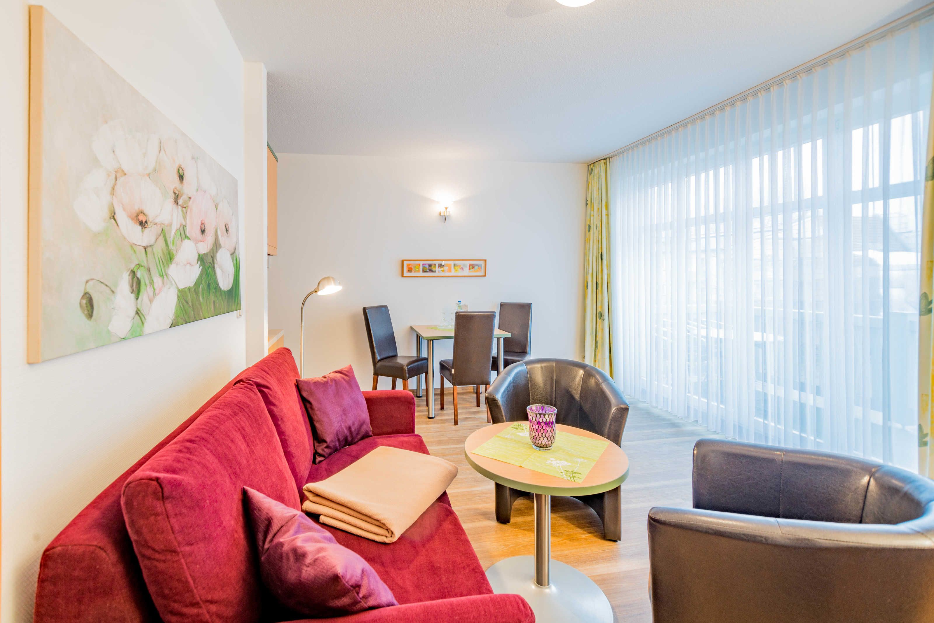 Das 2-Zimmer-Apartment mit Holzoptikboden befindet sich im 2. OG des Am Weststrand Apartmenthaus Bellamare. Mit ca. 40 m² Wohnfläche und einem Balkon zur Nordseite besteht das Apartment aus einem Wohnzimmer, einem Schlafzimmer, einer voll ausgestatteten Küchenzeile mit Geschirrspülmaschine, Kühlschrank, Mikrowelle, Zwei-Platten-Cerankochfeld, Kaffeemaschine, Wasserkocher und Toaster. Das Schlafzimmer verfügt über ein Doppelbett. Im Wohnzimmer gibt es eine Sitzecke mit Couch und Sessel sowie einen Esstisch mit 4 Stühlen. Das Schlafsofa im Wohnbereich ist ausklappbar und 1.40 x 2.00 m groß. Somit ist es für 1 bis 2 Personen geeignet. Weiterhin gibt es ein Bad mit Dusche, WC und Waschbecken sowie einen Flur. Das Apartment ist für maximal 4 Personen geeignet. Haustiere sind in diesem Apartment nicht gestattet.
