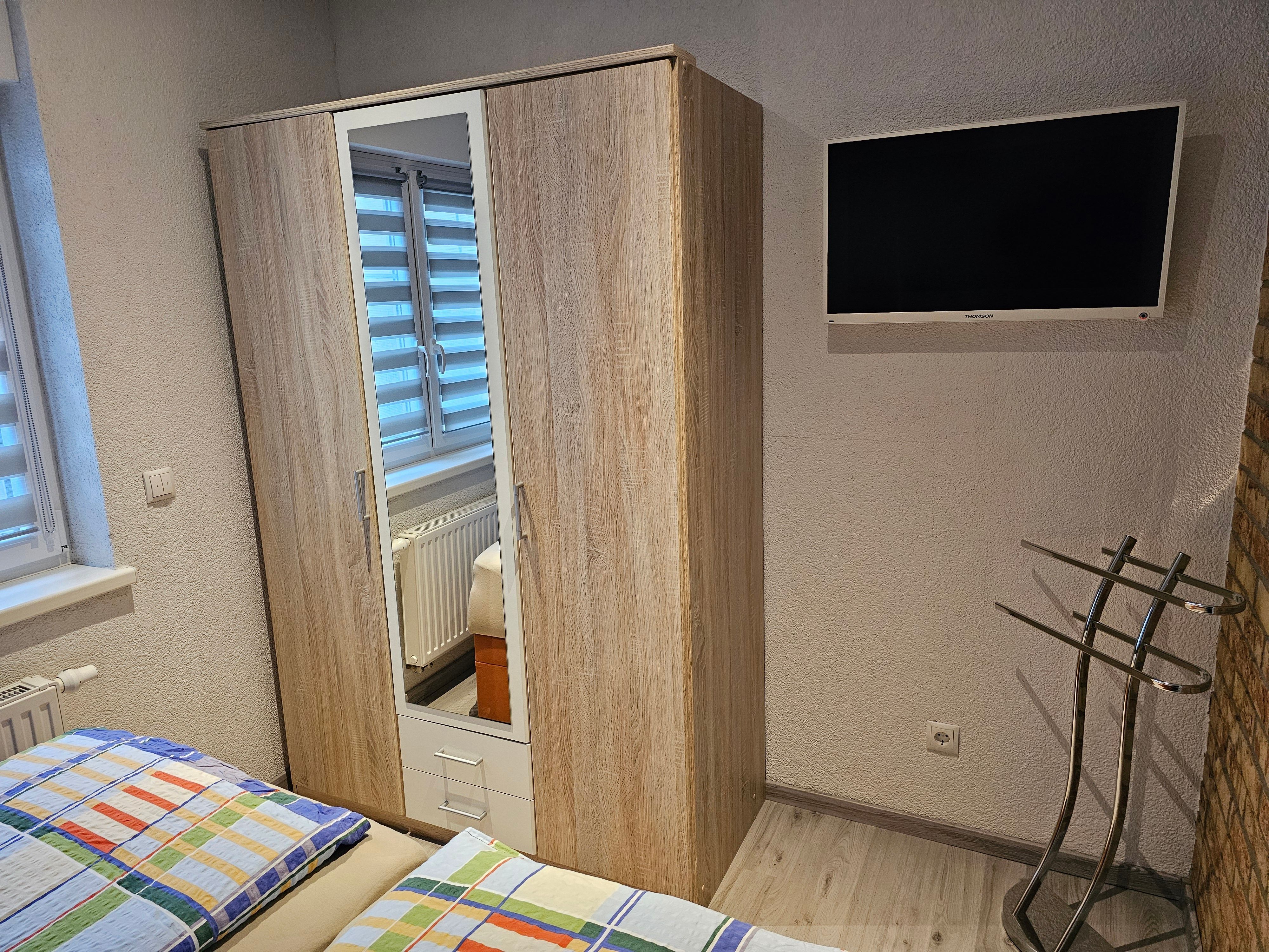 Schlafraum: Doppelbett 1.80 x 2.00 m, Kleiderschrank, Flachbild-TV in Full-HD, Kabel-TV
