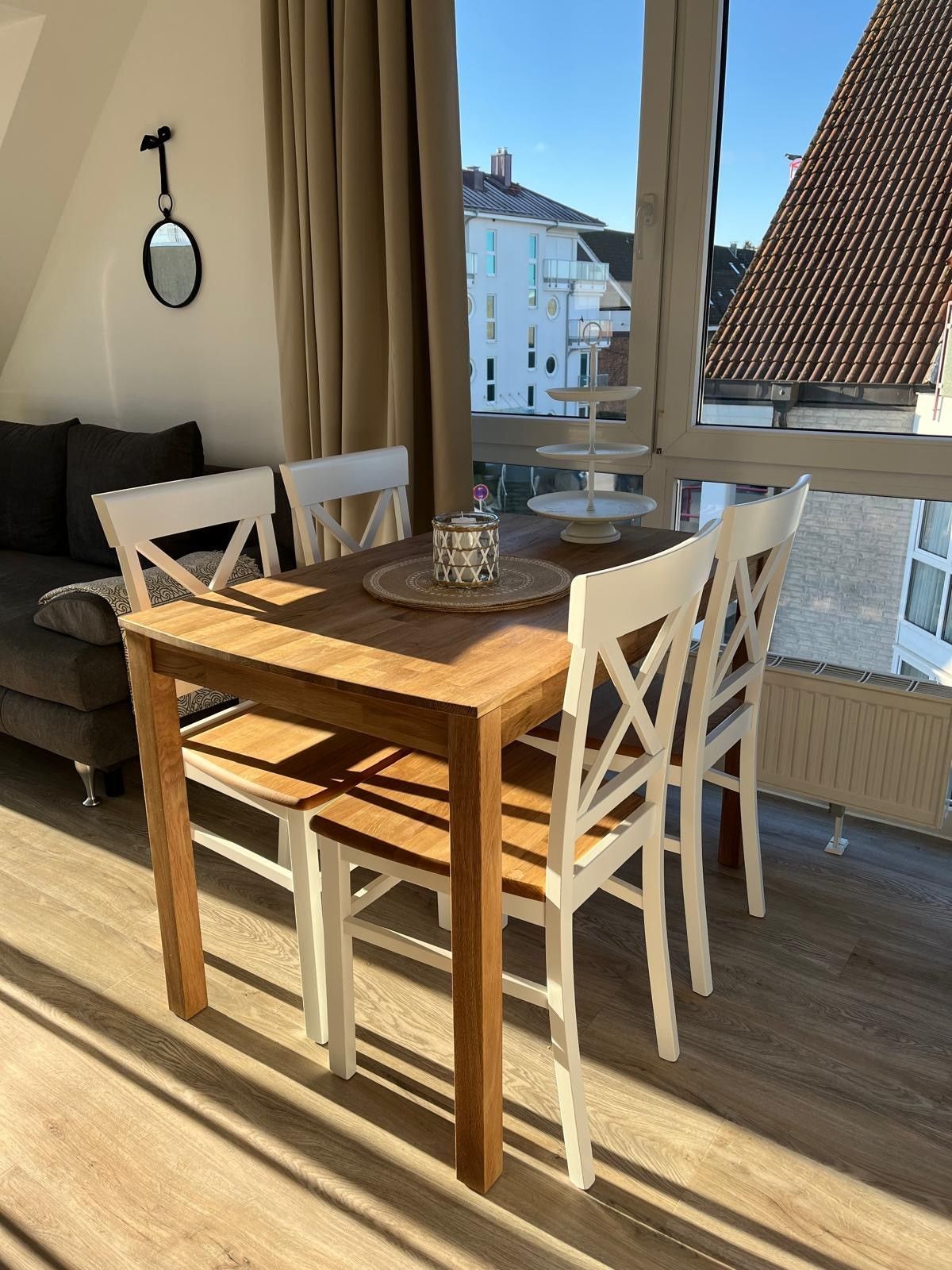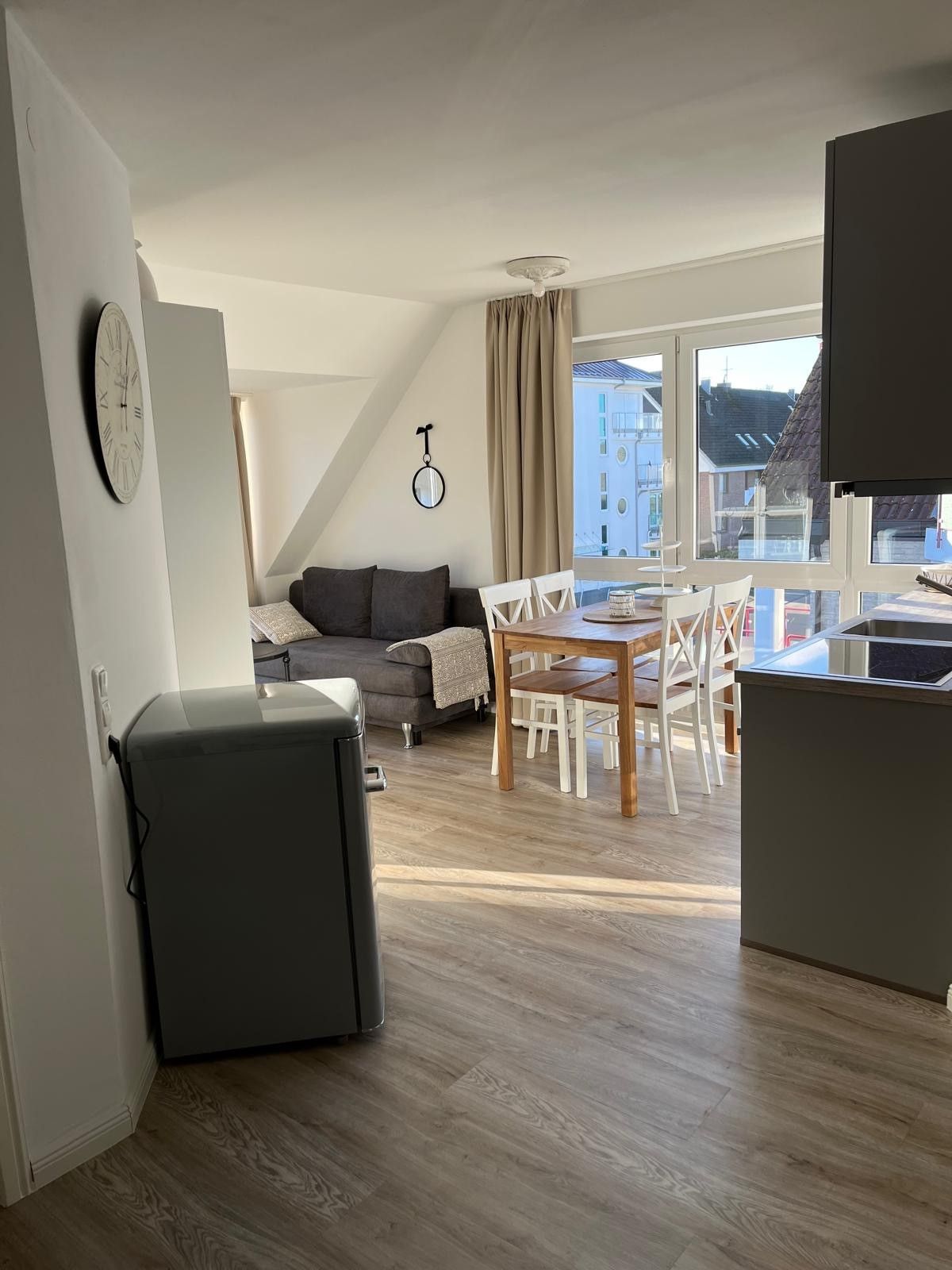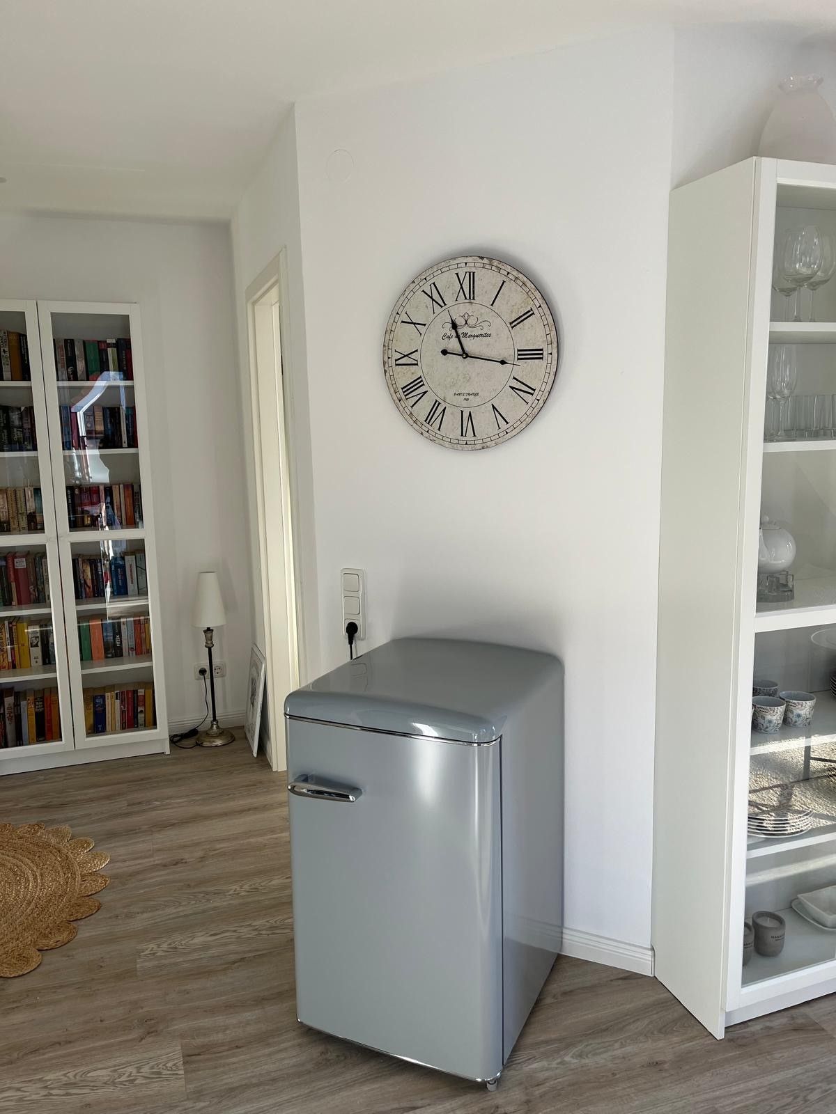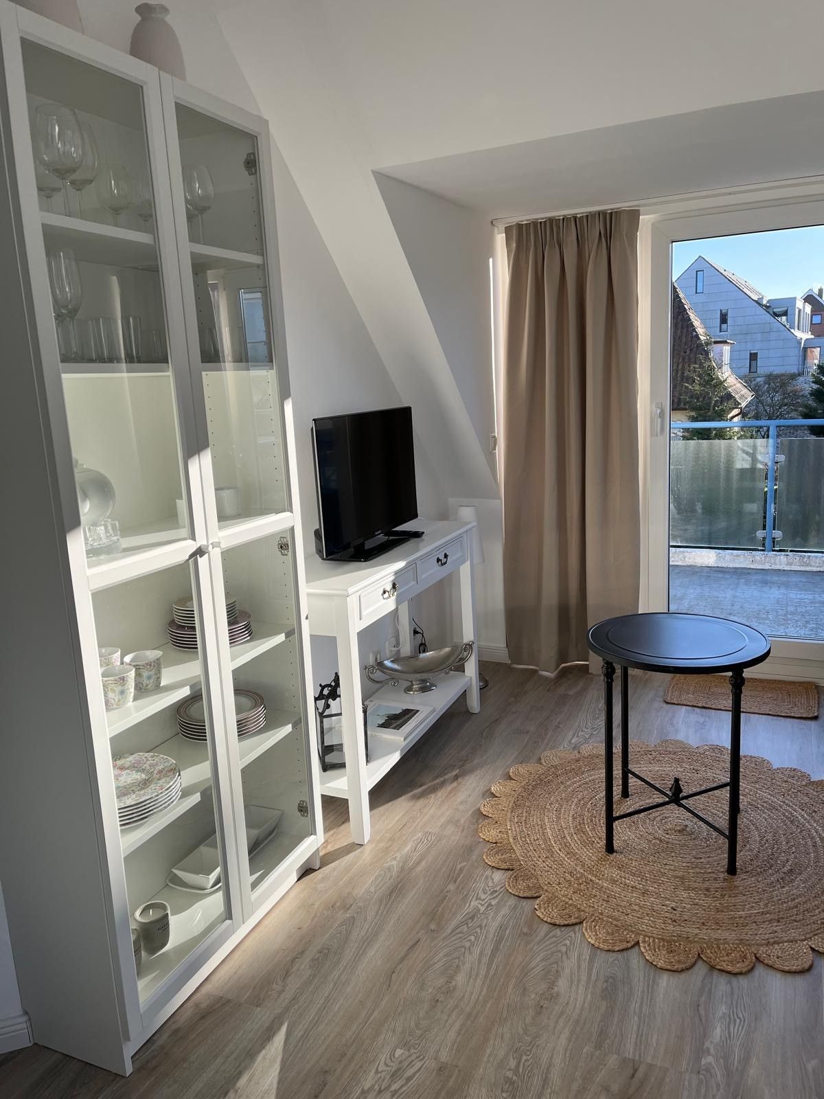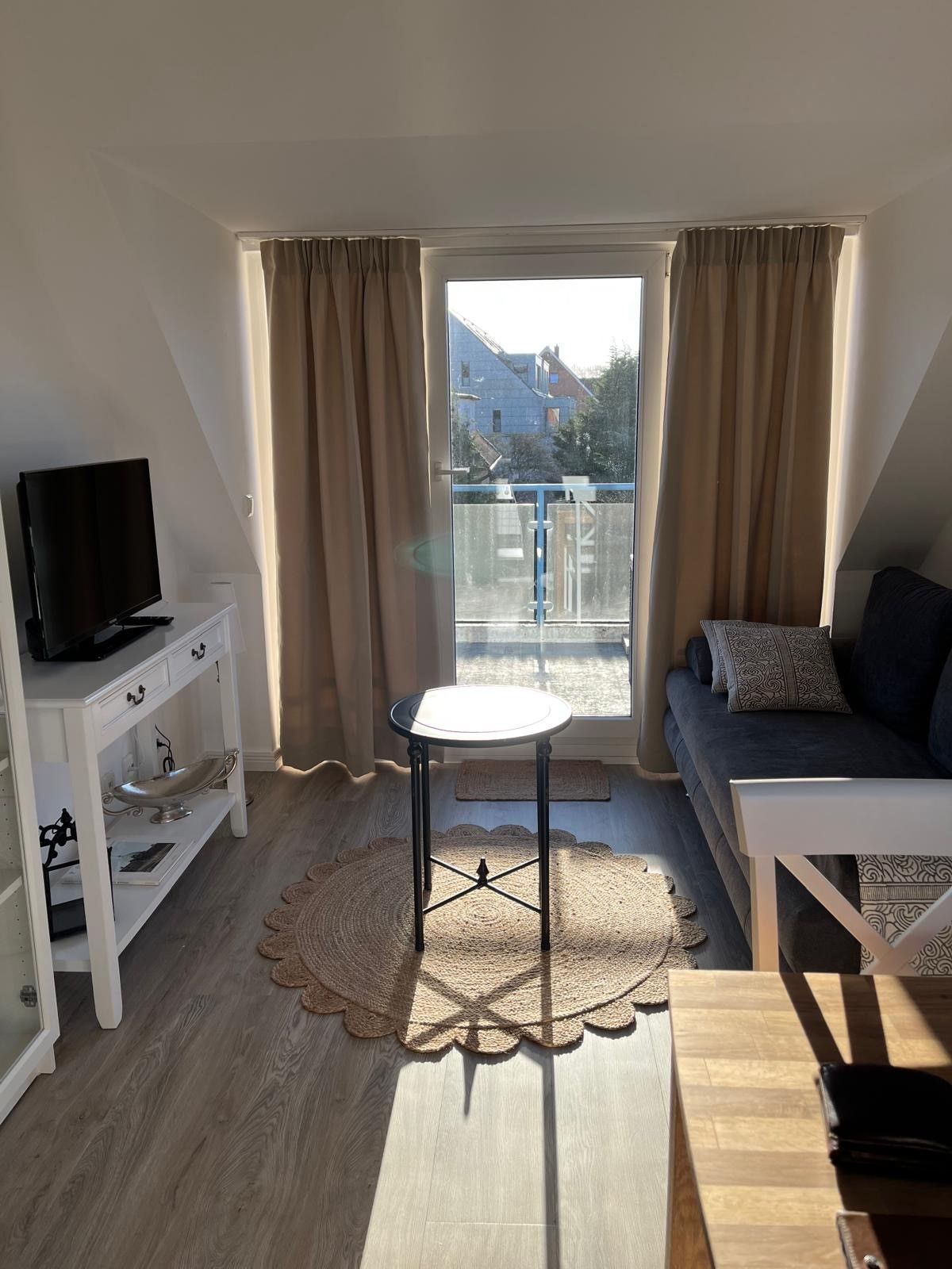 Charmante sonnige 2 Zimmer Wohnung, 36 Quadratmeter, im Landhausstil mit Balkon und Meerblick! Erholung pur! Das Badezimmer ist mit Dusche und WC ausgestattet und hat ein Fenster. Das gemütliche Schlafzimmer verfügt über 2 Einzelbetten 90 x 200 cm, einen Nachttisch und Kleiderschrank. Die offene Einbauküche verfügt über Markengeräte wie Kühlschrank, Backofen, Herd, Geschirrspülmaschine, Umluftabzugshaube, Kaffeemaschine, Toaster sowie Wasserkocher.
