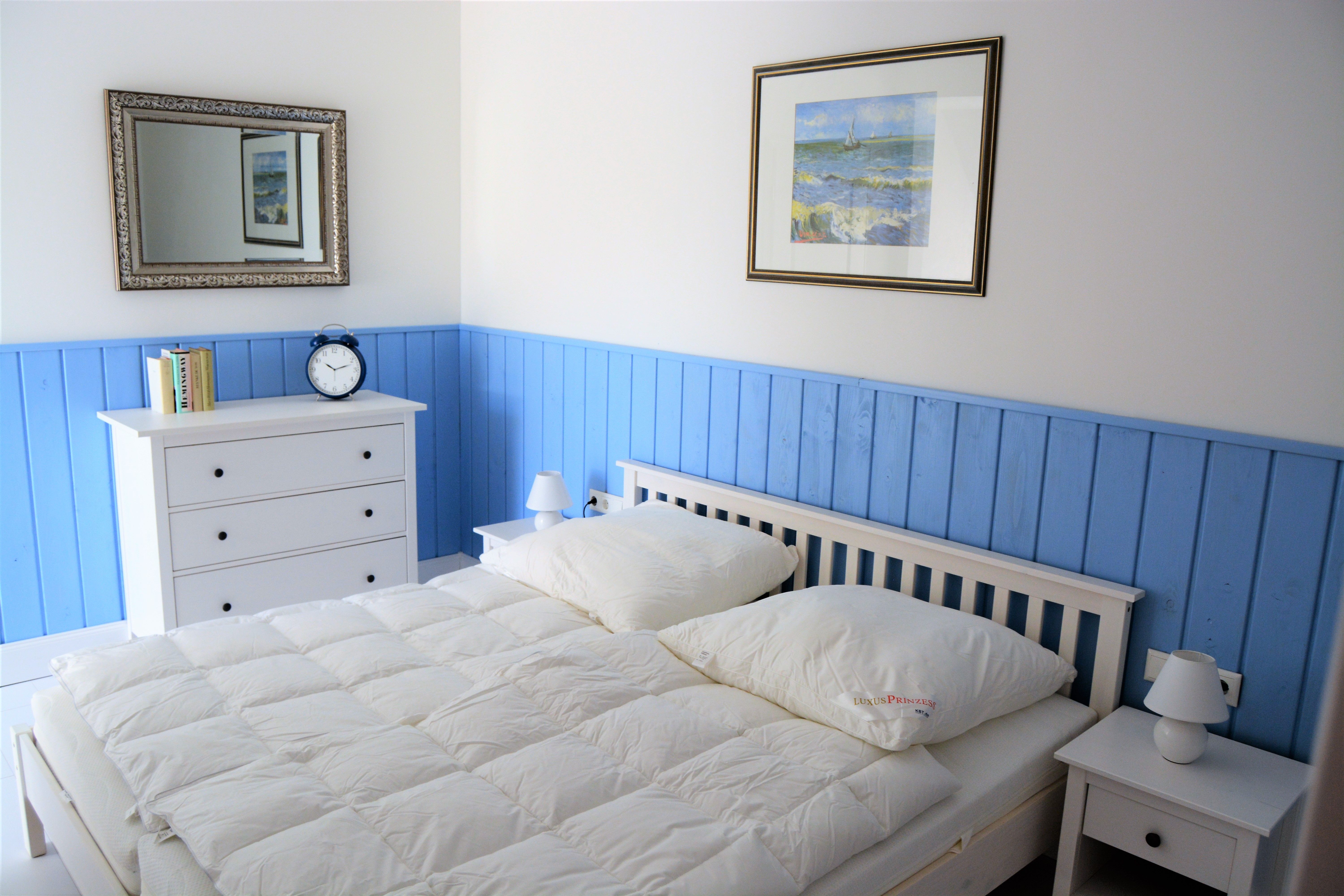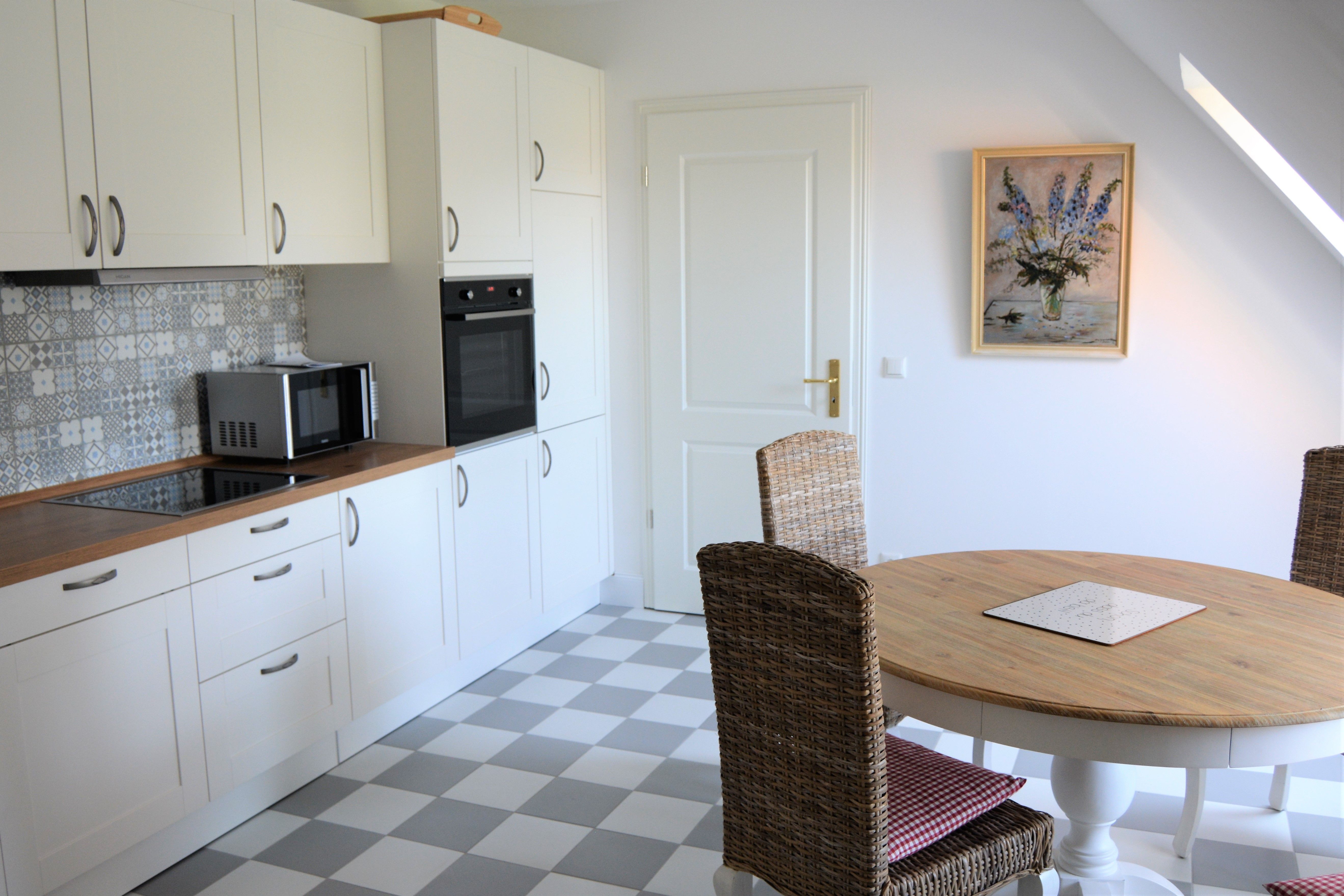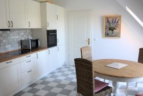 Die Wohnung Kranichhöhe verfügt über Wohnzimmer, Schlafzimmer, Küche mit Essbereich und Bad. Sie ist etwa 70qm groß und bietet bis zu 4 Personen Platz. Die Ausstattung vermittelt maritimen Flair. Highlight ist das Wohnzimmer mit Galerie. Herrliche Blicke auf die Wismarer Bucht und die untergehende Sonne sind quasi garantiert. Die Sonne vermittelt wunderbare Farbspiele im Raum. In der großen Küche mit Essbereich findet sich alles Notwendige und Wünschenswerte: Kühlschrank/Gefrierschrank, Herd und Backofen, Mikrowelle, Kaffeemaschine sowie Wasser- und Eierkocher. Weitere technische Ausstattungsmerkmale sind: WLAN, Fernseher, Radio und CD-Player. Im Garten gehört eine Strandkorb-Gruppe zur Wohnung.