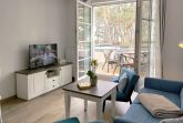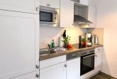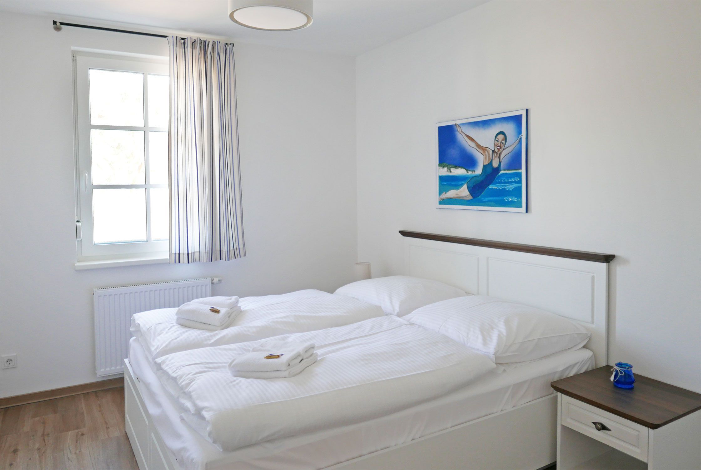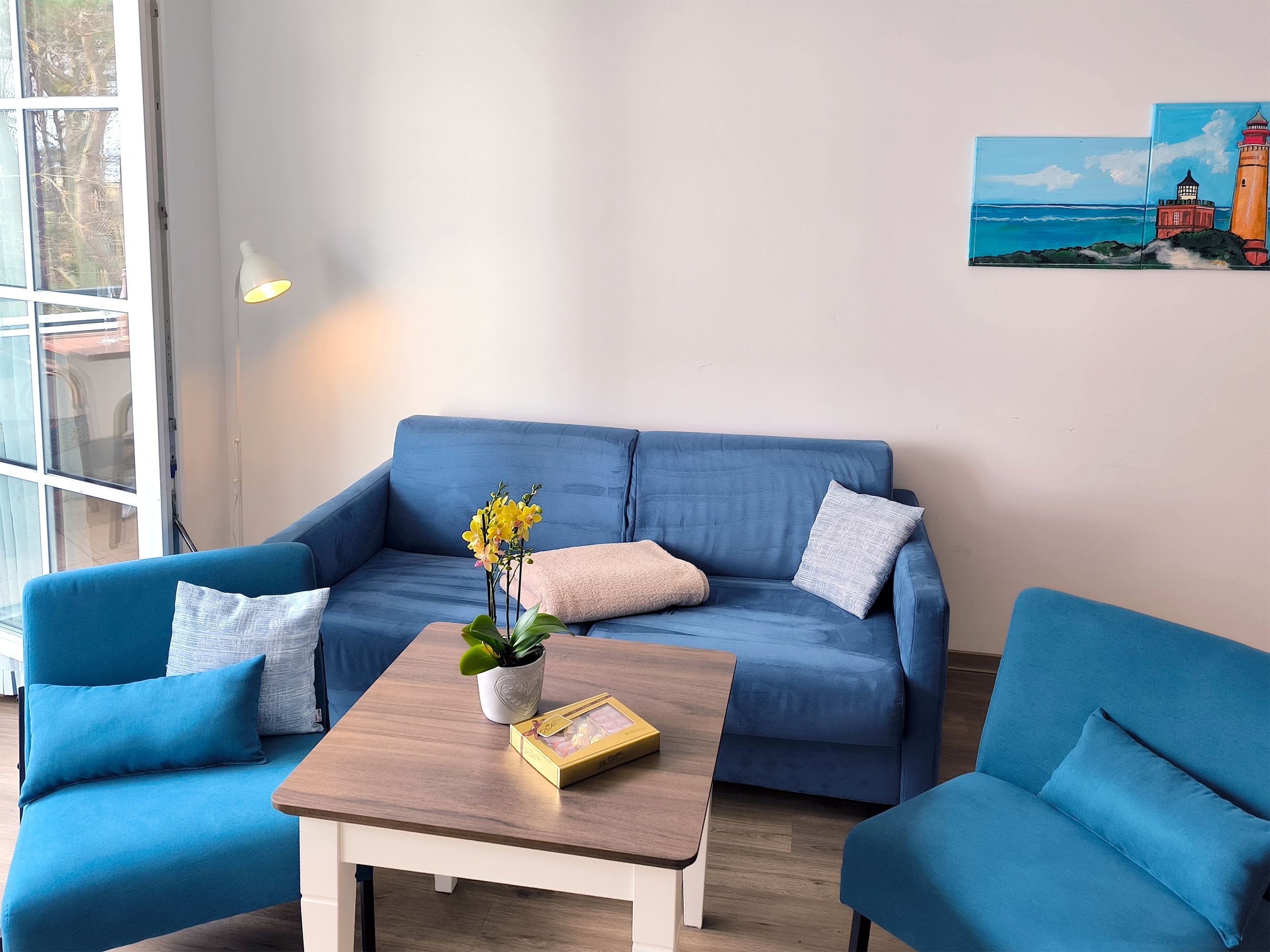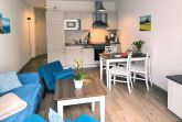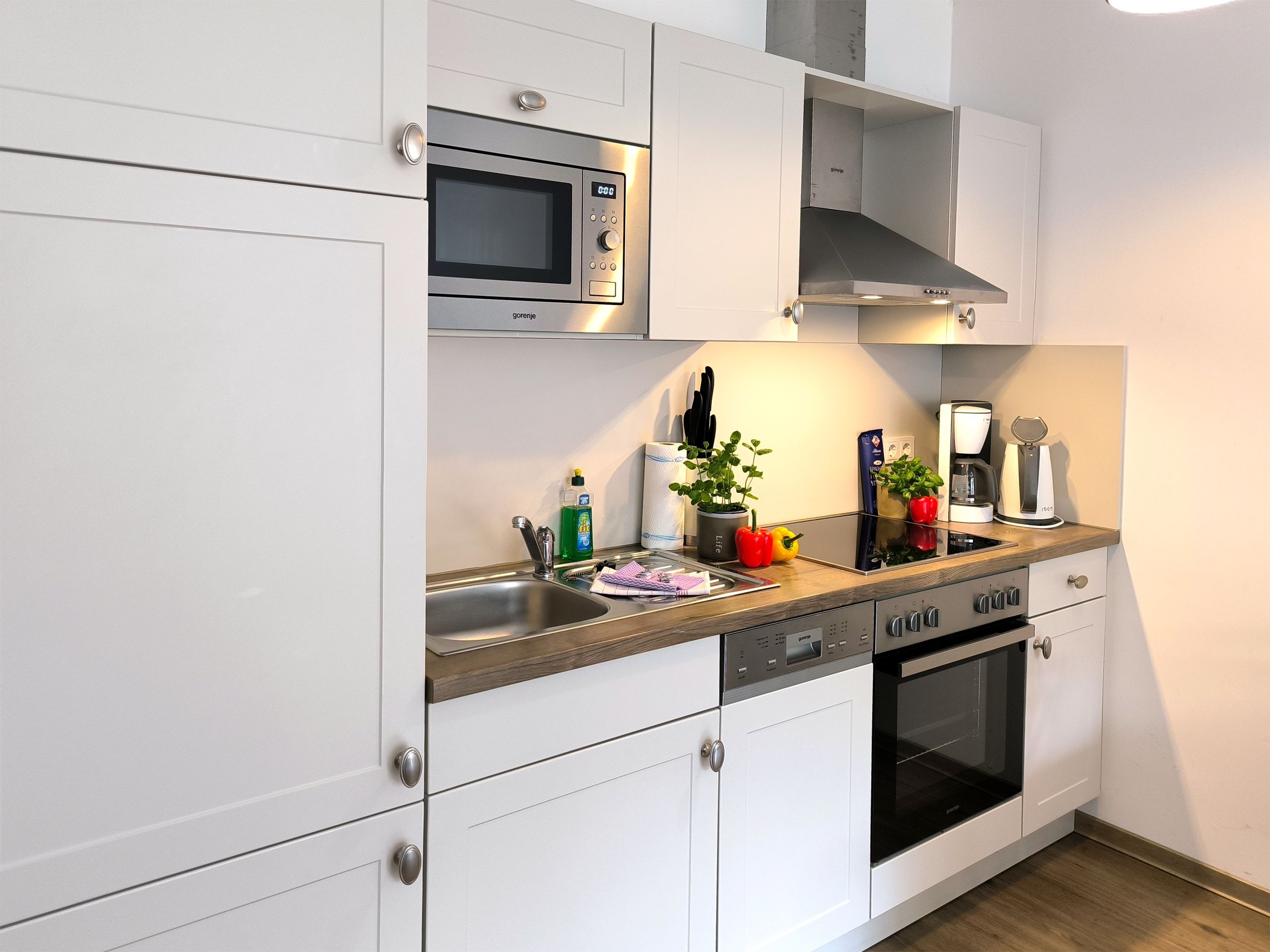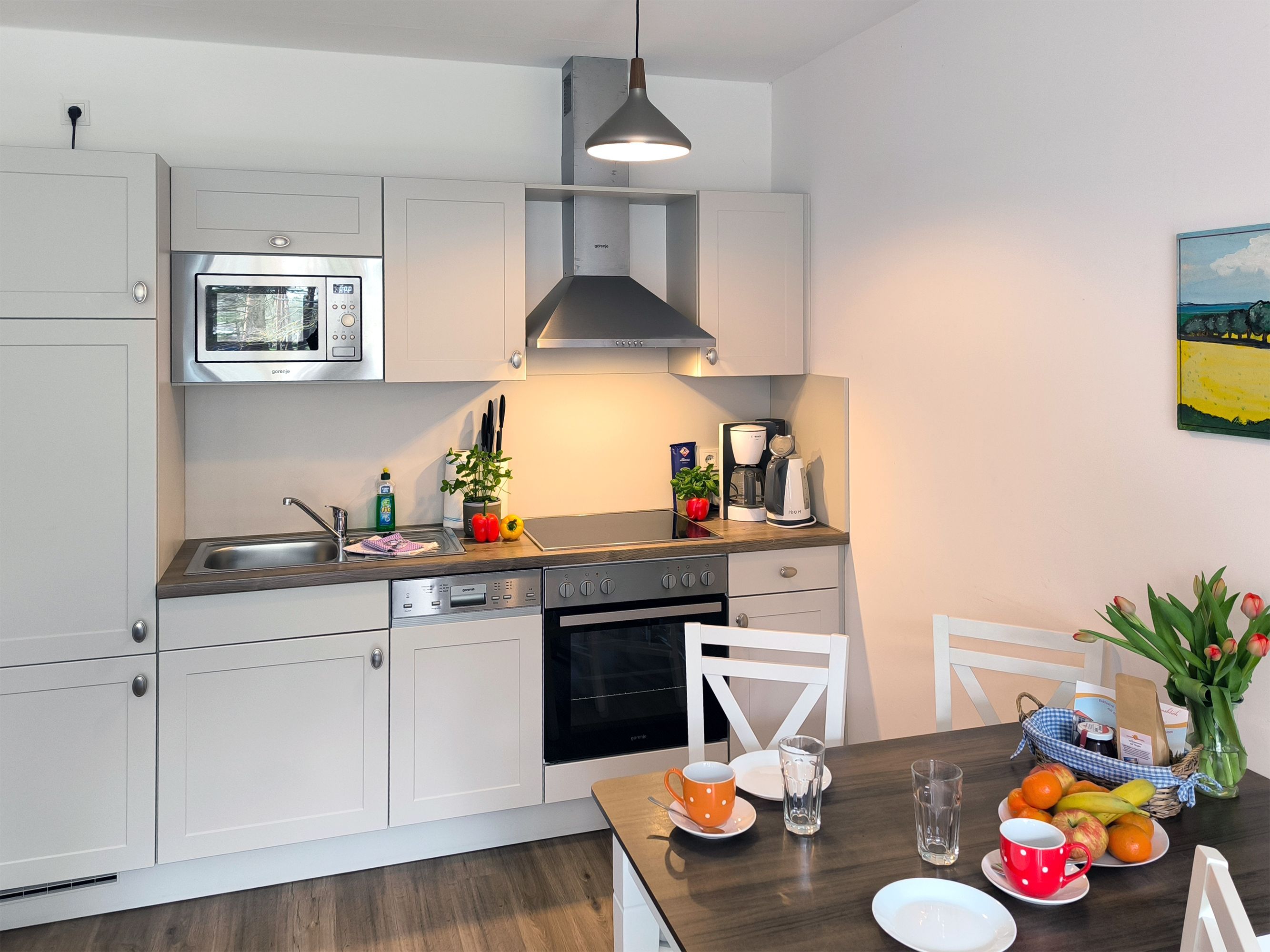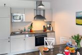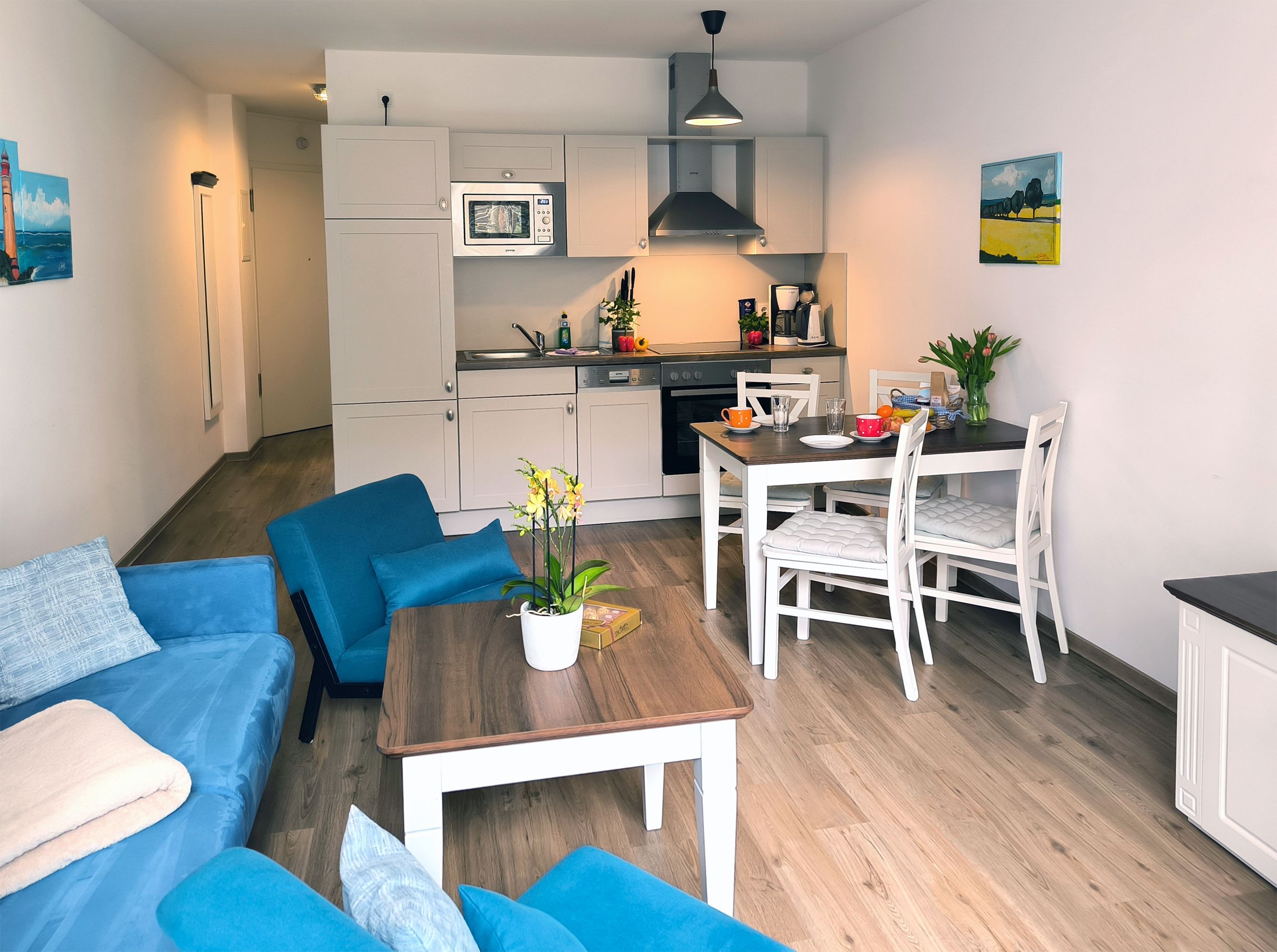 Eine helle freundliche 2 Zimmer Ferienwohnung mit geweißten Holzmöbeln und einen gemütlichen und hochwertigen Schlafsofa. Es gibt einen voll ausgestattete Küchenzeile mit allem was dazu gehört wie Geschirrspülmaschine und Backofen.