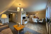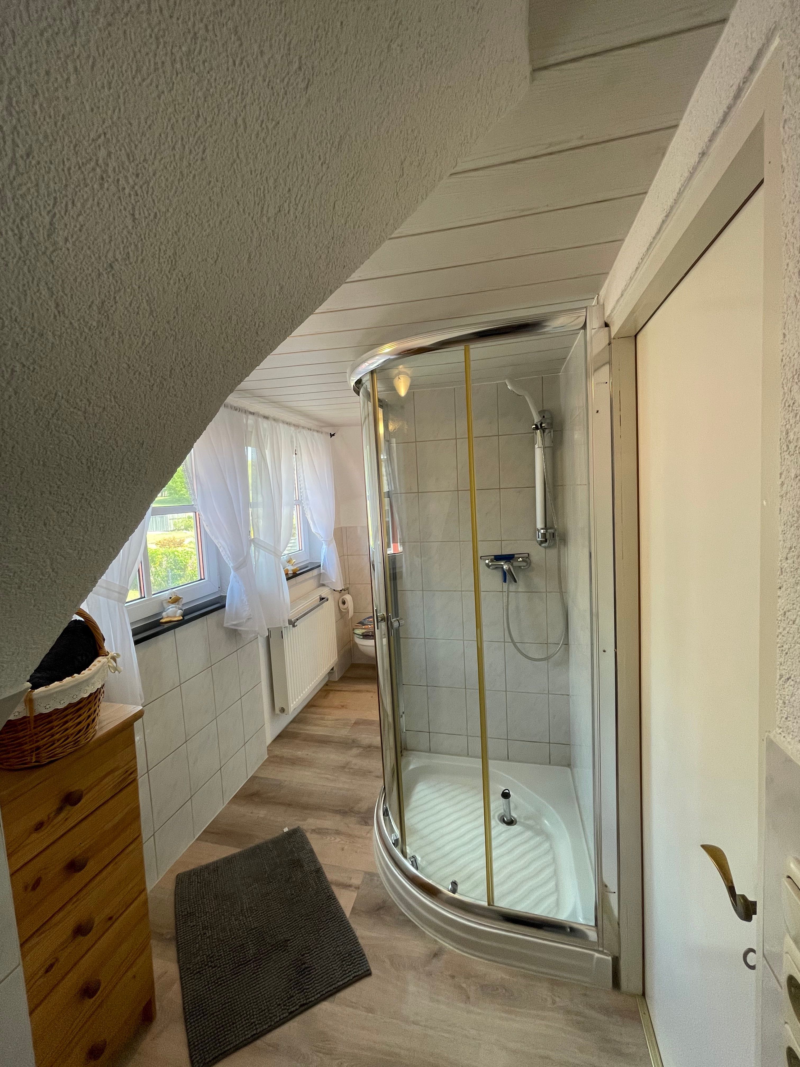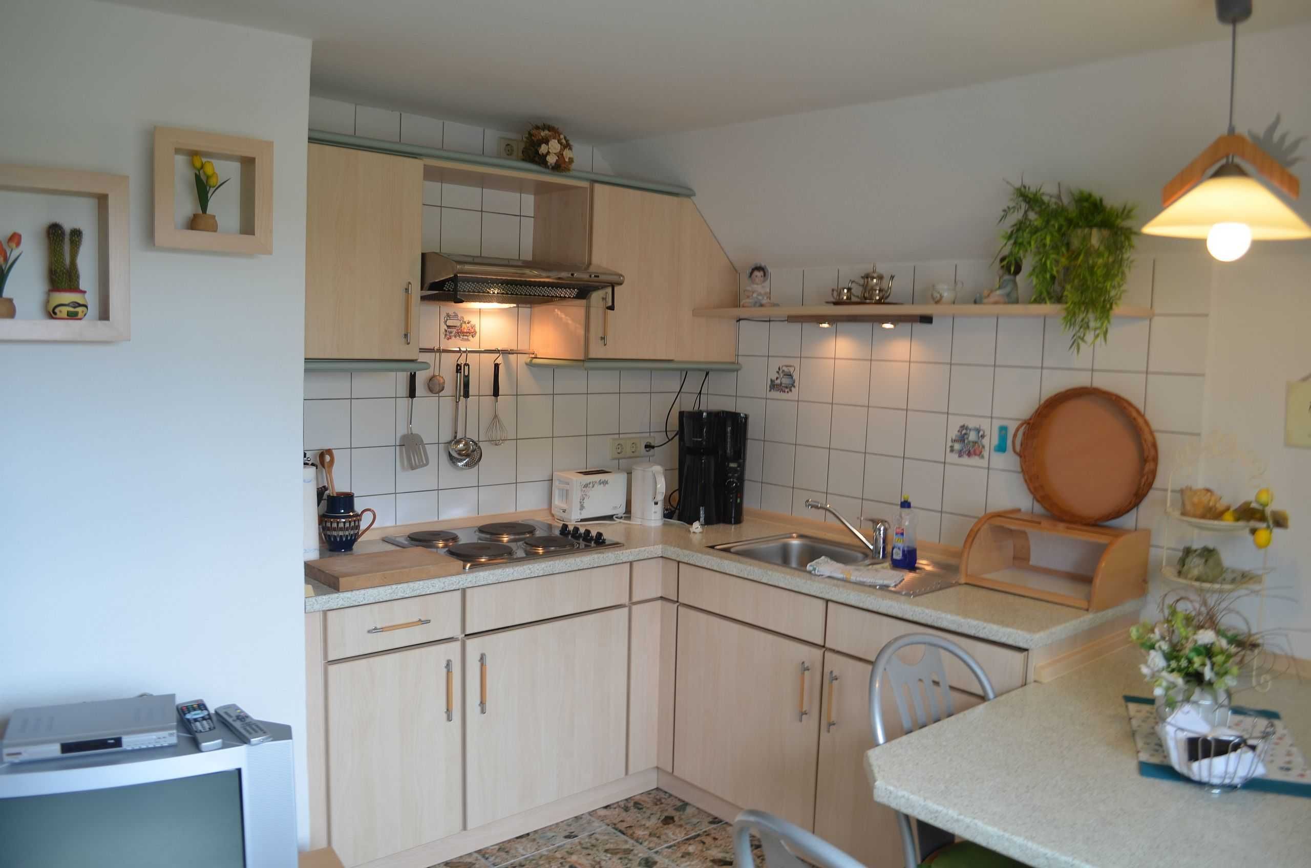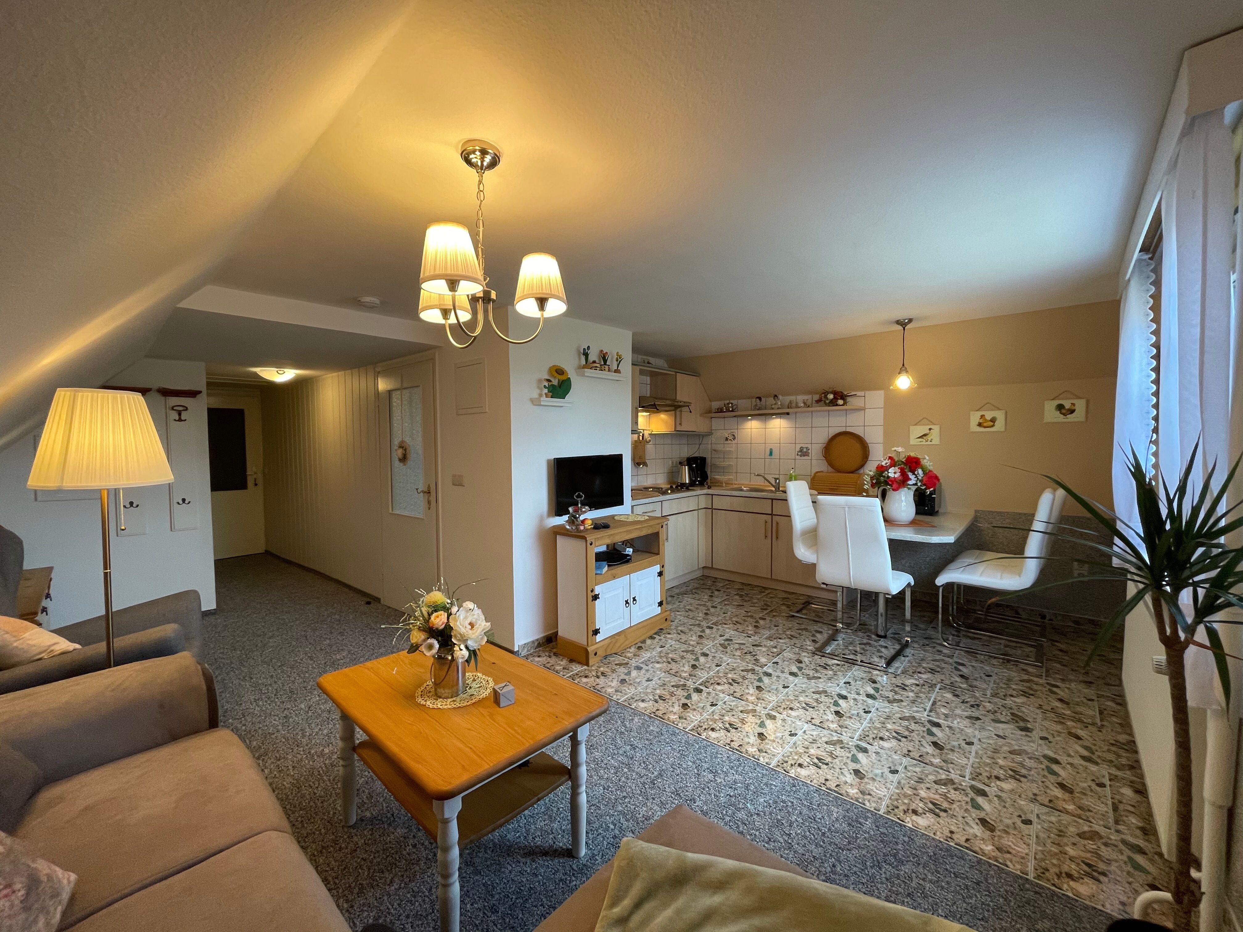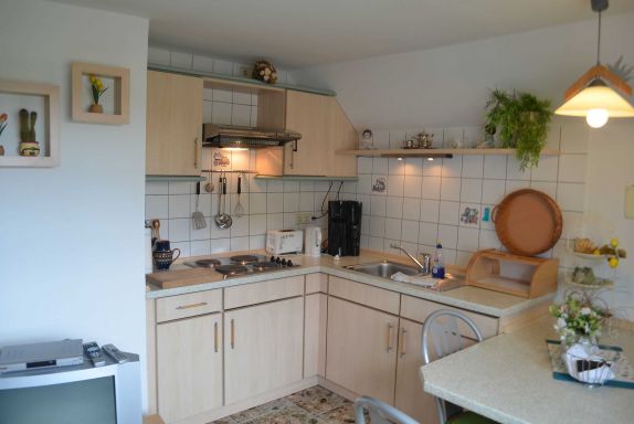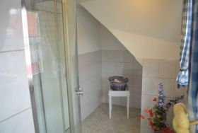 Die gemütliche Ferienwohnung (Nichtraucher) bietet mit seinen ca. 34 qm ausreichend Platz für 2-3 Personen. Der Wohnbereich umfasst eine gemütliche Couchecke (Aufbettung für 3.Person) mit Couchtisch ein Sideboard mit Radio und TV-Gerät. Die angrenzende Einbauküchenzeile mit Essecke bietet Ihnen ein 4 Platten-Herd, Abzugshaube, kleinen Backofen, Spüle, Kaffeemaschine, Wasserkocher, Toaster sowie diverse Küchenutensilien. Das Schlafzimmer verfügt über ein Doppelbett mit Nachtischkonsolen und einen Kleiderschrank. Das geflieste Tageslichtbad verfügt über eine Dusche, WC, Waschtisch und einen Fön. WLAN inkluisve. Die bestuhlte Gemeinschaftsterrasse lädt zum Verweilen ein. Das separate und gemütliche Blockhaus auf dem Grundstück der Vermieter, steht allen Gästen der Pension zur Verfügung. Ein gemütlicher Grillabend findet in der Saison 1 x wöchentlich zusammen mit dem Vermieter statt. Genauere Informationen erhalten Sie vor Ort. Auf Anfrage können Sie vor Ort ebenfalls den Brötchenservice in Anspruch nehmen sowie das Frühstück p.P. für 7,00 Euro dazu buchen. Bis 14 Tage vor Anreise können Sie die Erstausstattung eines Wäschepaketes für 6,00 Euro p.P. dazu buchen bzw. durch eigene ergänzen. Haustiere sind nicht erlaubt.